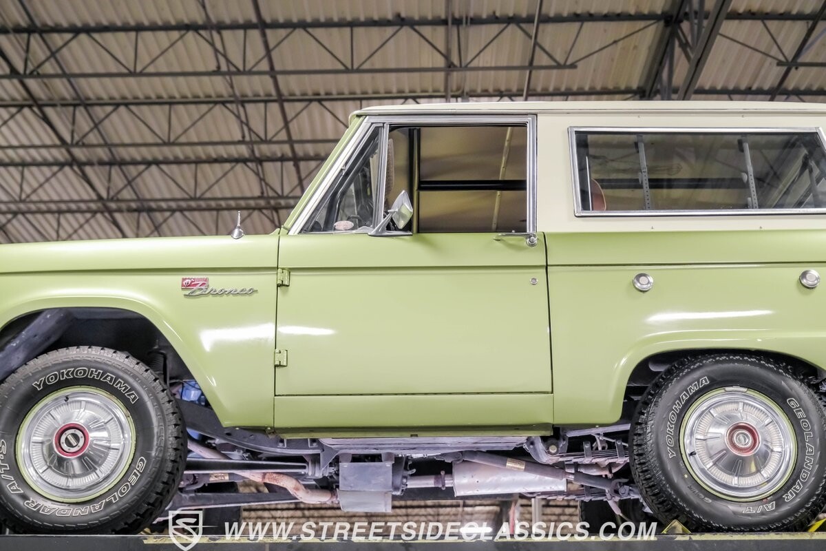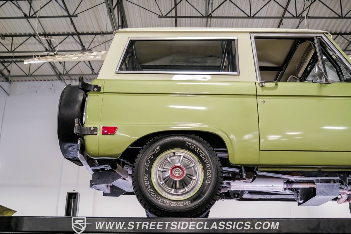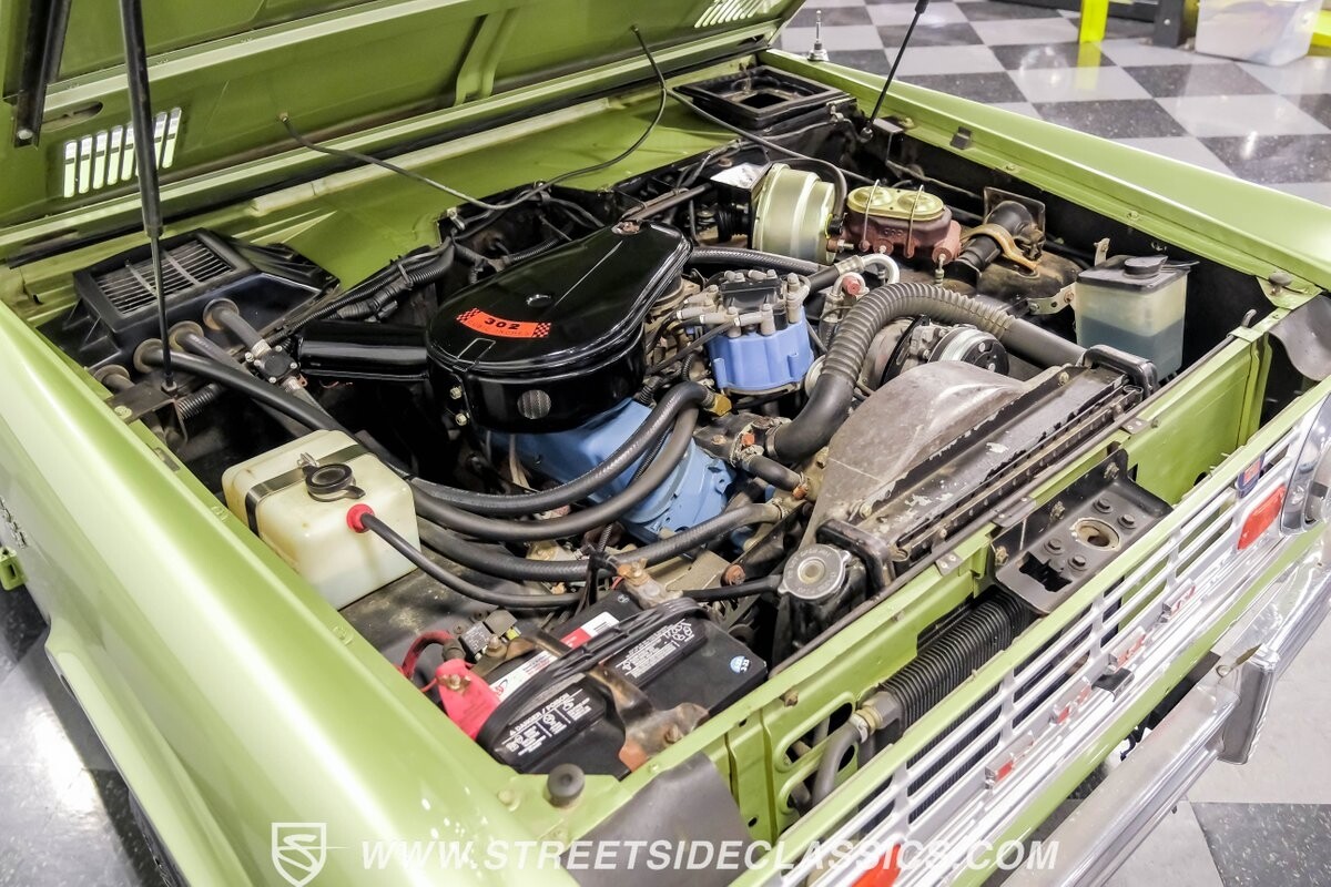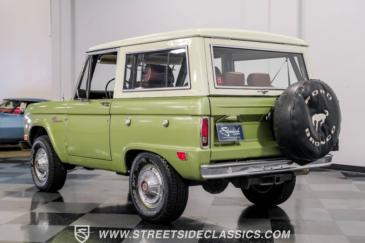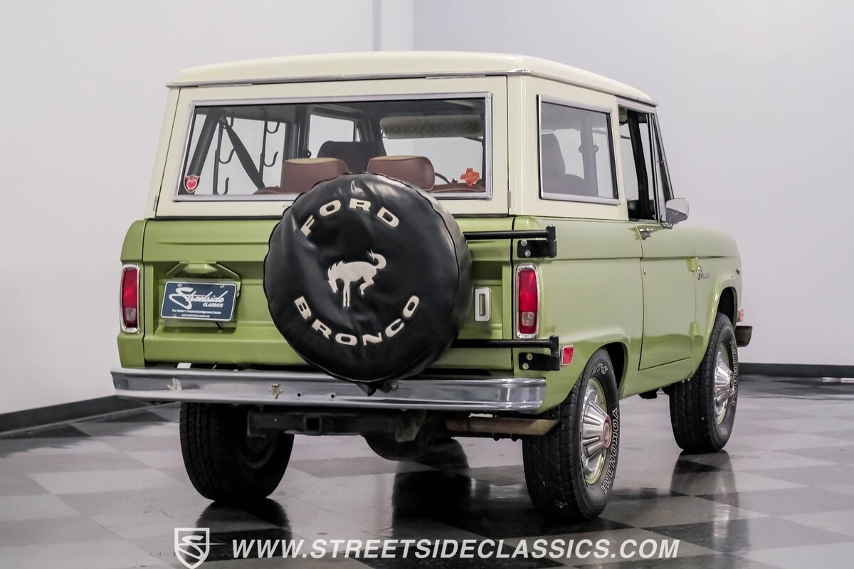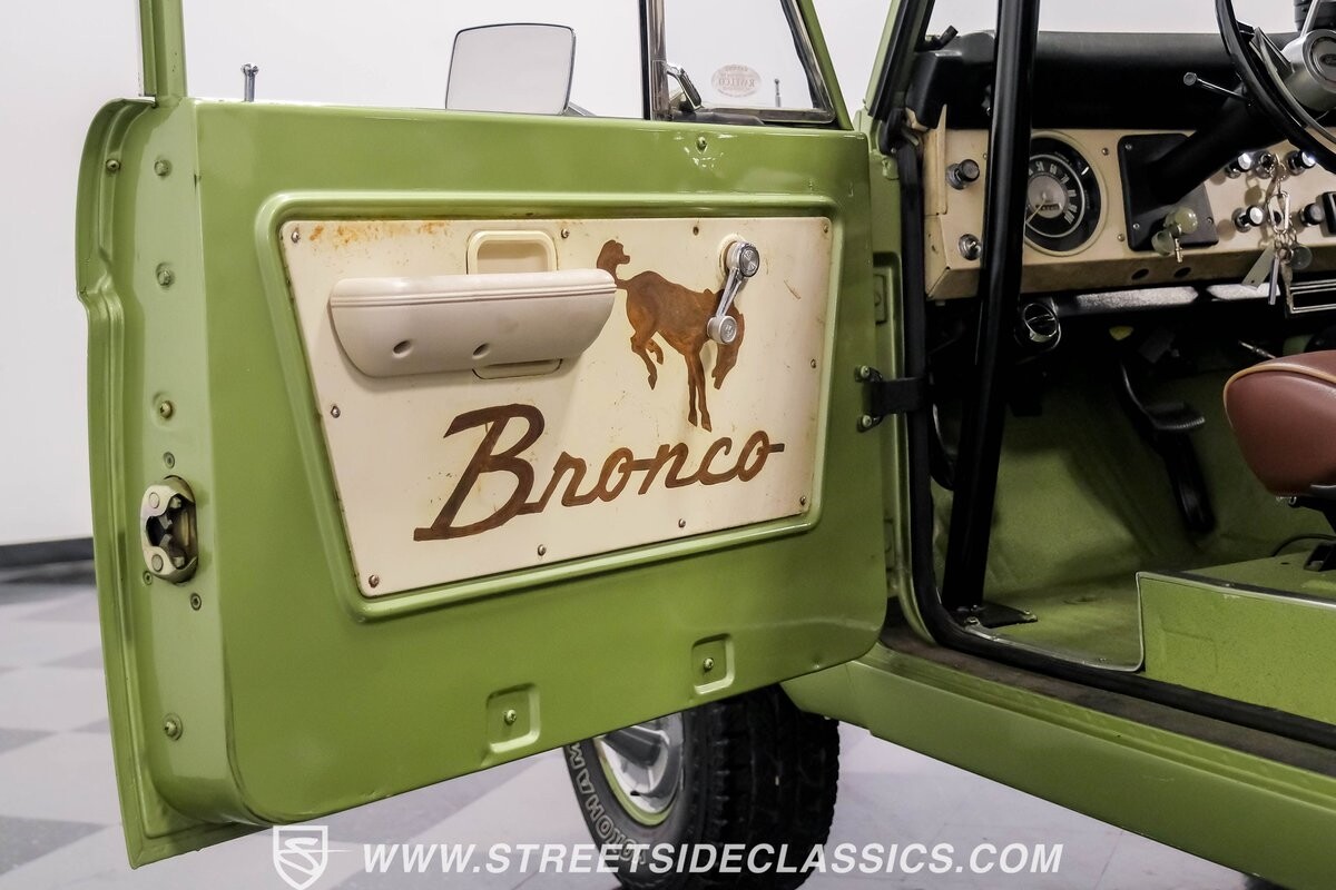 More popular than ever, the Ford Bronco is an American 4x4 icon. This handsome 1968 Bronco Sport has had its body stripped and refinished in a very appealing shade of Lime Gold Metallic, with a removable hardtop painted in white. Exterior details include uncut fenders, stock hubcaps, KC "HiLiTES" LED headlights, LED taillights, dual side mirrors, a receiver hitch and a 50th anniversary grille emblem. The spare is covered with a Bronco logoed cover and affixed to a swing-away rear tire carrier, allowing more interior space. The 15" steel wheels are painted to match the body and wear stock polished covers and 235/75 Yokohama Geolandar A/T-S tires adding to the original classic look of this early Bronco retains.