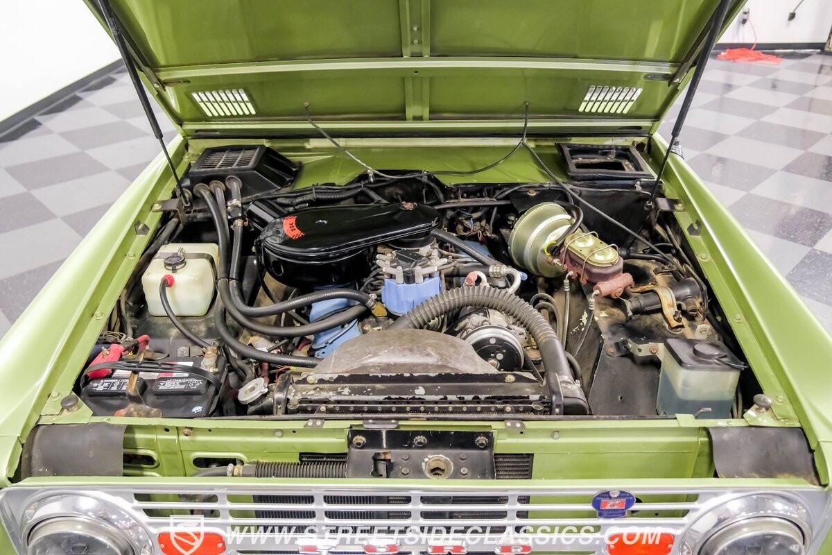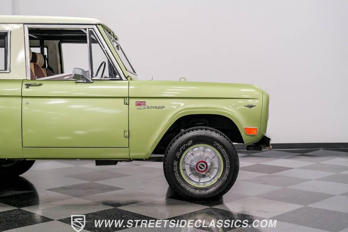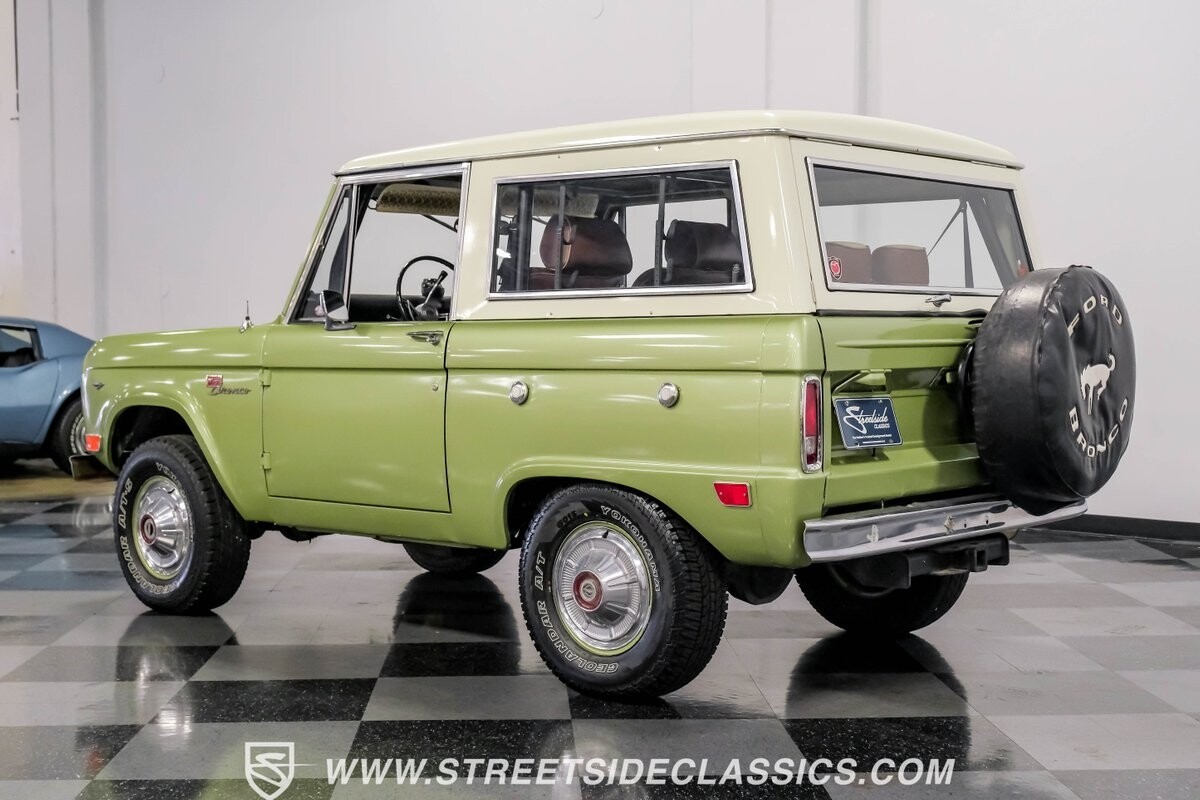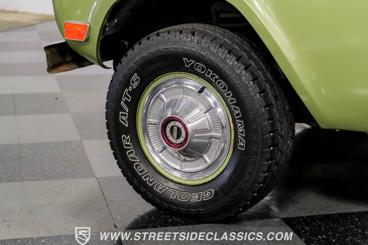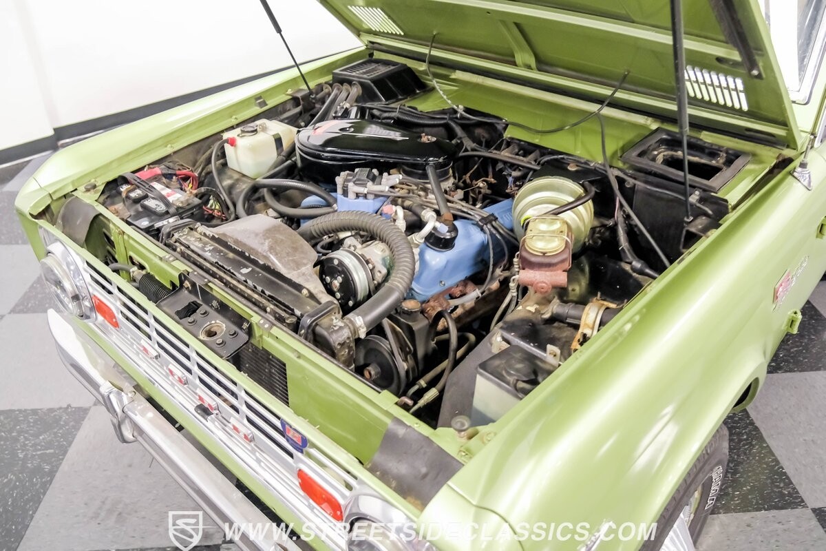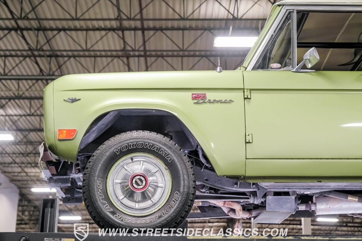 More popular than ever, the Ford Bronco is an American 4x4 icon. This handsome 1968 Bronco Sport has had its body stripped and refinished in a very appealing shade of Lime Gold Metallic, with a removable hardtop painted in white. Exterior details include uncut fenders, stock hubcaps, KC "HiLiTES" LED headlights, LED taillights, dual side mirrors, a receiver hitch and a 50th anniversary grille emblem. The spare is covered with a Bronco logoed cover and affixed to a swing-away rear tire carrier, allowing more interior space. The 15" steel wheels are painted to match the body and wear stock polished covers and 235/75 Yokohama Geolandar A/T-S tires adding to the original classic look of this early Bronco retains.