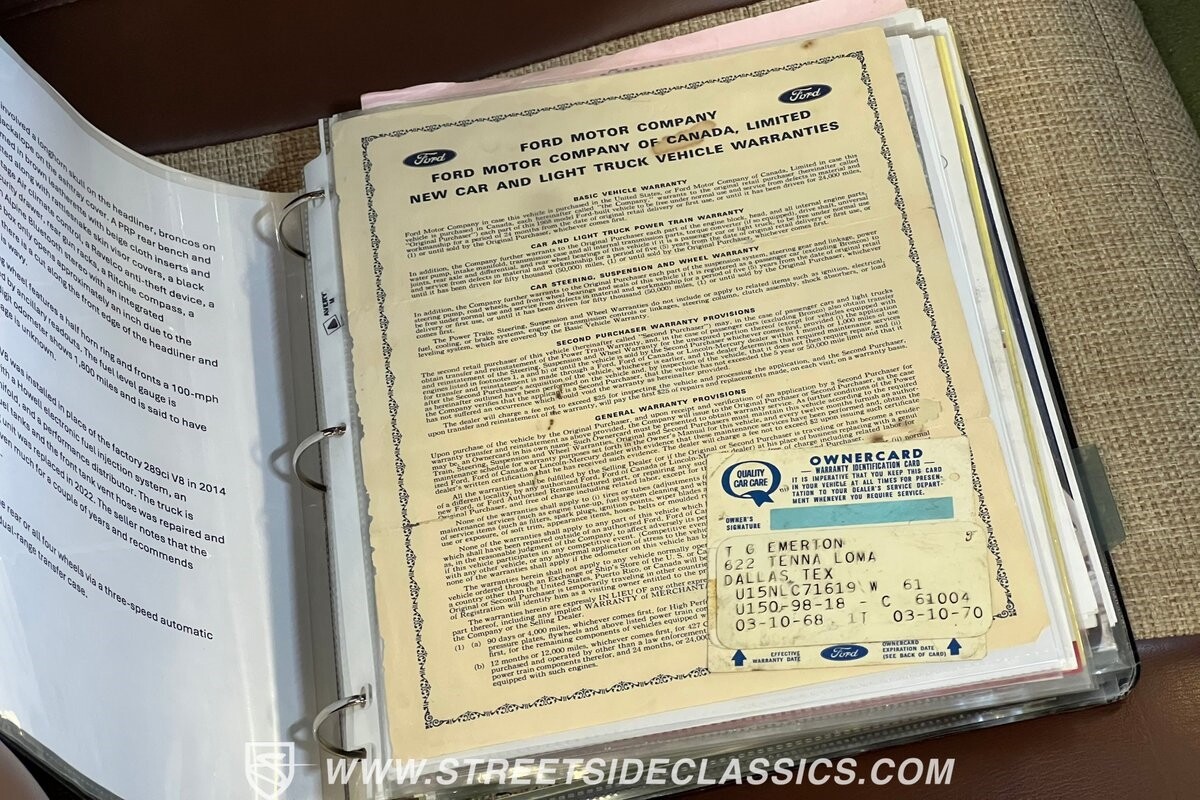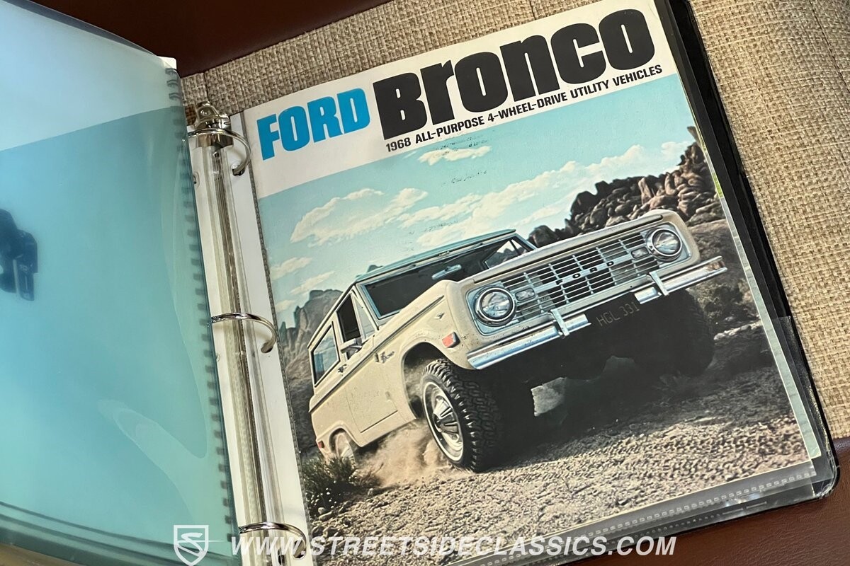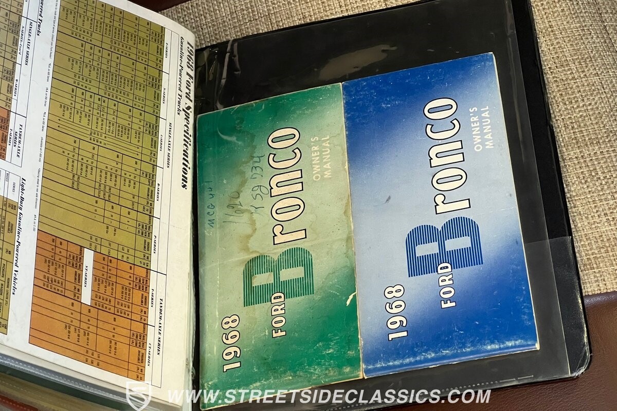 Included with this classic Bronco is a binder full of manufacturer's literature, service records, owner's manuals, original warranty and warranty card and service manuals. This is a great 1968 Bronco Sport 4x4 with just the right upgrades added without sacrificing its original character. Call today!