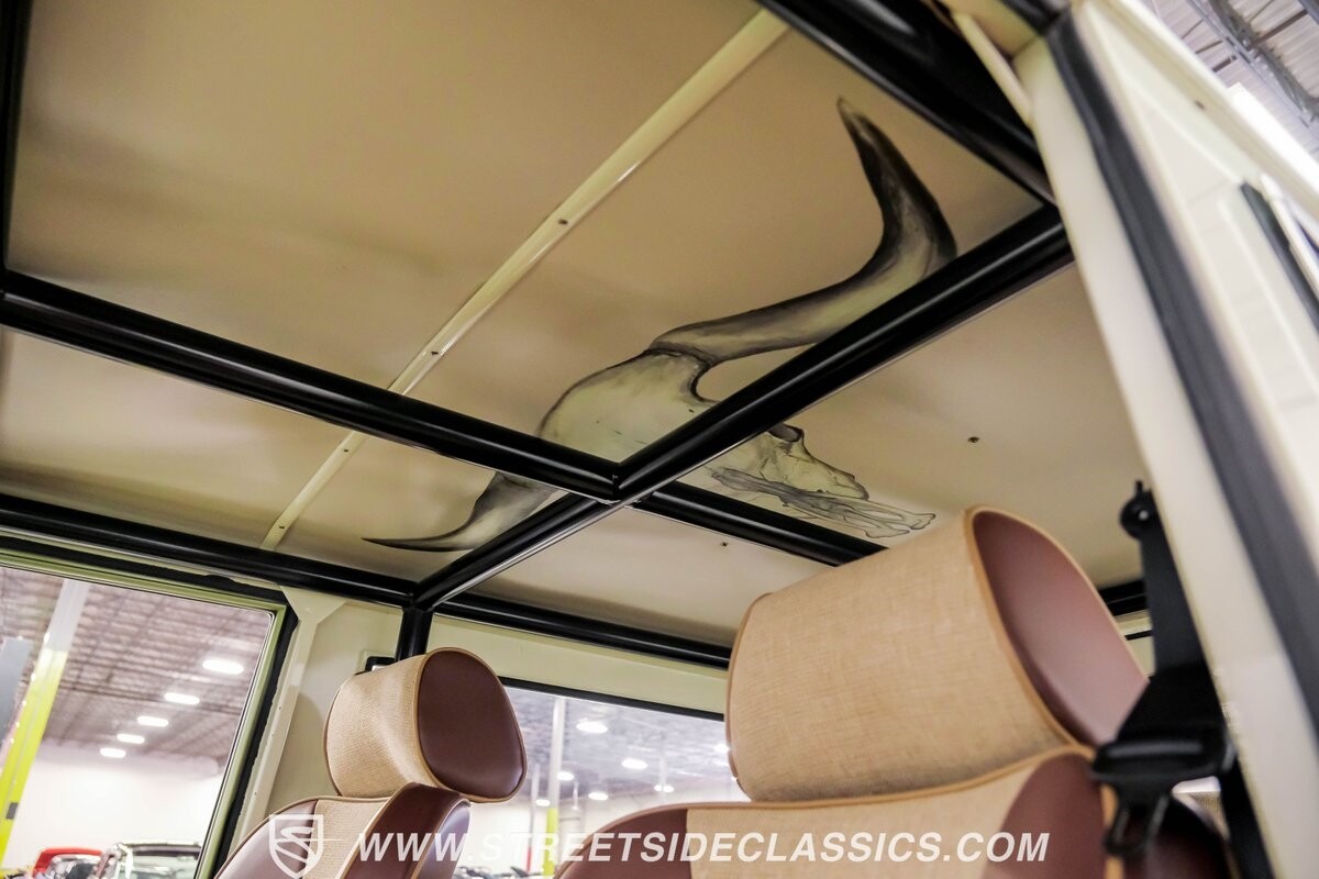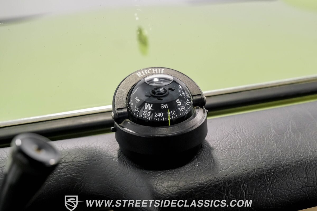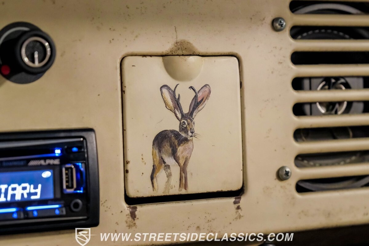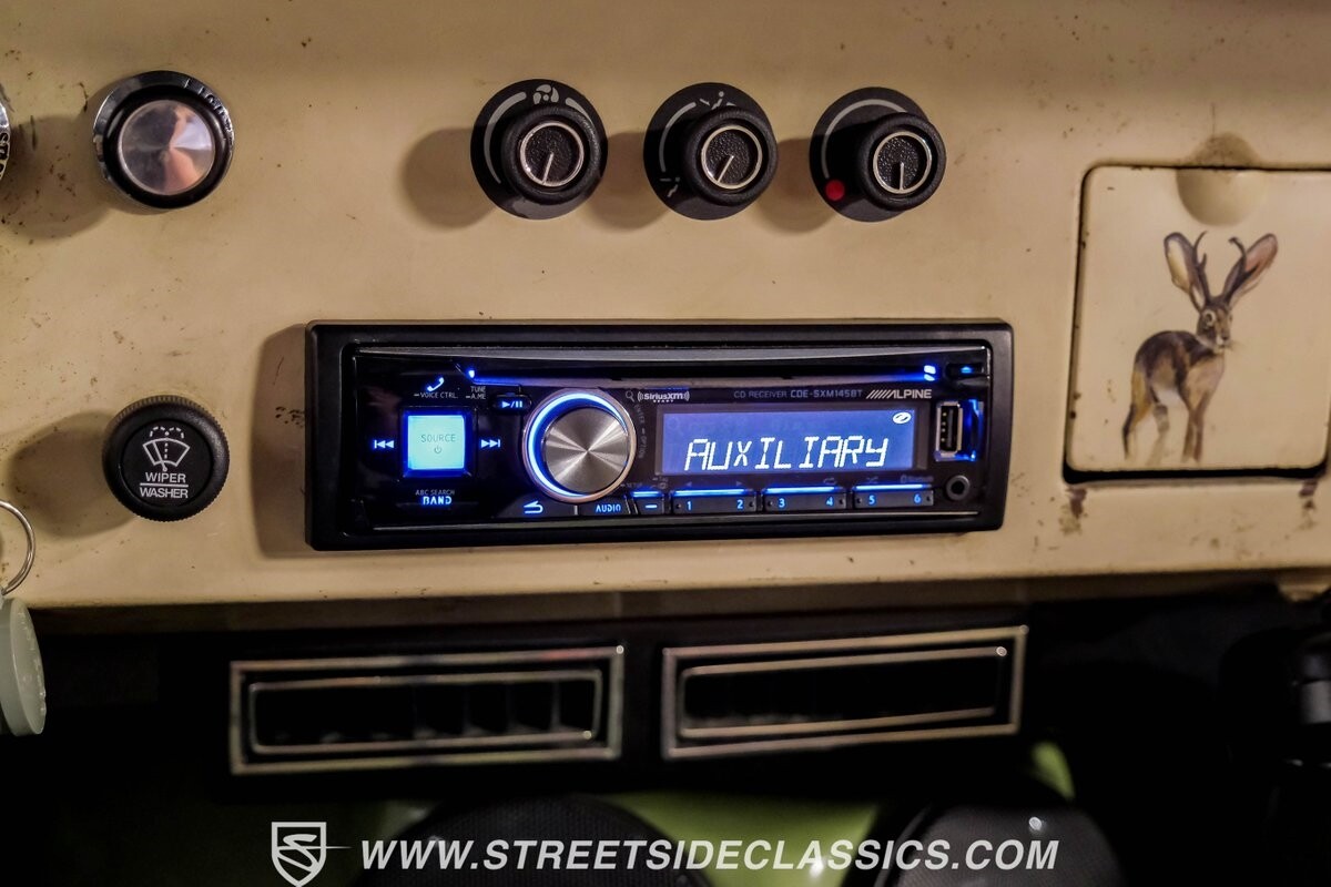 Inside, the floorboards are coated with heat-resistant paint and Rhino Lining textured material and the interior metal surfaces were repainted to match the exterior along with a custom front speaker enclosure. Paintwork includes a longhorn skull on the headliner, broncos on the door panels and a jackalope on the ashtray cover. A PRP rear bench and front bucket seats trimmed in brown leatherette with beige cloth inserts and tan piping have been fitted along with rattlesnake skin visor covers, a black Bailie Bilt roll cage, Vintage Air cold air conditioning, a Ravelco anti-theft device, a Tuffy conceal carry security drawer, rear gun racks, a Ritchie compass, a Cobra CB radio, and an Alpine Bluetooth stereo with an integrated microphone.