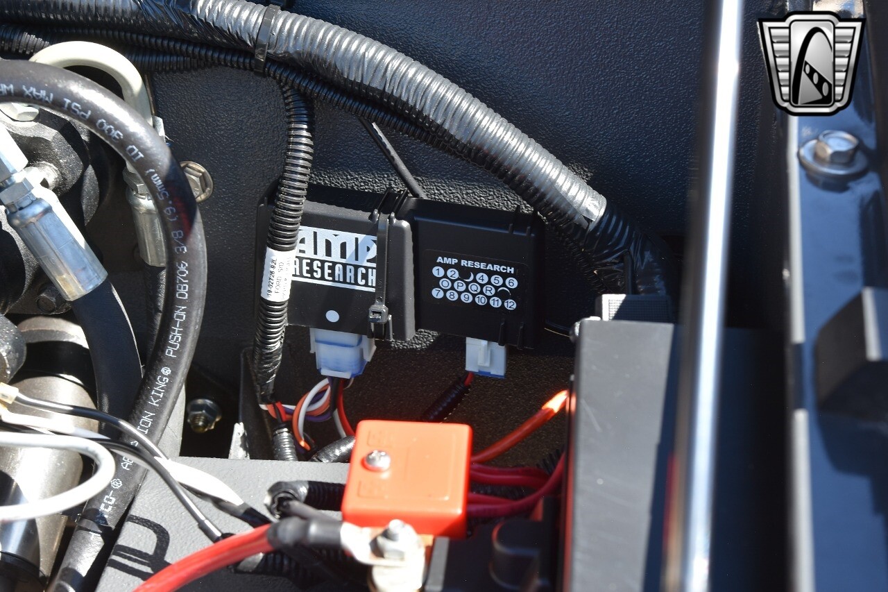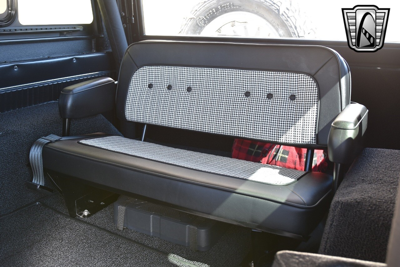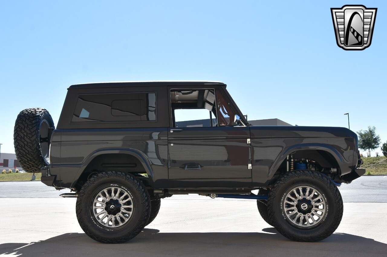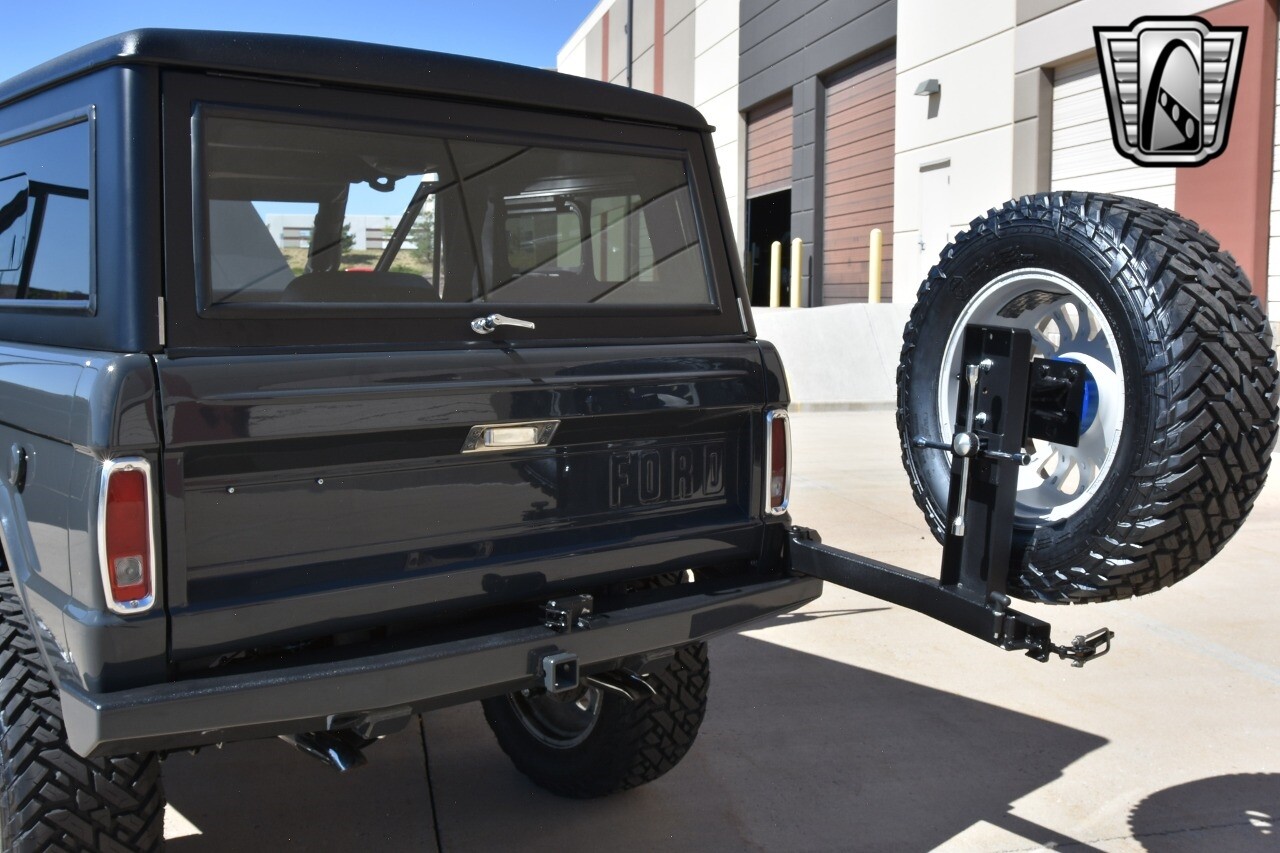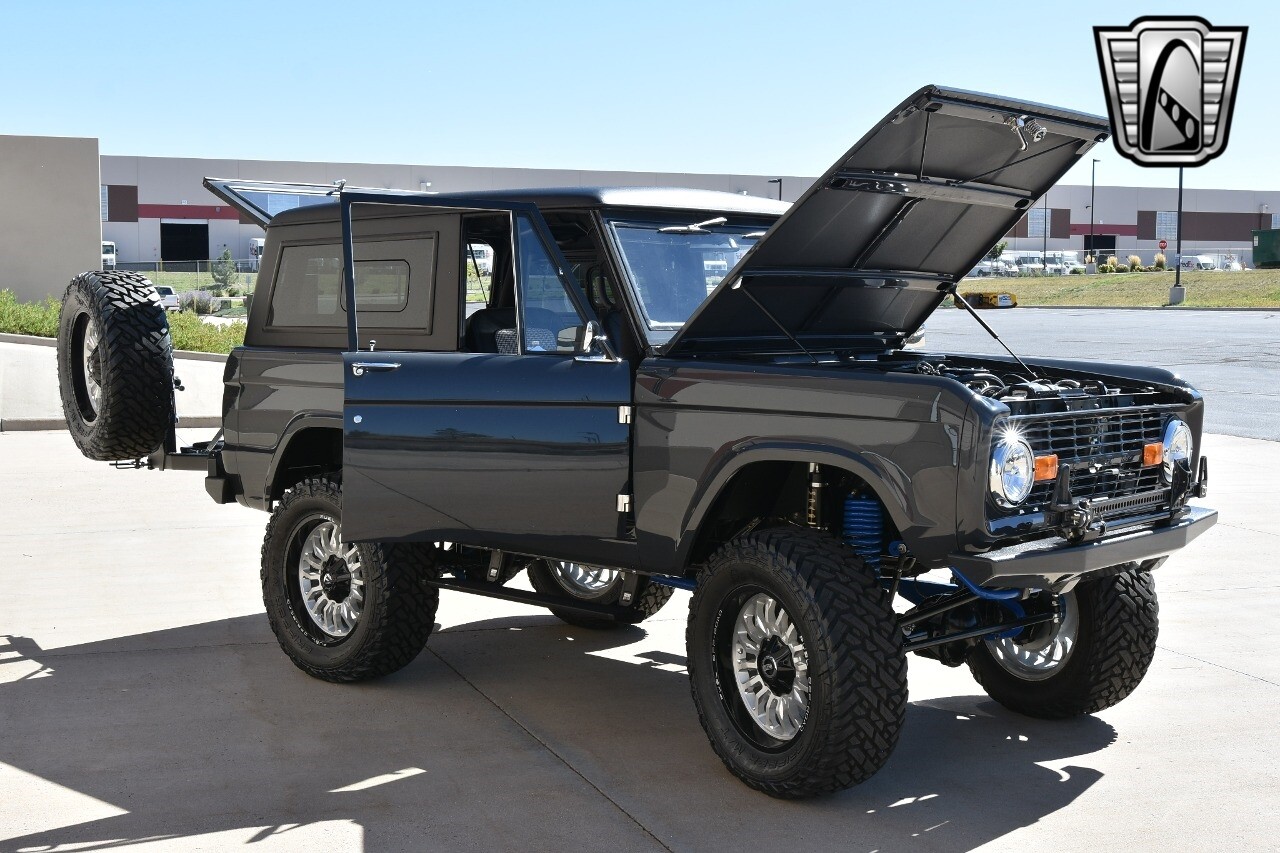 This 1977 early Ford Bronco has undergone a 2-year, body-off rotisserie restoration by Carmichael. This one-off vintage SUV is powered by a 5.0-liter Coyote engine mated to a 6R80 6-speed transmission. The engine house was enlarged for easier serviceability. This 410 torque, 435hp-producing engine is paired to a refreshed Dana 44 axle and a 9-inch rear axle with posi-traction. This Bronco is riding on Fox Reservoir shocks and James Duff 3.5-inch long arms, with Progressive coil suspension, Heim joint steering components from Hellwig, and front and rear sway bars that improve the handling and performance at highway speeds. Its superior stopping power comes from a 4-wheel disc Hydro-Boost brake system that has been drilled and slotted. Finished in DIAMONT BC/CC Lithium Gray paint, all panels are new metal, and the SUV comes with a custom bumper with a spare tire carrier and a color-matched lithium house jack, neatly located below the grille. The interior features original seat frames covered in black Mellohide and iconic houndstooth inserts, maintaining its vintage appeal. Fitted with Dakota Digital gauges and a polished tilt wheel, this Bronco also has a Tuffy locked console and a glove box. For safety, the car includes a 6-point padded and covered roll cage with six handles. The temperature is controlled by a Vintage Air system. RetroSound gives it a Bluetooth stereo system with Kicker components. This car has AMP power steps for easy entry and features 20-inch, one-piece Fuel Off-Road wheels and 35-inch Gripper M/T tires. [ omitted ].