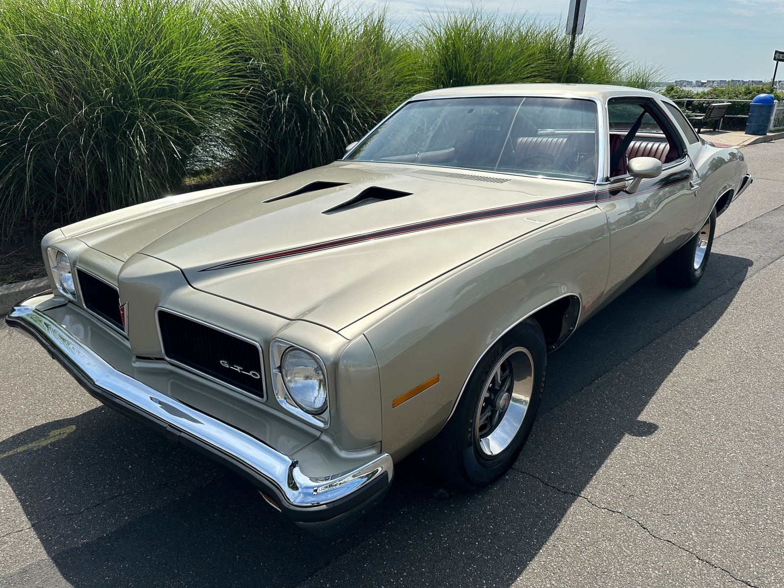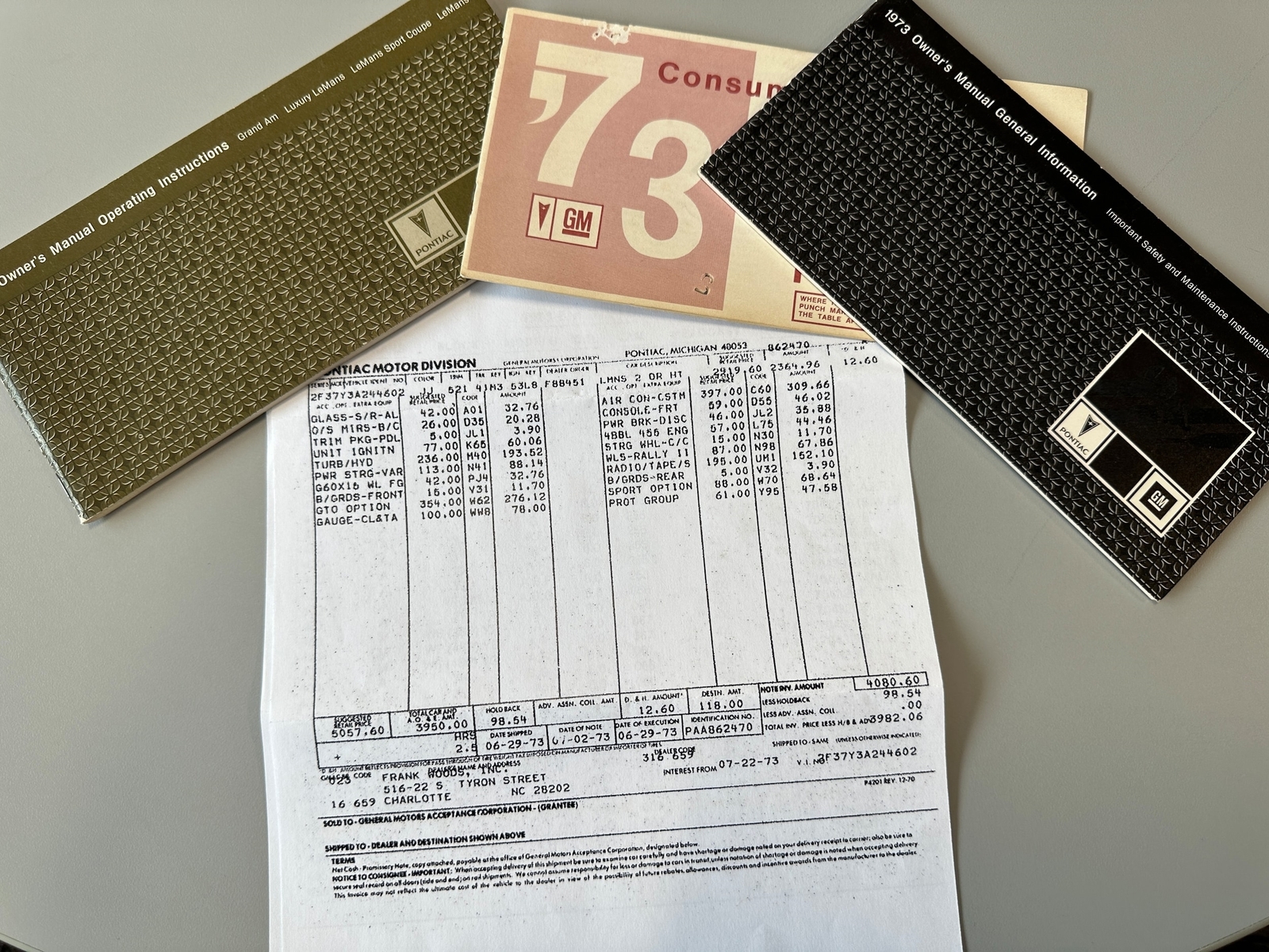 1973 PONTIAC GTO SPORT COUPE 455CI 4BBL AUTO FACTORY A/C RARE ONLY 544 PRODUCED YEAR: 1973 MAKE: PONTIAC MODEL: GTO SPORT COUPE BODY: COUPE COLOR: GOLDEN OLIVE TRIM: RED ENGINE: 455 4BBL V8 TRANS: TH400 AUTOMATIC REAR: POSITRACTION 10 BOLT MILES: 67,670 (EXEMPT) SERIAL#: 2F37Y3A244602 FACTORY OPTIONS *TINTED GLASS *UNITIZED IGNITION *400 TURBO AUTOMATIC *POWER STEERING *POWER F DISC BRAKES *GTO OPTION *GAUGES AND TACH *AIR CONDITIONING *FRONT CONSOLE *455 4BBL V8 *SPORT STEERING WHEEL *RALLY 11 RIMS *SPORT OPTION *PROTECTION GROUP *ADDED BLACK WALL RADIAL TIRES *AM-FM RADIO SERIAL# BREADOWN 2-PONTIAC F-LEMANS CPE 37-SPORT COUPE Y-455 V8 3-1973 A-ATLANTA PLANT 244602-SEQ# COWL TAG 06D-BUILT 4TH WEEL OF JULY73-2AF37A 283417-73 LEMANS CPE PLANT #TRIM-WHITE PAINT -46-GOLDEN OLIVE DOCUMENTATION *OWNERS MANUAL*P.H.S. DOCUMENTATION*PONTIAC INVOICE HISTORY/COMMENTS This rare 1973 GTO was bought new in Charlotte N.C. and lived in southern states. The car had a quality restoration. Only changes to the car was white interior is now red. Quality throughout. Only 544 GTO's with 455 V8 were produced. The car runs and performs great and all features work on car.