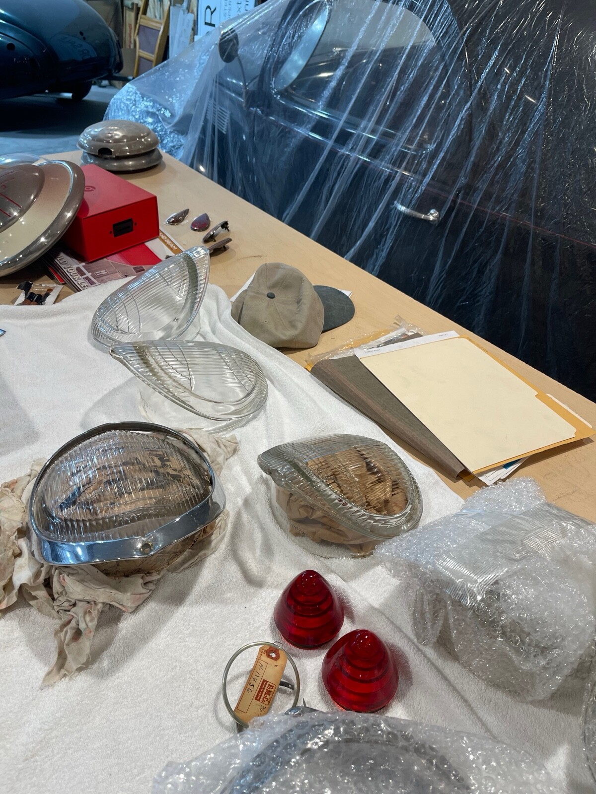 Body has been sanded down to metal by previous owner. front and rear fenders w/ 37' skirts, Original 37' grille, engine compartment screen cover, hood and deck lid. Exterior stainless hood trim, hood ornament, fender ornaments, headlight glass lens original, rare original tail light lenses and brackets (mounts rear fenders) deck lid handle. door handles. Bumpers (newly plated chrome) & brackets, emblems, most original glass intact.