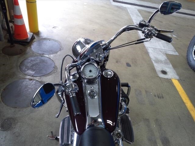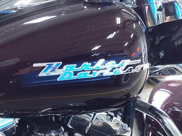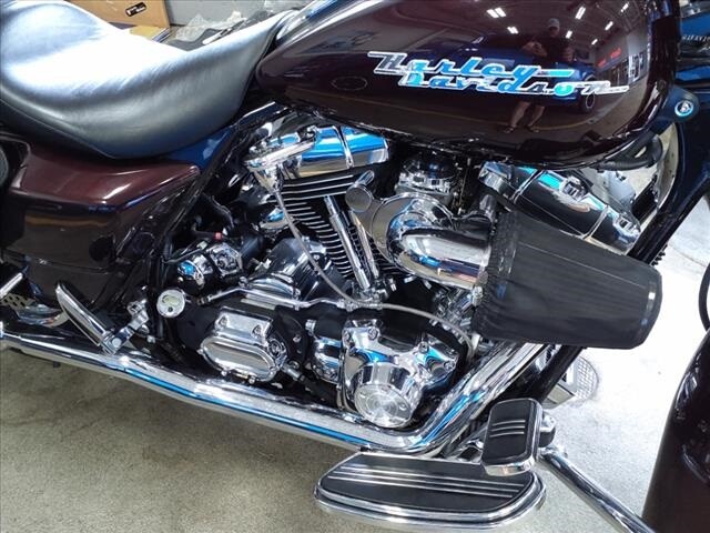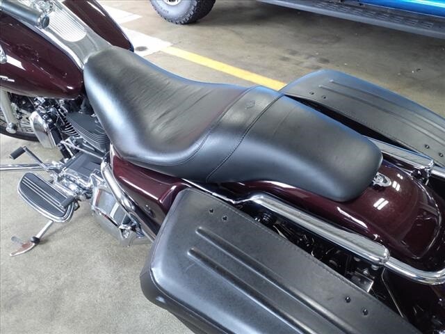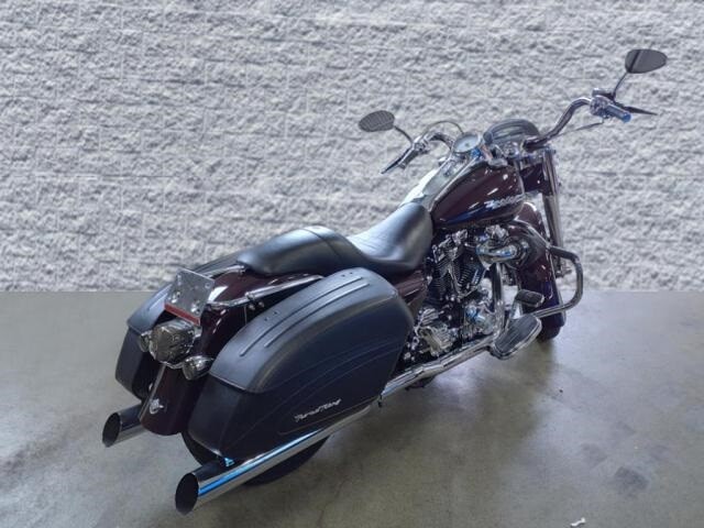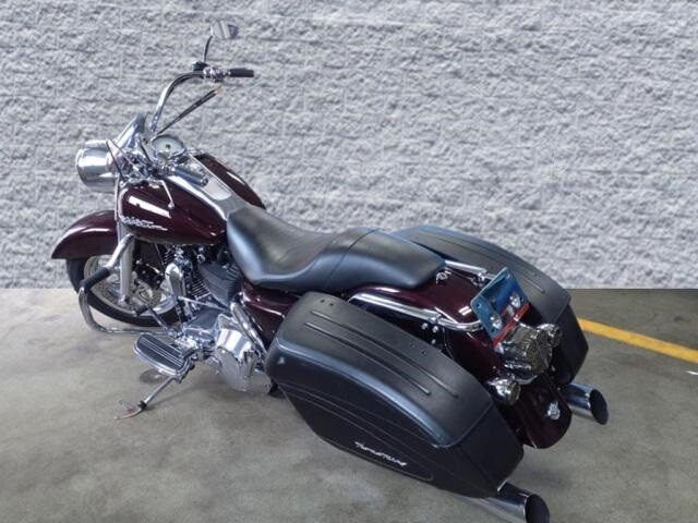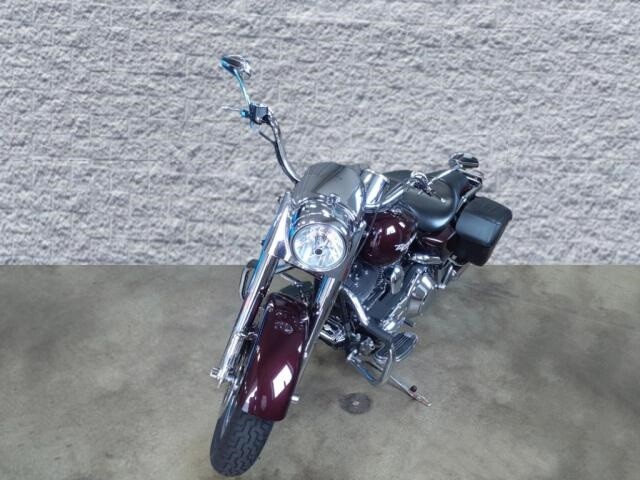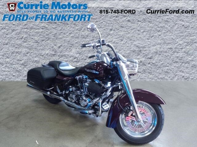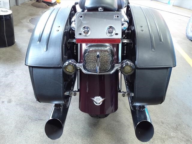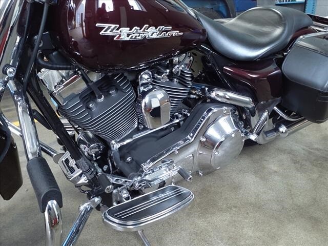 A little history: For 2005, the Road King Custom model makes its second appearance, and one year has done nothing to mellow its in-your-face style and attitude. When this machine first hit the streets, the riding public couldn't take its eyes off the minimalist swept-back chrome visor perched atop a set of pullback beach bars. Moving back, you'll find this custom bagger is dressed up right. Clean leather bags with hidden supports. Slash-cut mufflers. Electro-formed, chromed metal fuel tank emblems. Big, clean front and rear fenders. Rounding off the sweet look are streamlined footboards, passenger pegs, brake pedal, cast and chromed slotted alloy wheels and a tank-mounted stretch chrome console. Though the Road King Custom has much for the eye to see, it was built to see the country.