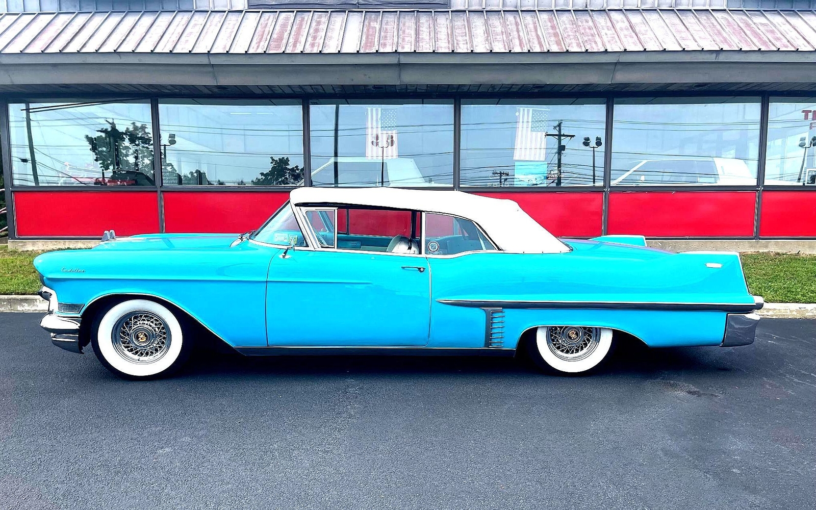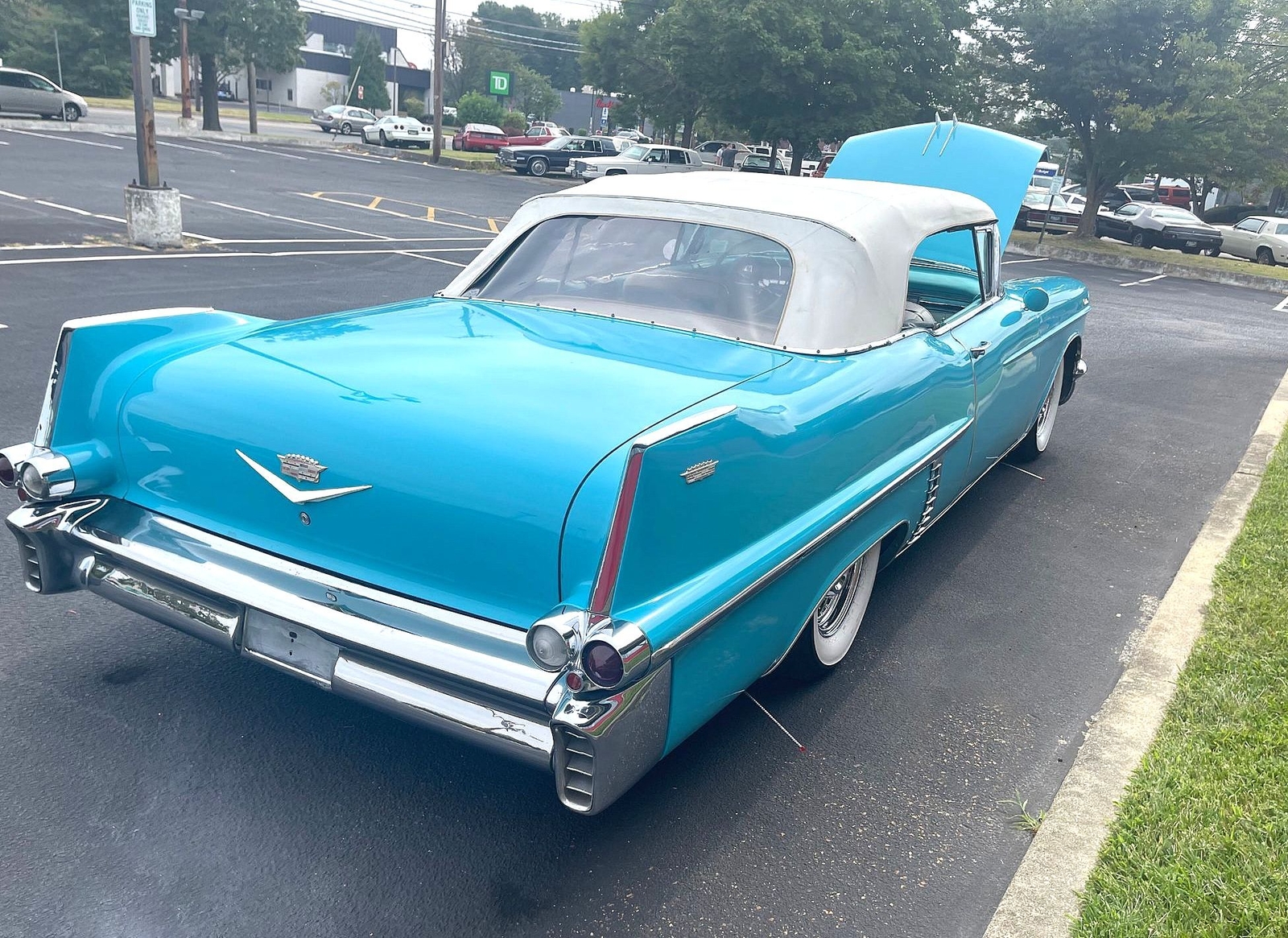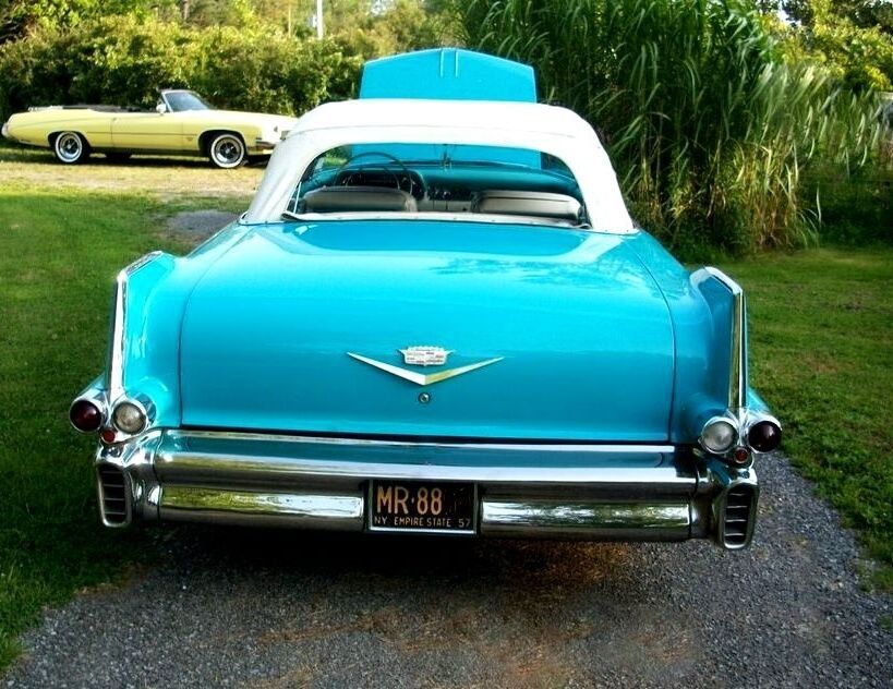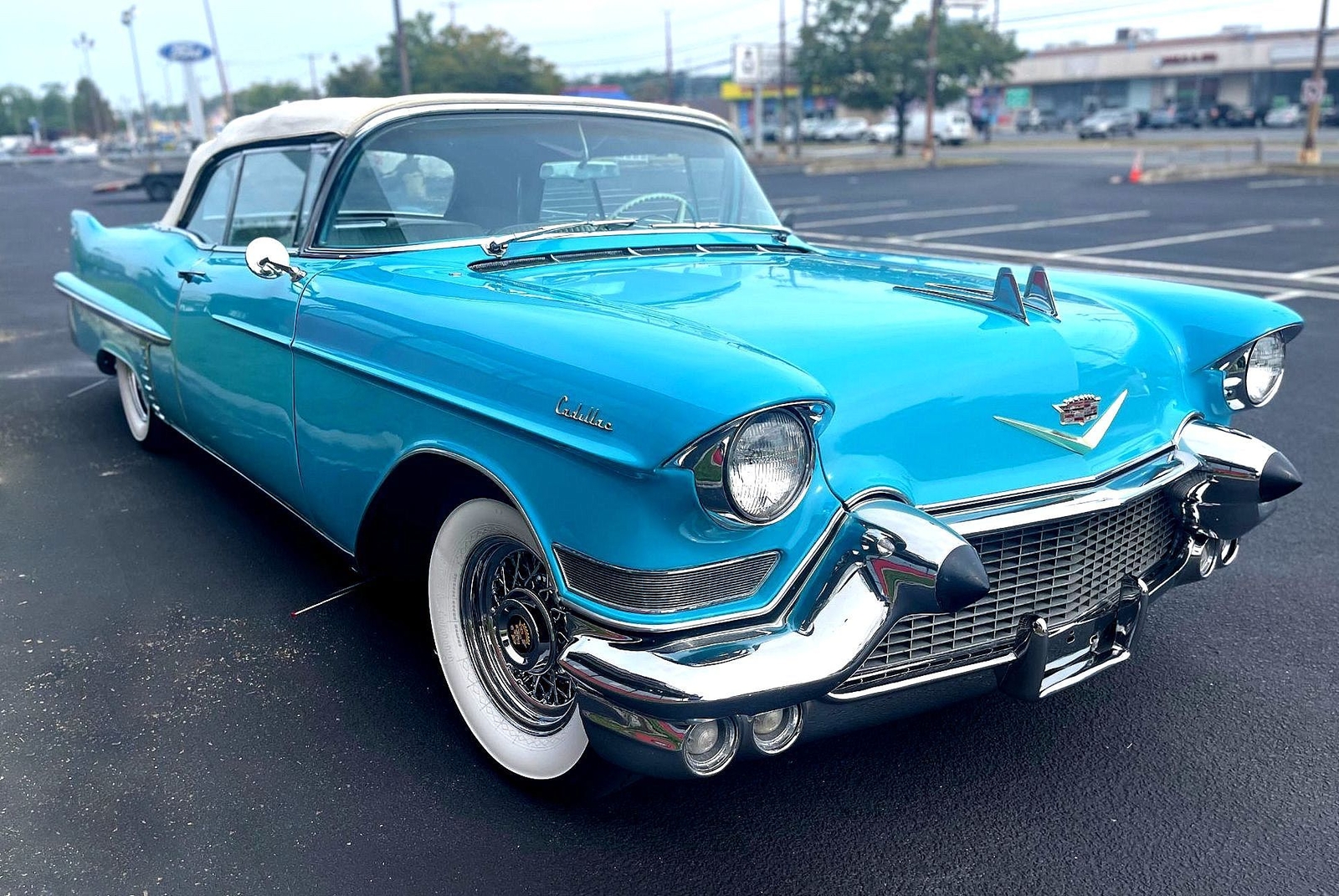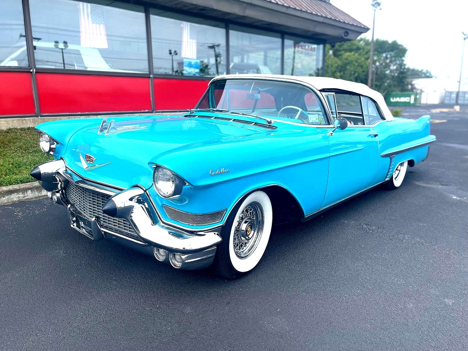 1957 Cadillac Series 62 Convertible Rare Blue with Original Blue and White Leather Interior. The Cadillac was GM's premier luxury car!! Just arrived older restoration looks fantastic in and out great leather interior looks beautiful leather dash. Runs and drives like a yacht. The 1957/58 Cadillac’s new chassis let it sit lower, the bumper guards now had rubber tips and the parkers mounted within the bumper. Tail fins, like a cut off shark fin, the tail lights round too. Models available in 1957; Series 62; 129 inch wheelbase; 2 door Hardtop, Convertible and 4 door sedan. Upmarket Coupe deVille and Sedan deVille Hardtop (scrolled 'deVille' on front fenders), Eldorado Biartitz convertible and Eldorado Seville 2 door Hardtop (different rear quarters) . Engine; 325hp 365 cu in OHV V8 (all models) except the Eldorado that was equipped with two four barrel carb's......