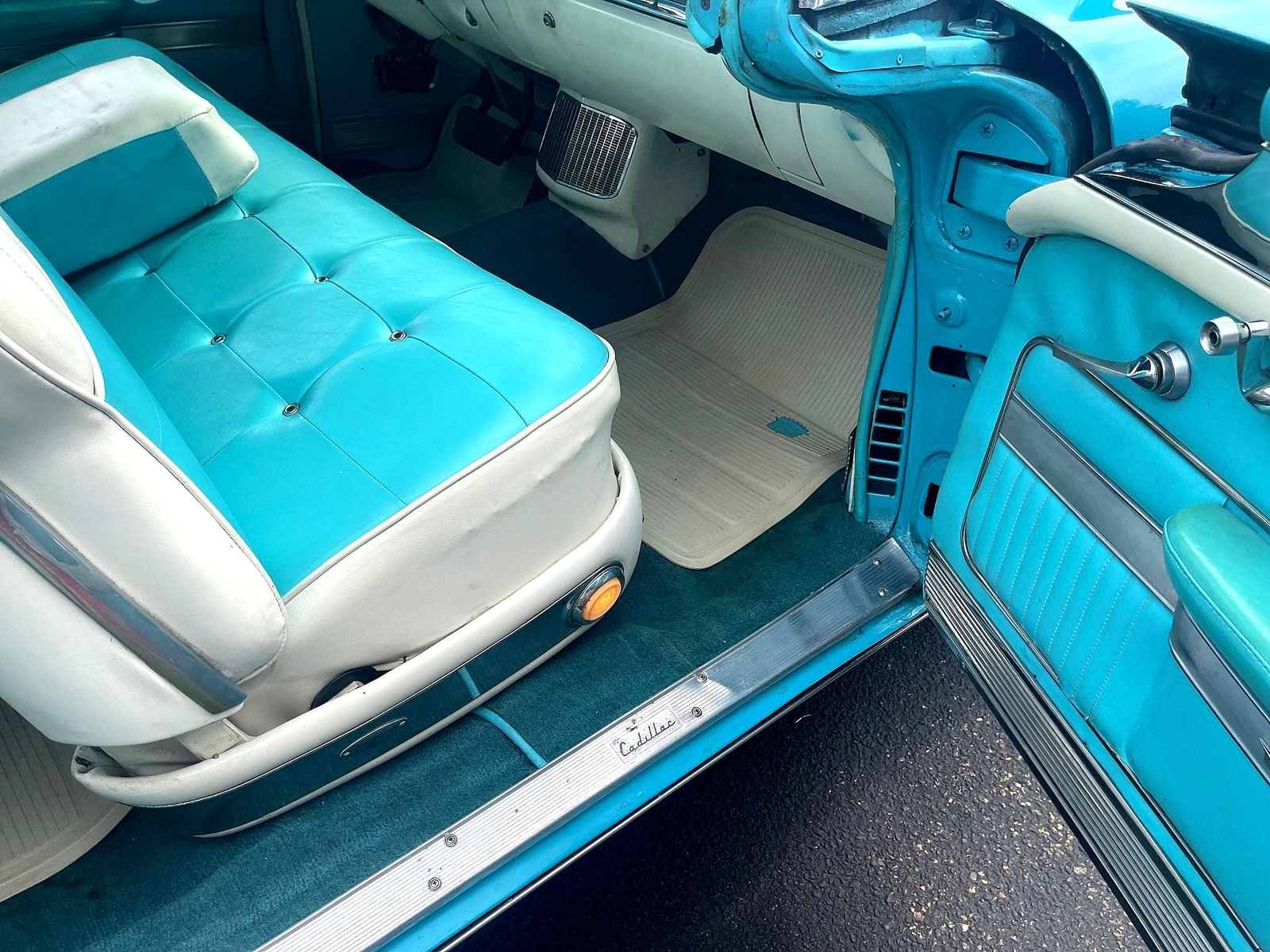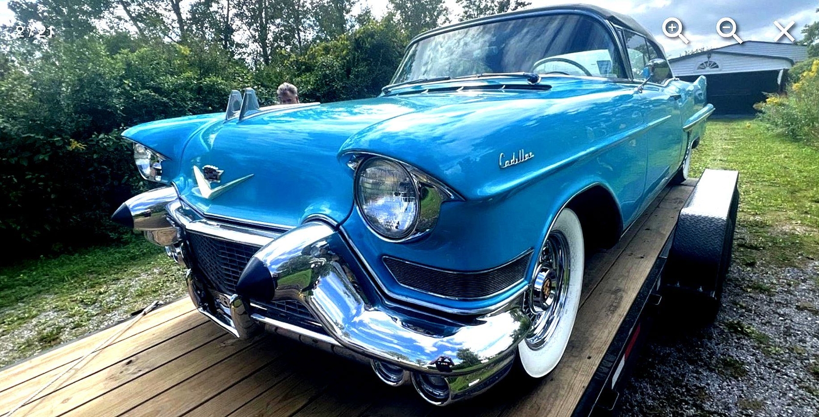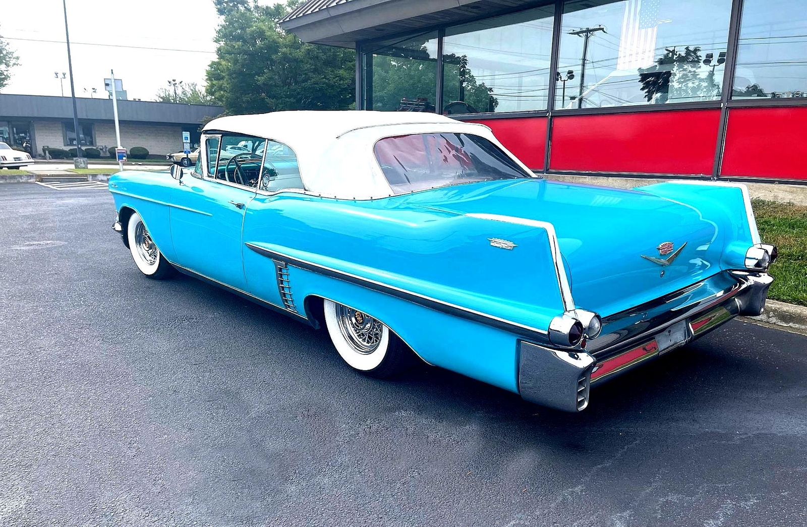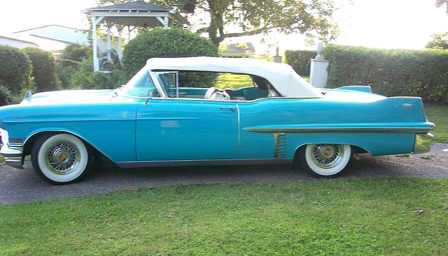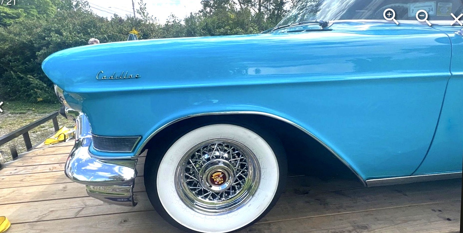 1957 Cadillac Series 62 Convertible Rare Blue with Original Blue and White Leather Interior. The Cadillac was GM's premier luxury car!! Just arrived older restoration looks fantastic in and out great leather interior looks beautiful leather dash. Runs and drives like a yacht. The 1957/58 Cadillac’s new chassis let it sit lower, the bumper guards now had rubber tips and the parkers mounted within the bumper. Tail fins, like a cut off shark fin, the tail lights round too. Models available in 1957; Series 62; 129 inch wheelbase; 2 door Hardtop, Convertible and 4 door sedan. Upmarket Coupe deVille and Sedan deVille Hardtop (scrolled 'deVille' on front fenders), Eldorado Biartitz convertible and Eldorado Seville 2 door Hardtop (different rear quarters) . Engine; 325hp 365 cu in OHV V8 (all models) except the Eldorado that was equipped with two four barrel carb's......