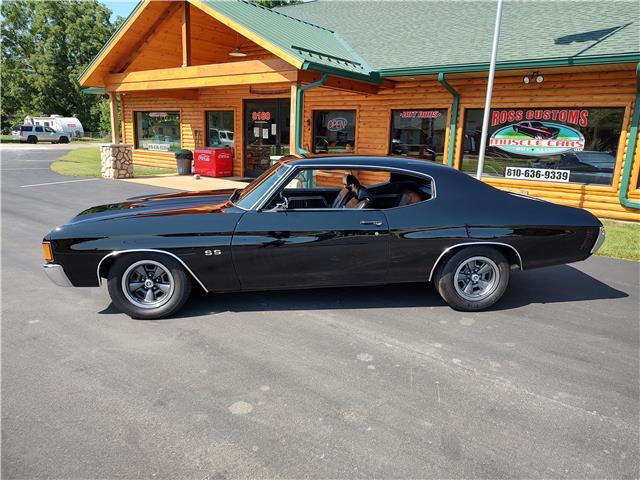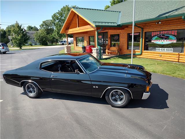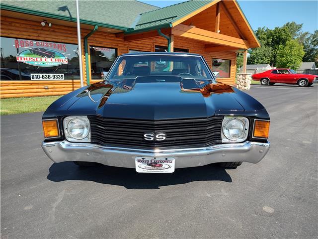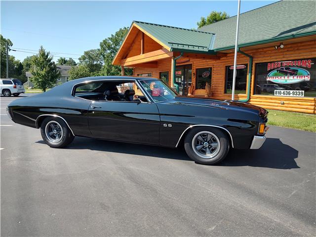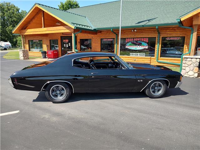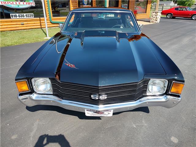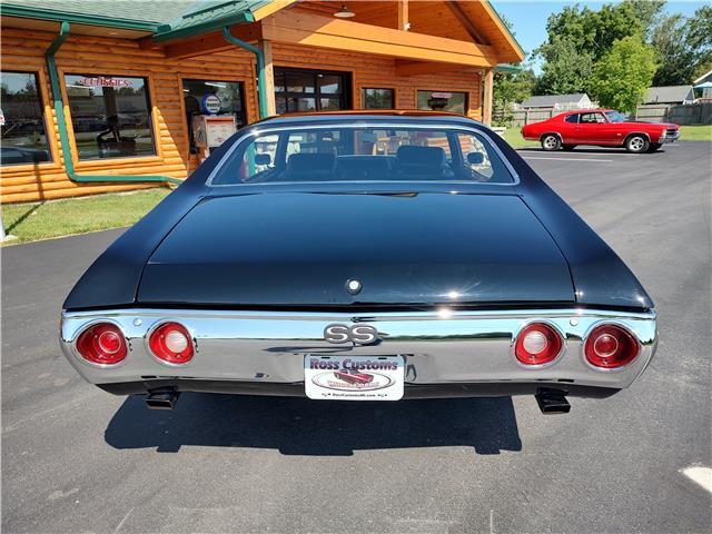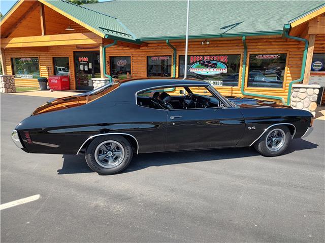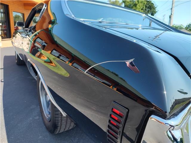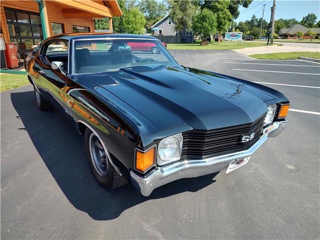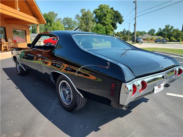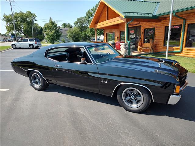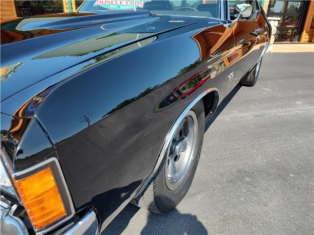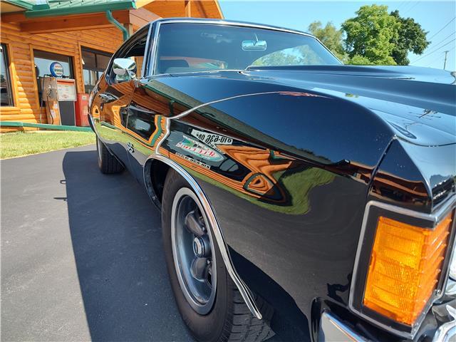 This is a very nice 72 Chevelle that has had a body up restoration, done in very slick Tuxedo Black, basecoat clearcoat, sanded and wheeled smooth, straight as an arrow, at time of restoration had new tinted windshield; all other glass is original factory softray tint in very good condition, window stainless and drip rail stainless is original in very good condition, new weather stripping and window felts, new side view mirrors, door handles are original in very good condition, original grill, headlight bezels and marker lights are in excellent condition, original front bumper; shows a little age, new wheel well moldings, new rear bumper.