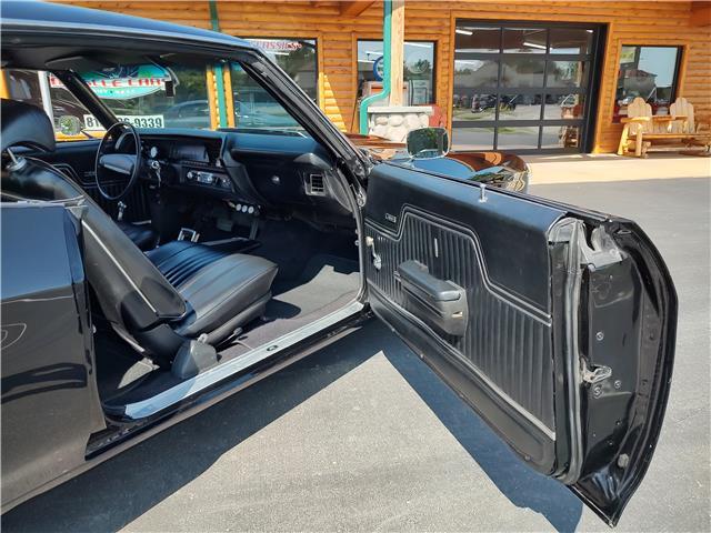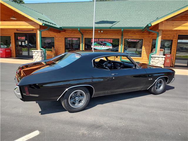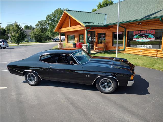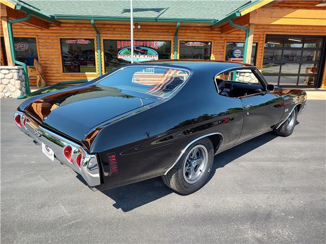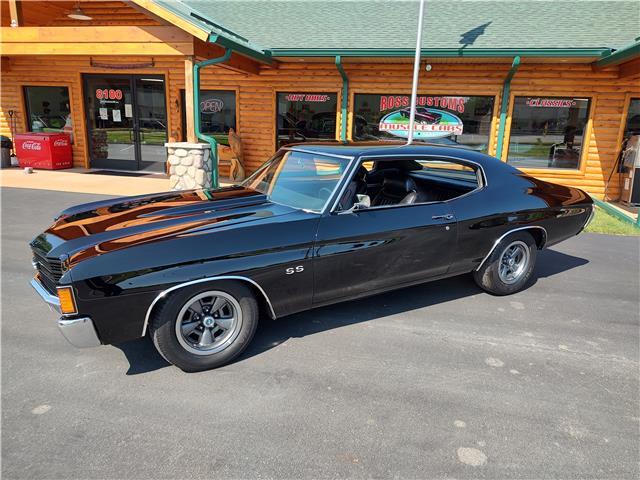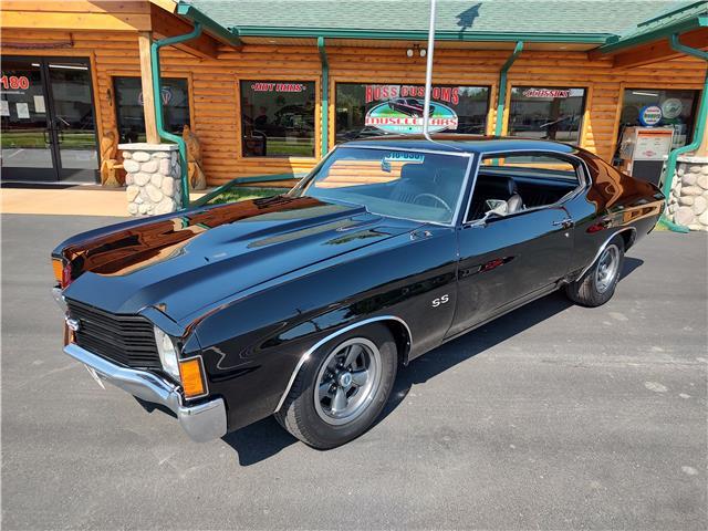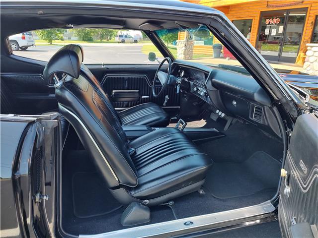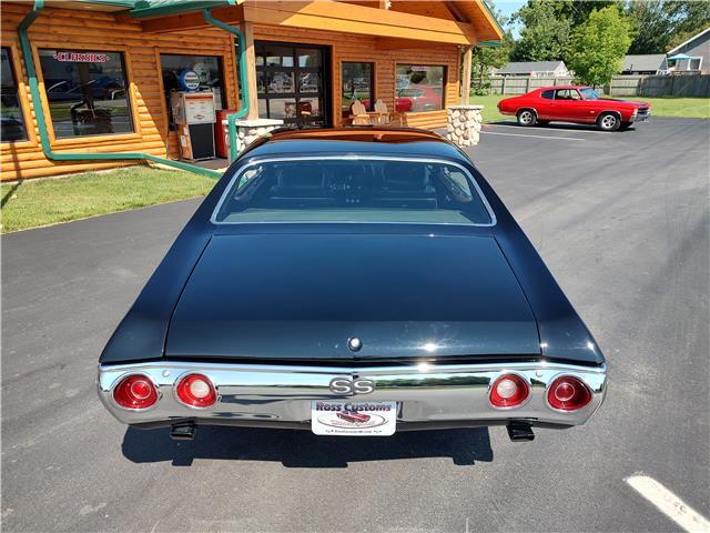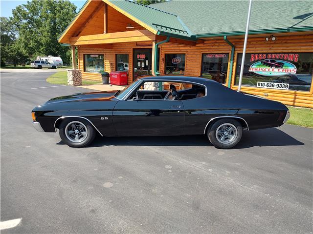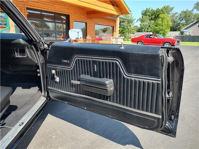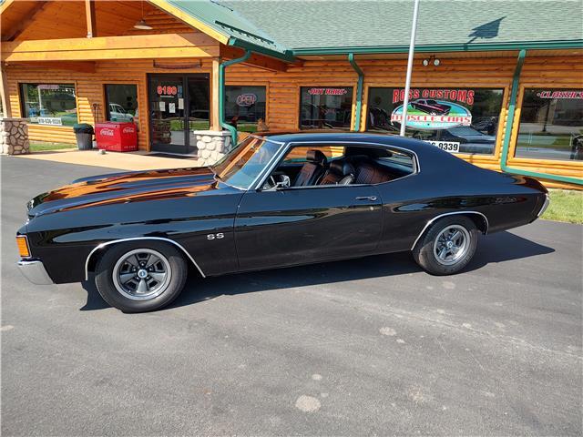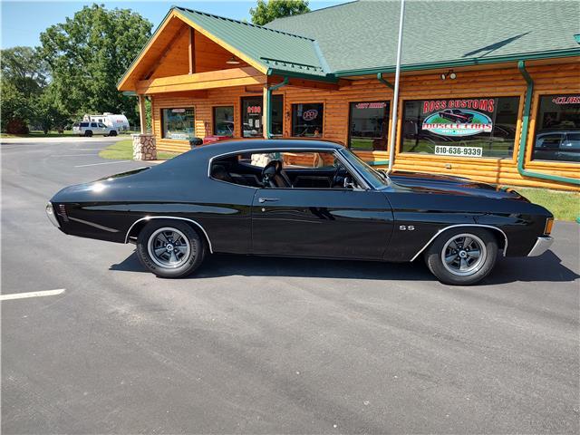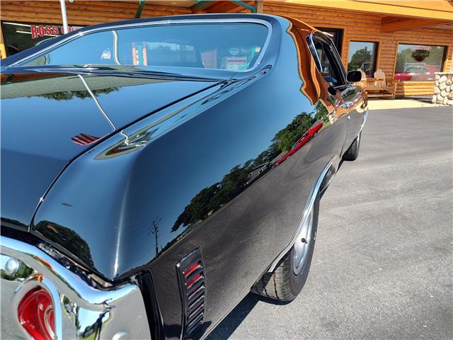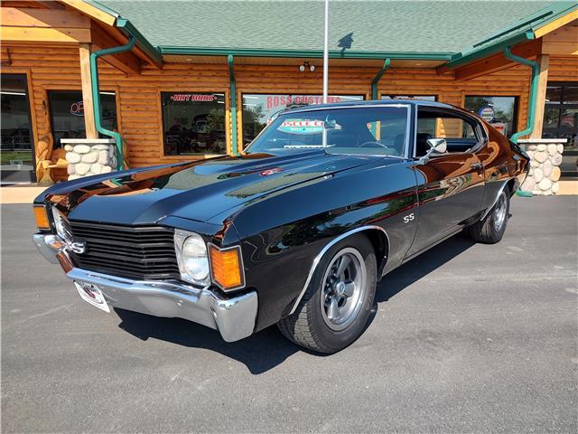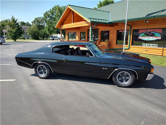 This is a very nice 72 Chevelle that has had a body up restoration, done in very slick Tuxedo Black, basecoat clearcoat, sanded and wheeled smooth, straight as an arrow, at time of restoration had new tinted windshield; all other glass is original factory softray tint in very good condition, window stainless and drip rail stainless is original in very good condition, new weather stripping and window felts, new side view mirrors, door handles are original in very good condition, original grill, headlight bezels and marker lights are in excellent condition, original front bumper; shows a little age, new wheel well moldings, new rear bumper.