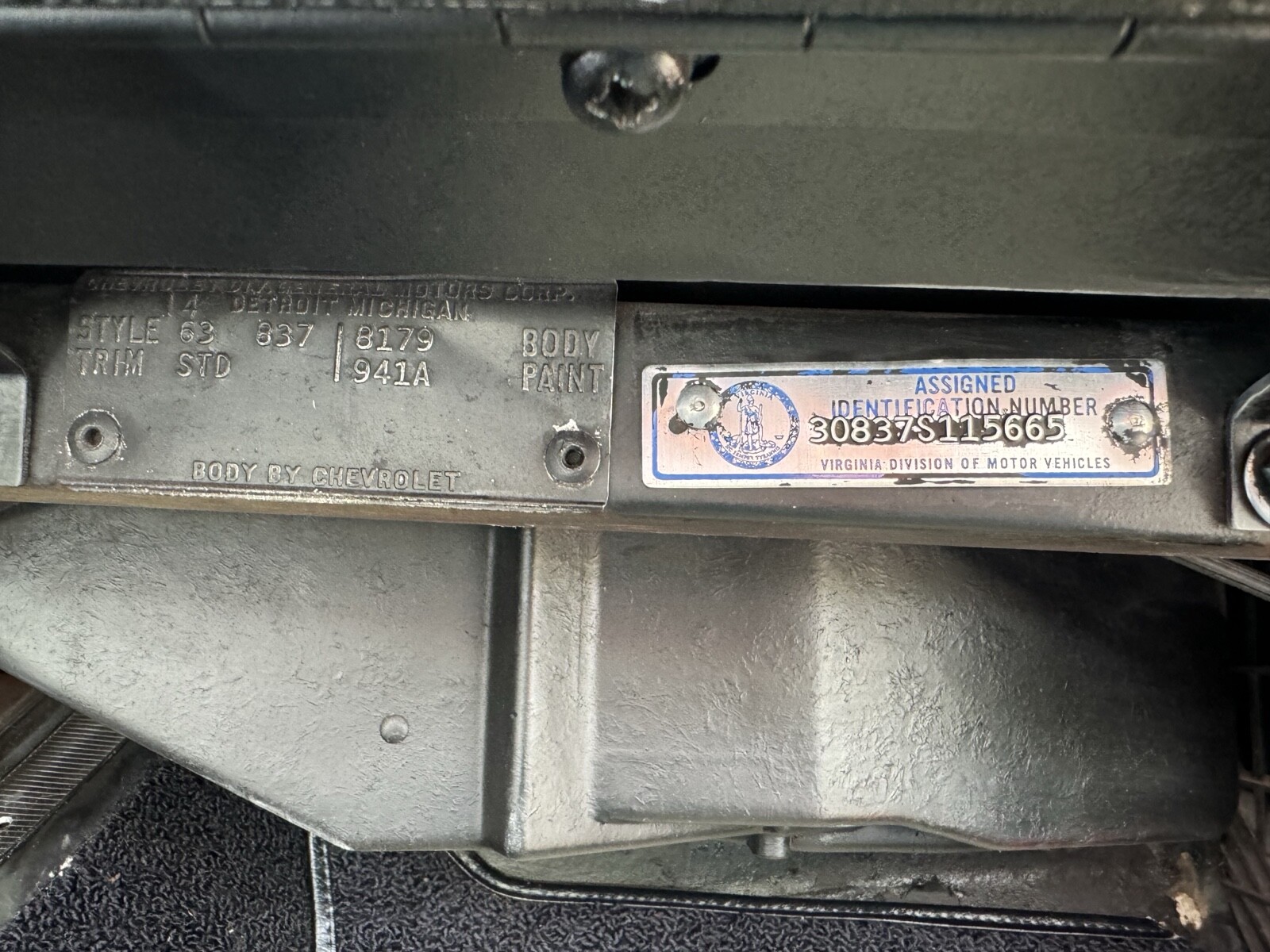 The cars vin tag has been replaced by the state of Virginia at some point in its life over the last 20 years when previous owner had the car it retains the correct vin number for a 1963 Chevrolet corvette split window coupe 30837s115665. Please see pictures of tag. The car does have a clear clean title.