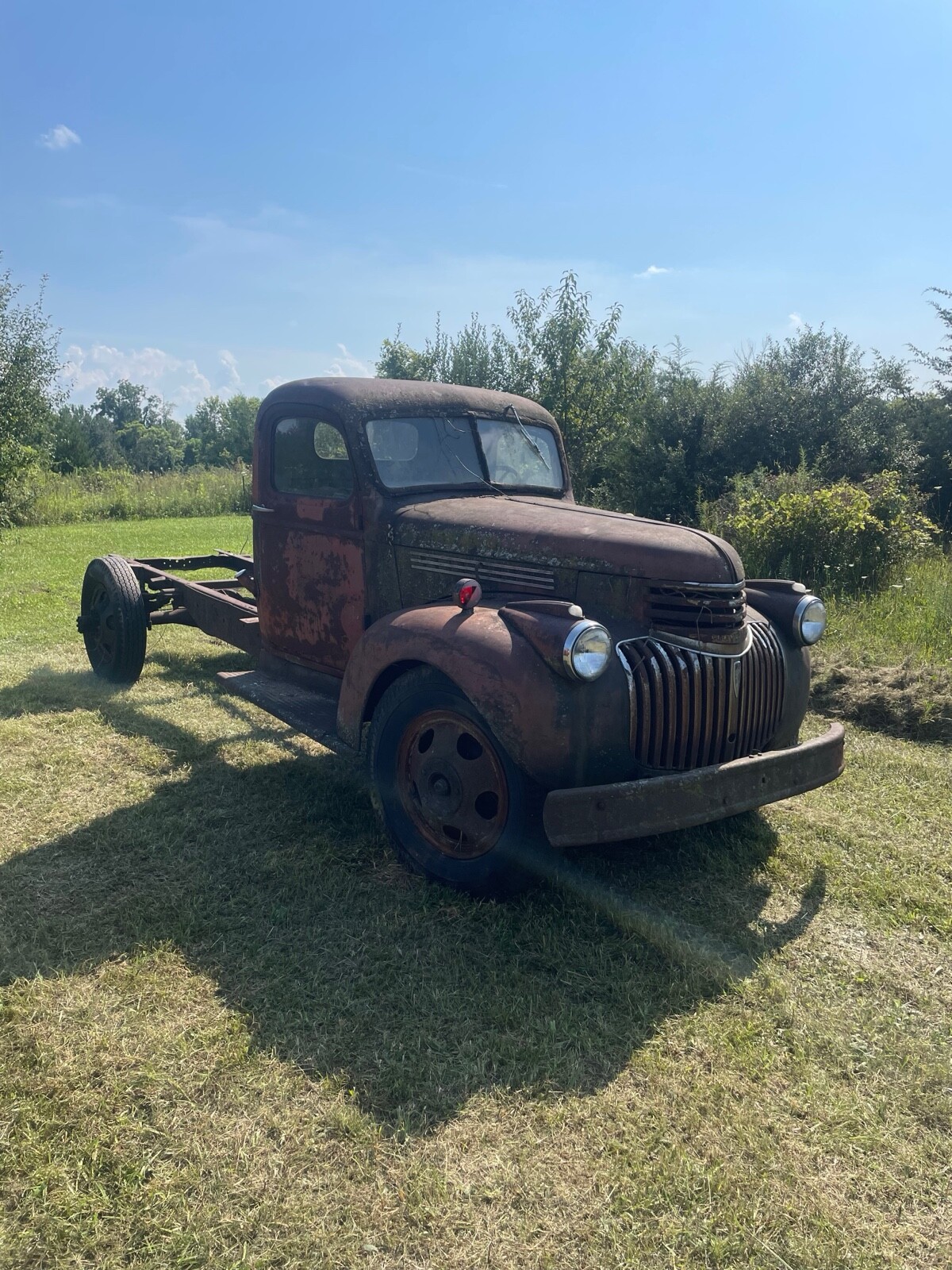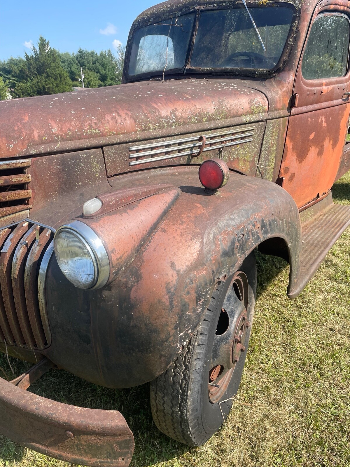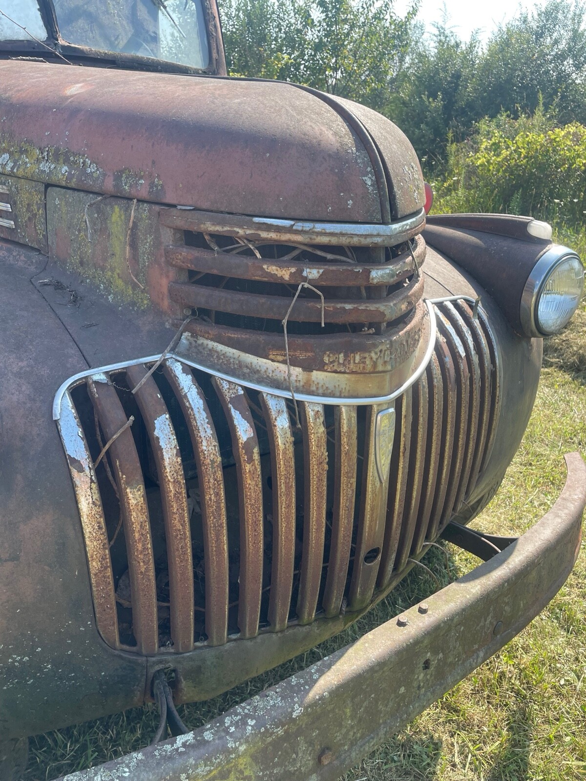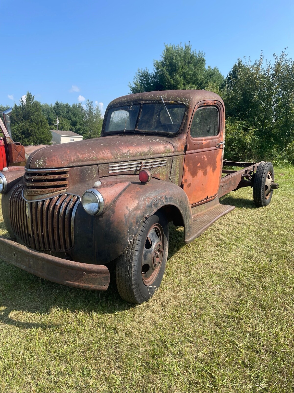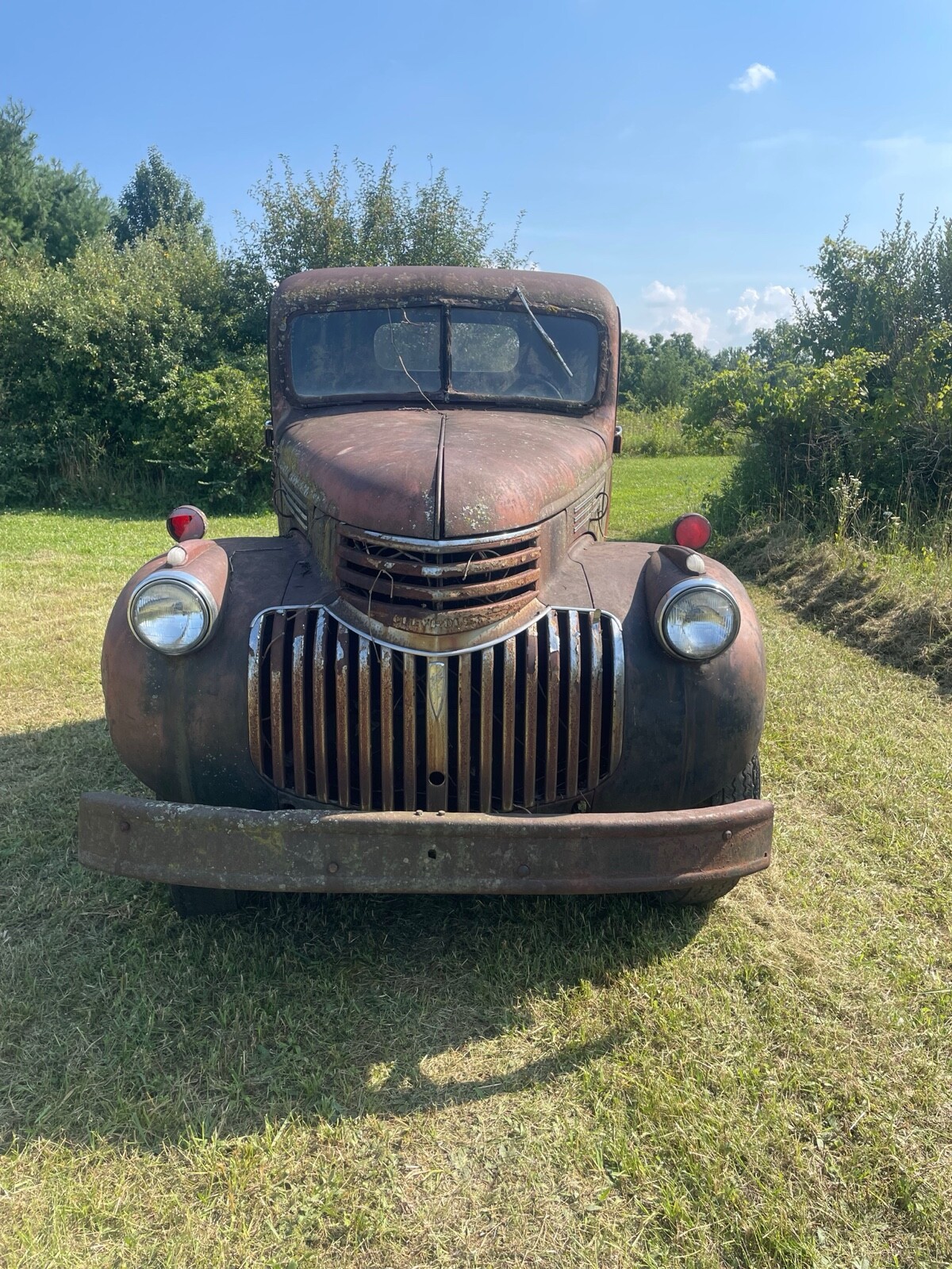 Up for auction is a 1941 - 1946 Chevy truck. That’s what I’m being told. Because there’s no title to the truck. That’s why it’s being sold as a parts truck. There’s a lot of good hard to find parts on this truck. From the headlights, hood , grille , inner fenders, running boards. To the interior parts such as. The seat, steering wheel and column, –, glove box, floor, pedals, heater, speedometer. Also has the original motor in it to the best of my knowledge. The doors and inner door panels to even the cab and glass. Excellent rat ride project patina. Being sold as is where it is so any questions please ask. Payment must be received within three days End of auction upon pick up of the truck. Local pick up only otherwise discussed with me. Possible delivery. hopefully all the pictures will show the shape of the truck.