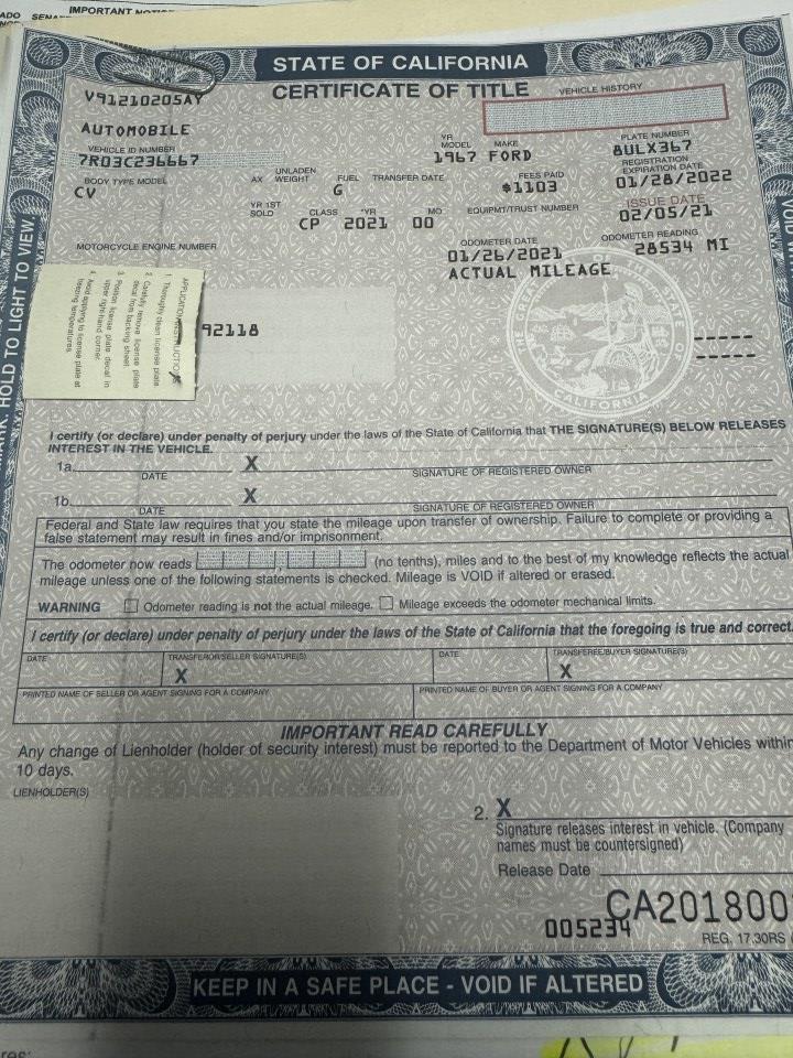 This 1967 Ford Mustang may truly be one of a kind, from the documents presented to us and the story we got from its owner is she bought this car from an 70 year old woman in Colorado Ms. Suzy Jenkins. Ms. Suzy she had a 1967 Mustang in College. She always wanted another and in 1995 she got her wish; Every time she got in the car it took her back to those good ol’ days at Colorado State enjoying the games, going to parties , going to rally the world’s issues and etc etc but when she got home. The car always went into the garage and was seldom used till the next time, obviously not her everyday car over the years, but she kept it clean and cherished. From what we can tell she only put on a few thousand miles in her time of owning it, she did a local parade every year with her friends from the book club in the back, drove it on the weekend and enjoyed it when she could. Fast Forward to 2021, the car now more of a handle to drive so she told some friends it was going up for sale, the daughter of a friend from the book club was living in San Diego and heard of it. Much like all of us during 2020 and 2021 we could go anywhere so we all bought cars to simply just drive and get out of the house by ourselves, it was literally all we could do if you remember !!! So the car was bought and was shipped to Coronado, Ca where it has been since then. Since then some light restoration was done and mechanical improvements for everyday use were taken, again the Local July 4th parade of a new city was now the cars big event, along with a few local drives around the island , and participating in the Coronado cars on Mainstreet show. The car now sits with 28,815 miles we believe these miles to be accurate and original. States original miles on the CA title , and provided info show this spare use over many years. Equipped with 289 V8 and Automatic transmission, upon receiving the car in March of 2021 several thousand dollars were spent dialing it in which including engine removal, new seals and gaskets, Timing chain, Machined the Heads, water pump full service to engine and trans seal, cooling system u joints etc … The car runs and rive good, looks good it has been repainted but not in the original color, some chips and nicks are evident but no rust to speak of. The interior is good, not showing major signs of major ware but some, top is good and goes up and own no problem. It’s a fun California Cruiser great for cruise nights , drives up the coast or for whatever you wish.