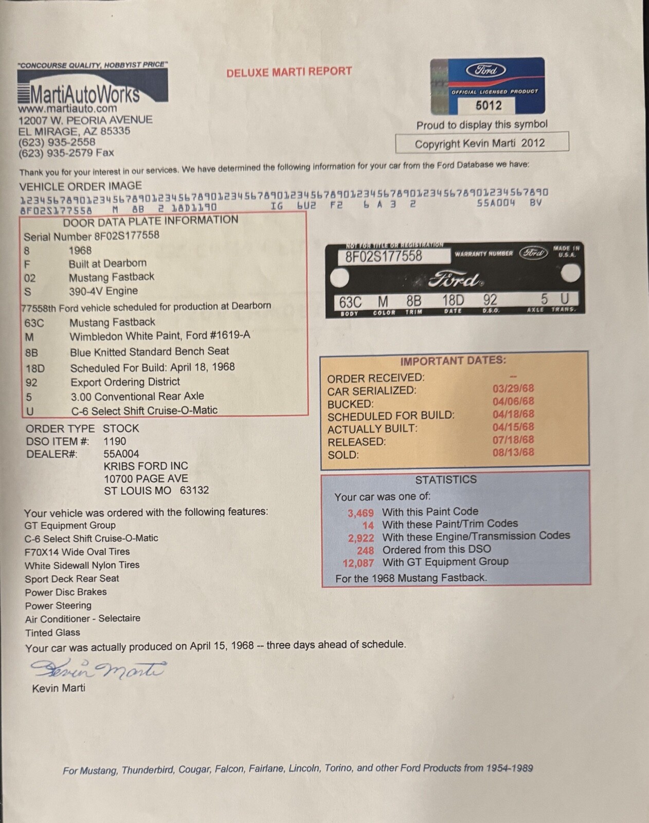 The Marti Report divulges the facts mentioned above as well as the factory body color originally being Wimbledon White (my personal favorite). It came with a bench type front seat which brought this optioned out vehicle to 1 of 14 produced in this model year.