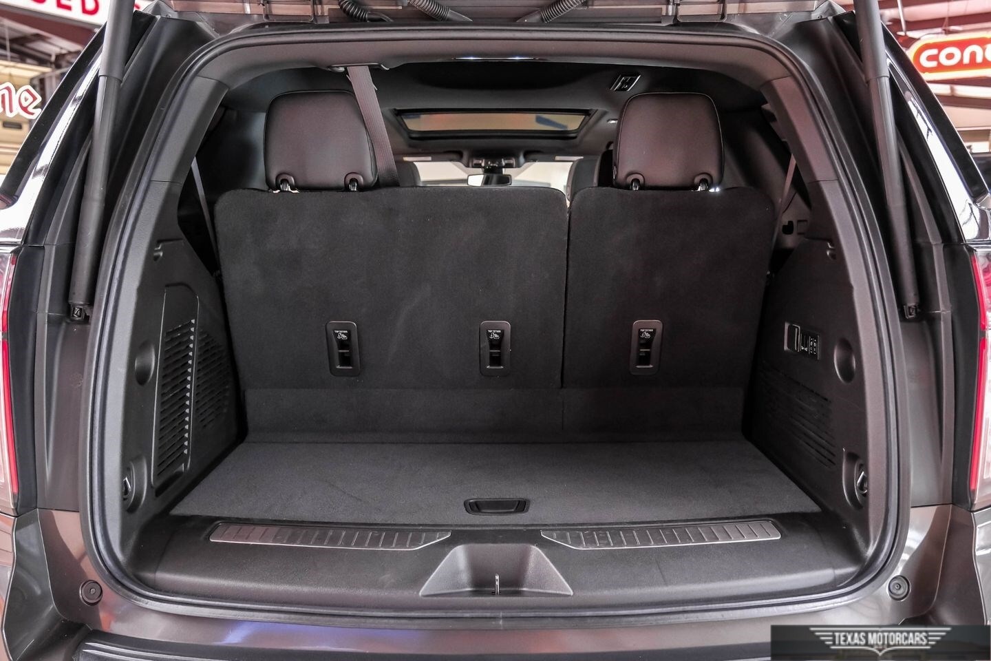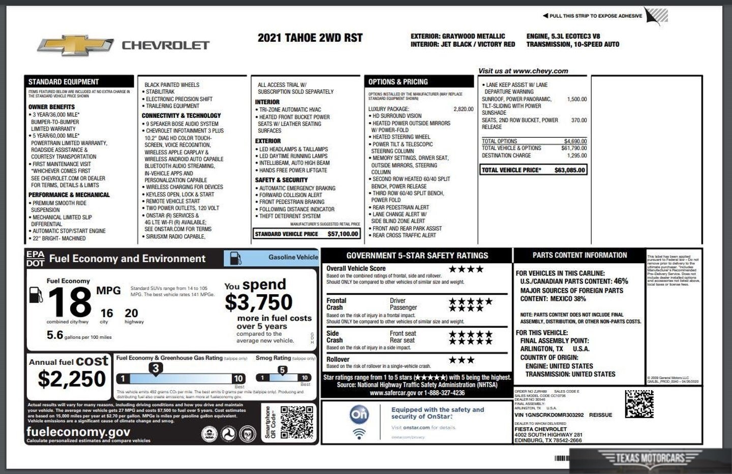 The 2021 Chevrolet Tahoe RST is packed with premium features that cater to your every need. The Power Panoramic Moonroof offers breathtaking views and an open-air experience that provide beautiful ambiance. The second-row bucket seats with power release provide easy access and ultimate comfort for your passengers. The luxurious leather-trimmed upholstery and leather steering wheel trim add a touch of elegance to the spacious interior.