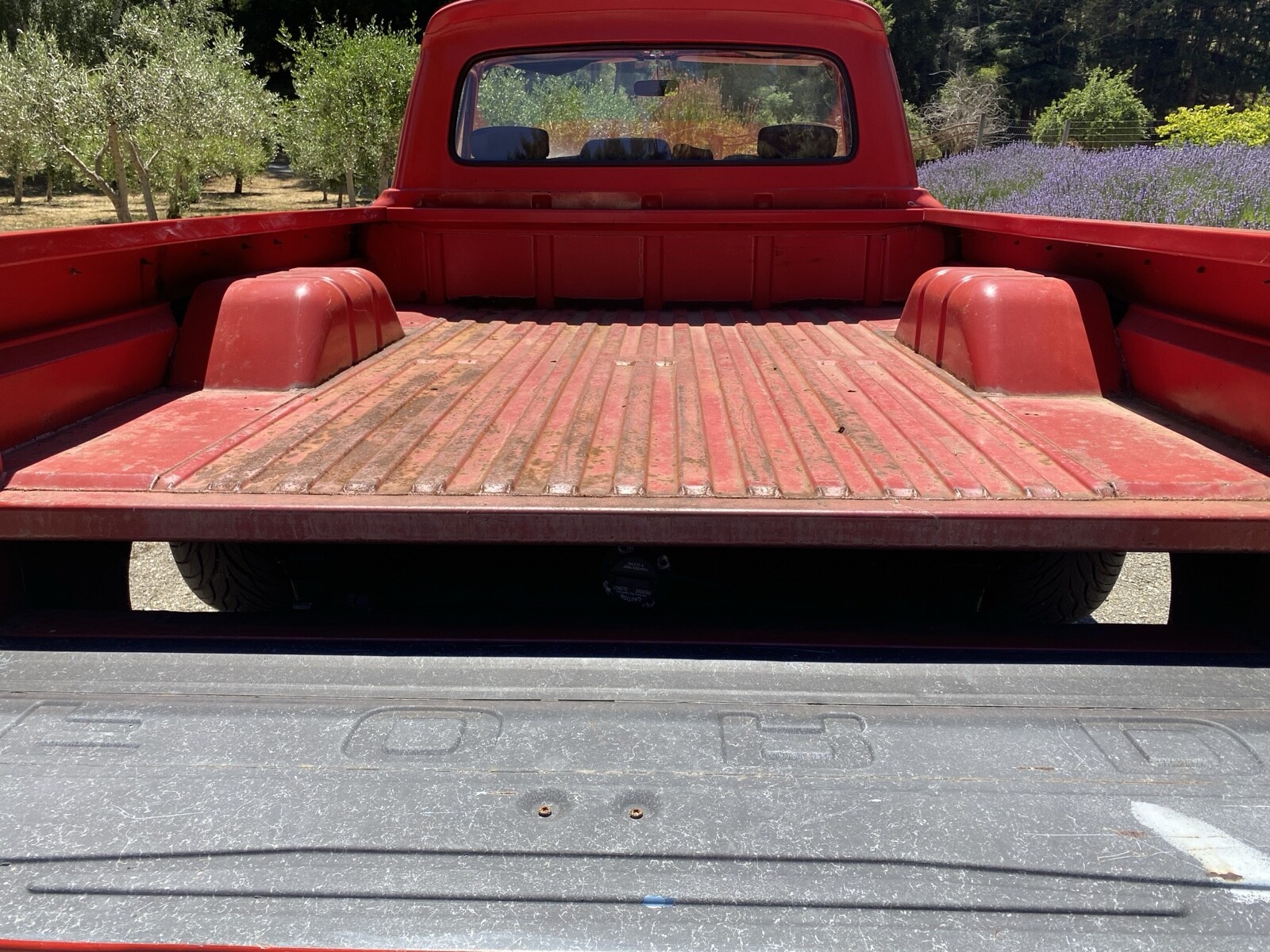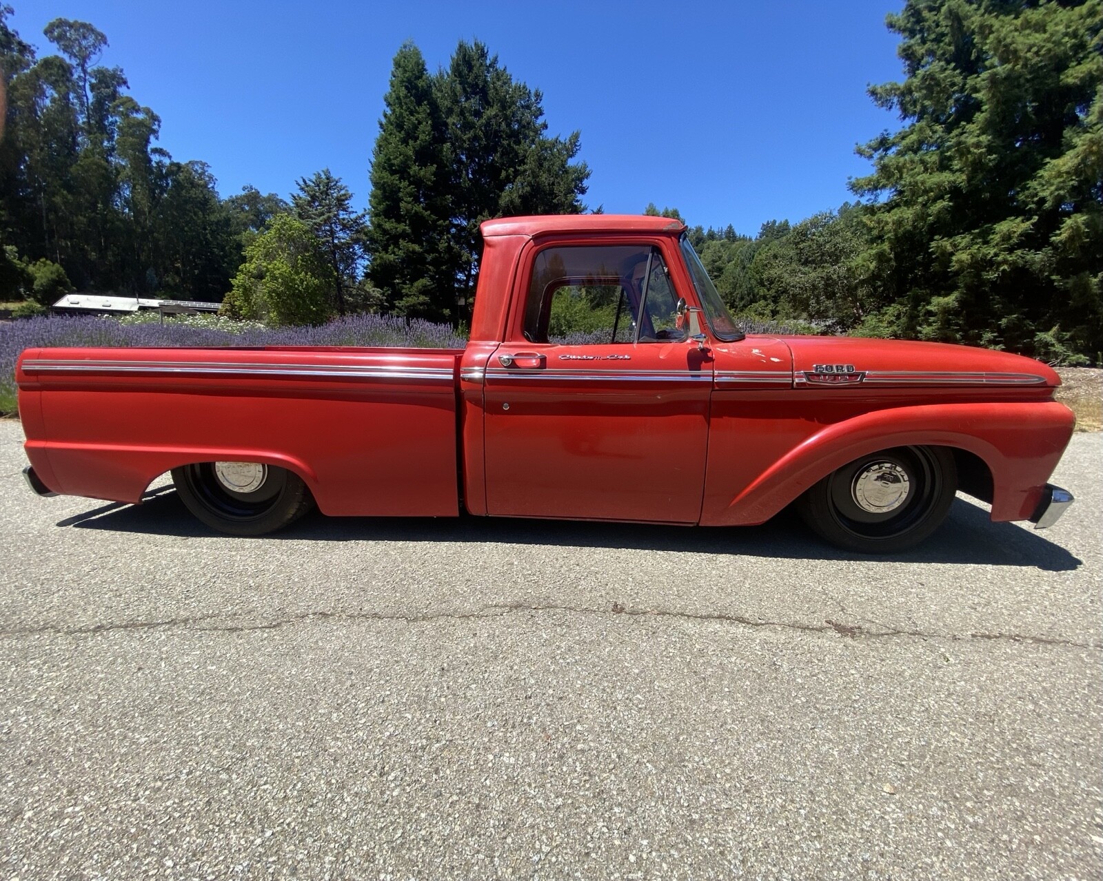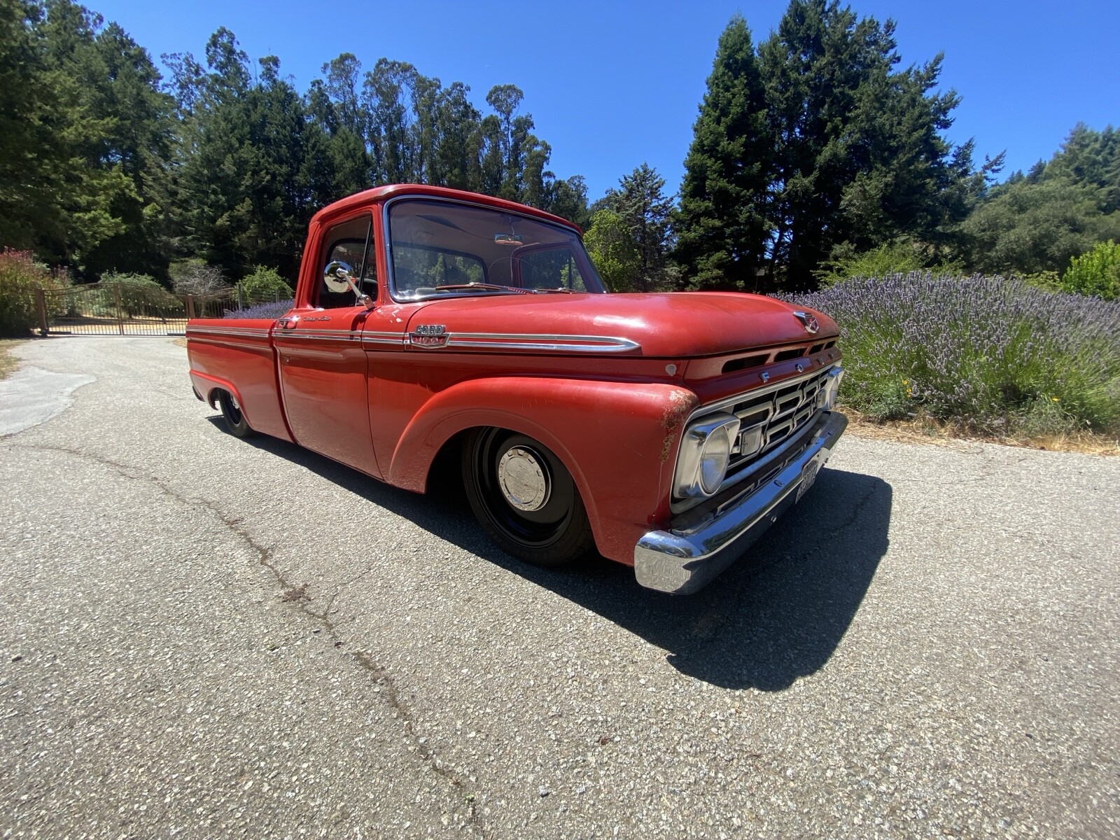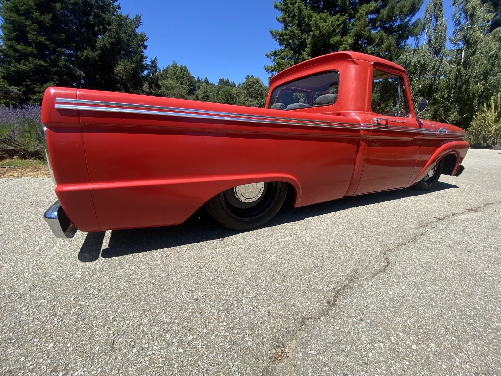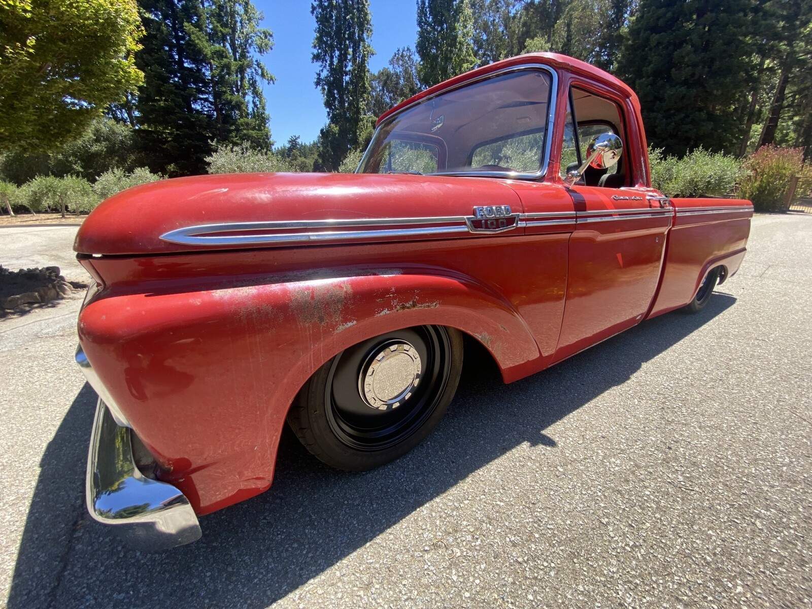 Rangoon red F100 shortbed patina monster. Ford Crown Victoria 4.6l engine and transmission. Static lowered on Crown Vic front end with 8.8 Crown Vic rear. 4 wheel disc brakes, cruise control. Coys C33 18 inch rims 225/45/18 tires front, 245/45/18 rear. Classic body with, modern underneath. Raised bed, drives great. Old headliner and door/window rubbers.