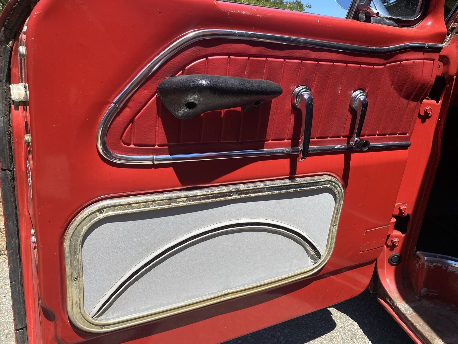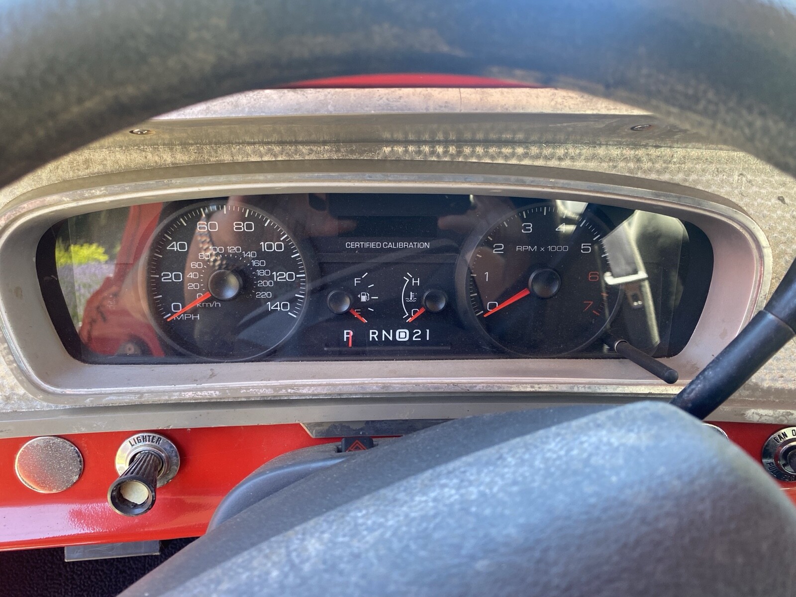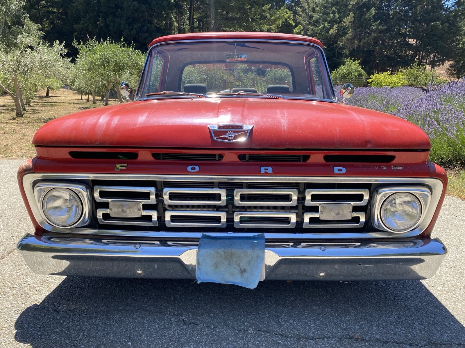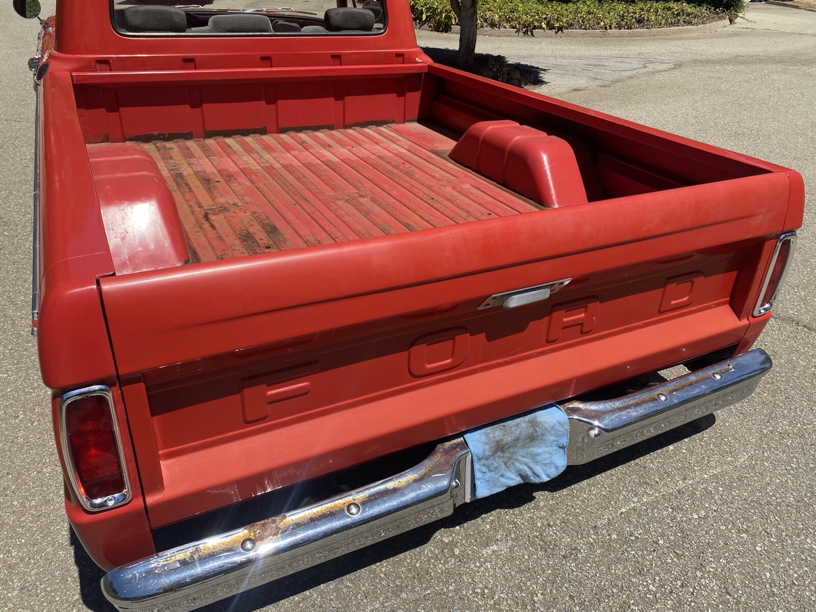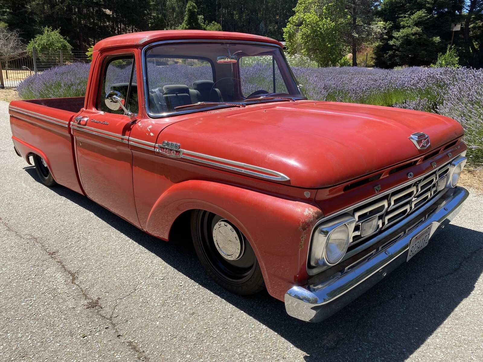 Rangoon red F100 shortbed patina monster. Ford Crown Victoria 4.6l engine and transmission. Static lowered on Crown Vic front end with 8.8 Crown Vic rear. 4 wheel disc brakes, cruise control. Coys C33 18 inch rims 225/45/18 tires front, 245/45/18 rear. Classic body with, modern underneath. Raised bed, drives great. Old headliner and door/window rubbers.