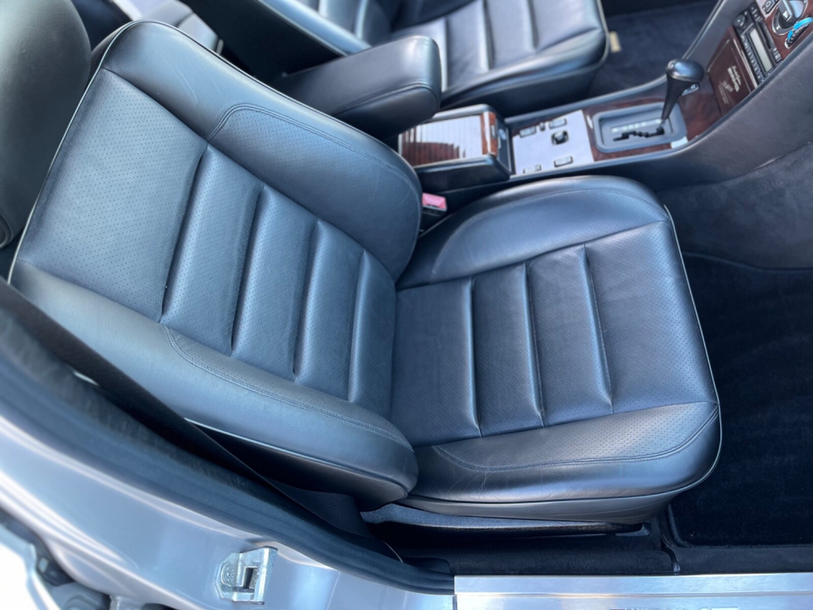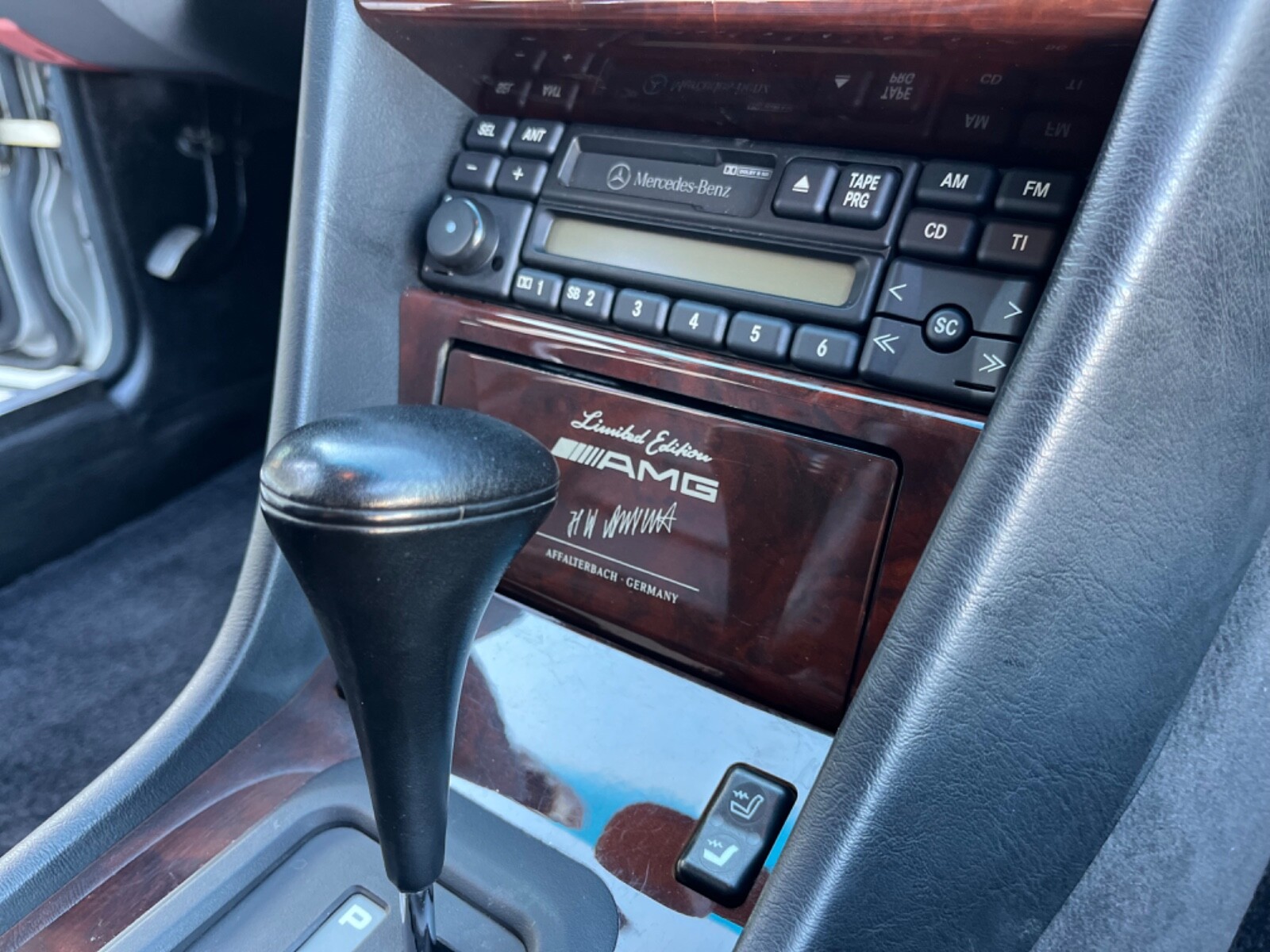 Factory equipment includes 17-inch AMG 2-piece wheels, AMG front and rear bumpers, AMG rocker panel extensions, an AMG exhaust system, extended fender flares, a power sunroof, leather upholstery, burred walnut wood trim, heated and power-adjustable front sport seats, an AMG gauge cluster, a cassette tape player, dual-zone automatic climate control, and cruise control. The seller reports no modifications.