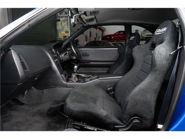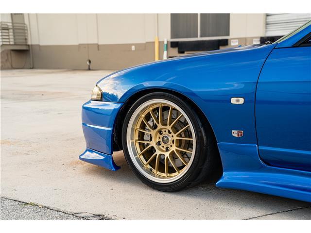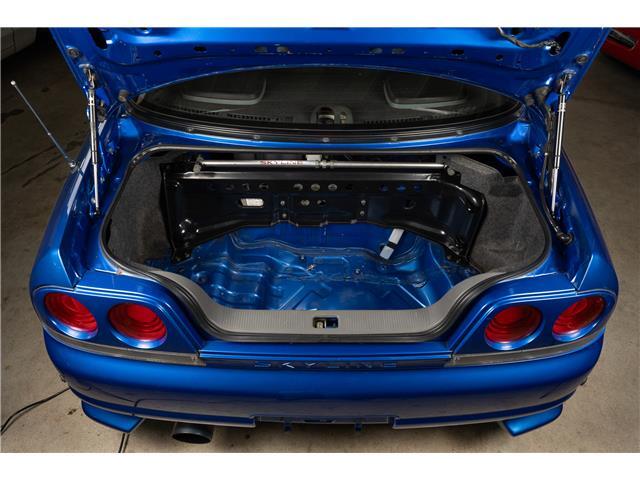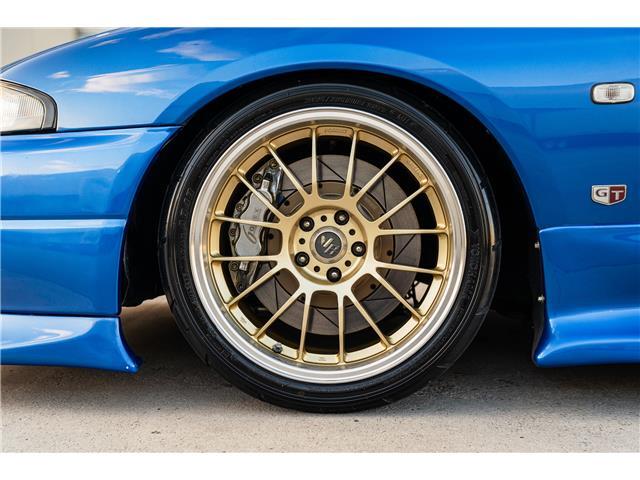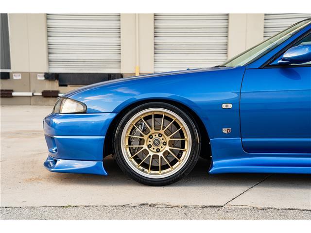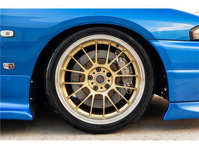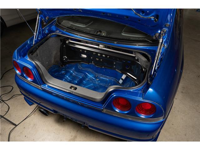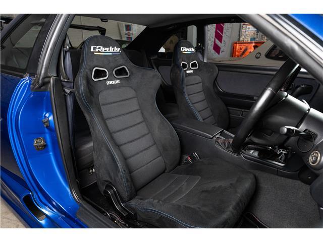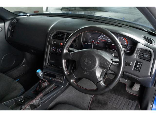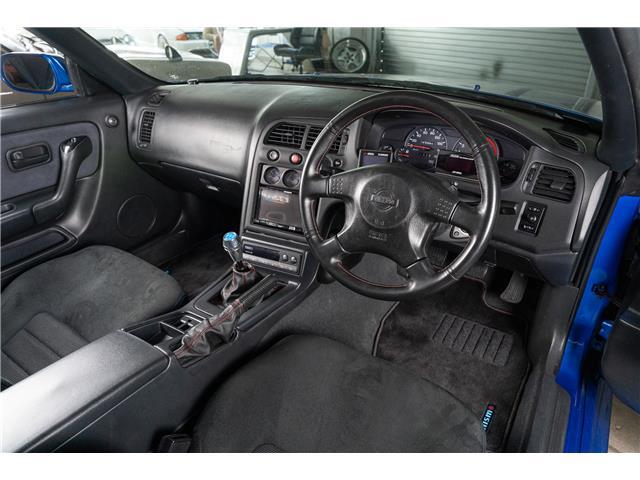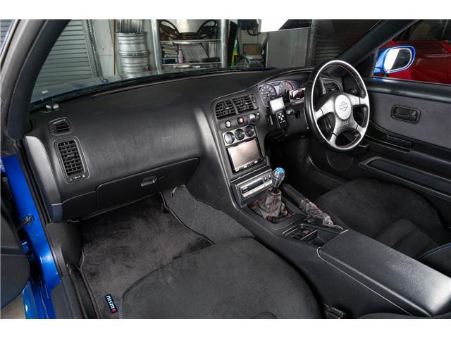 The looks of this R33 GT-R are those of an early 2000s Tokyo auto salon car that you might see running the Wangan after the show. Refinished in Bayside Blue the condition of the exterior is very good showing only minor imperfections indicative of normal use. Exterior modifications include Top Secret front lip, side skirts, and rear spats, N1 bonnet lip, bumper ducts and rear glass with no wiper, a carbon fiber GT wing, clear side markers and foglights, and the holy grail of lighting for an R33 the Series III Xenon projector headlights. If the looks are not as desired sourcing wheels and factory rear wing with trunk is possible.