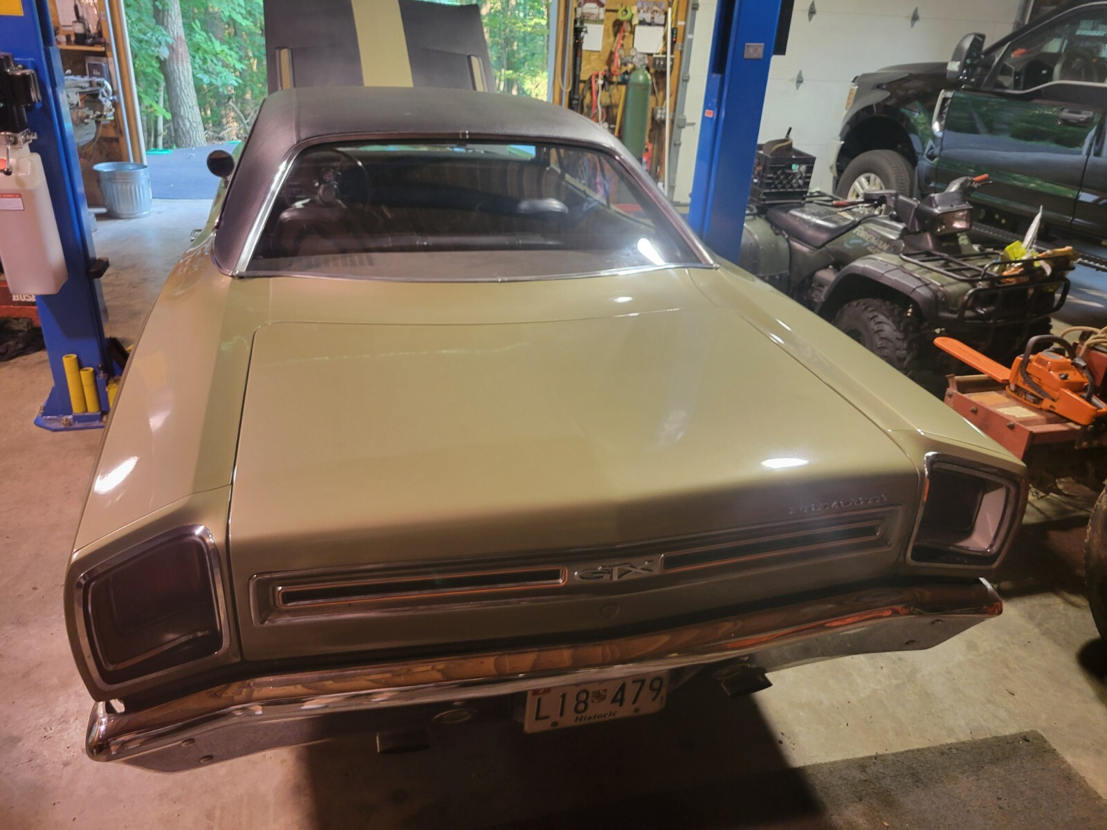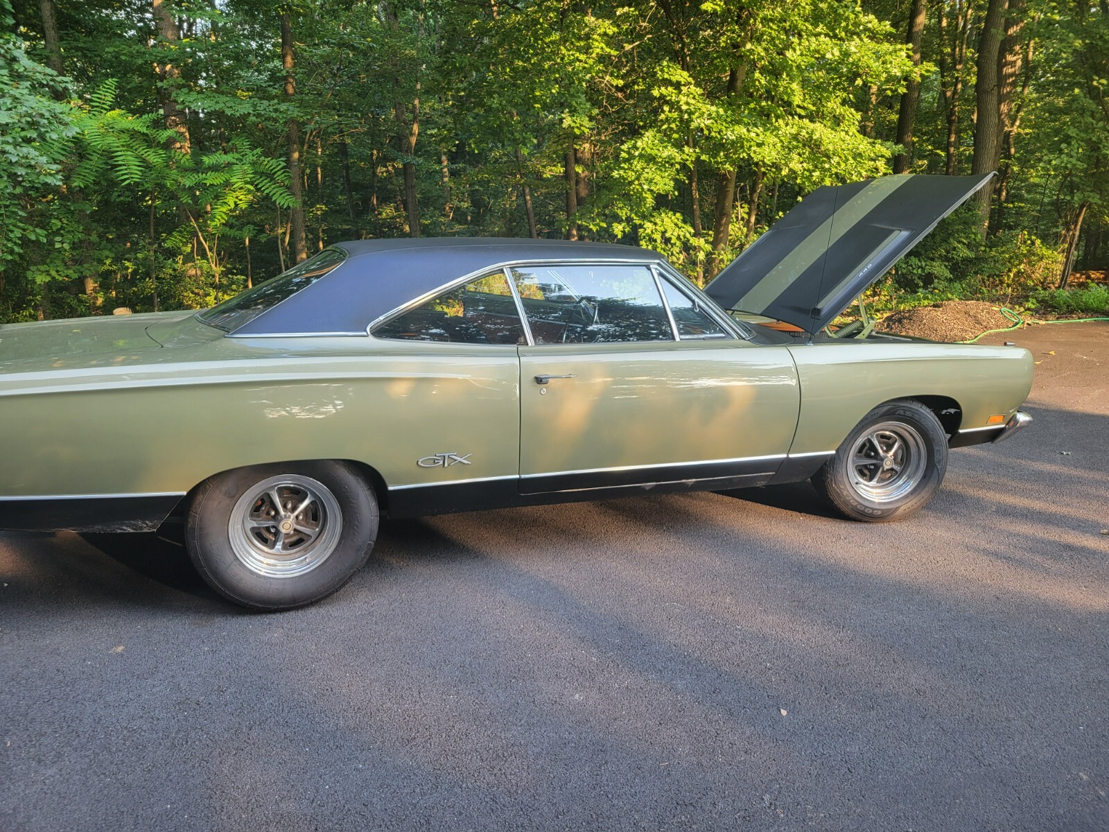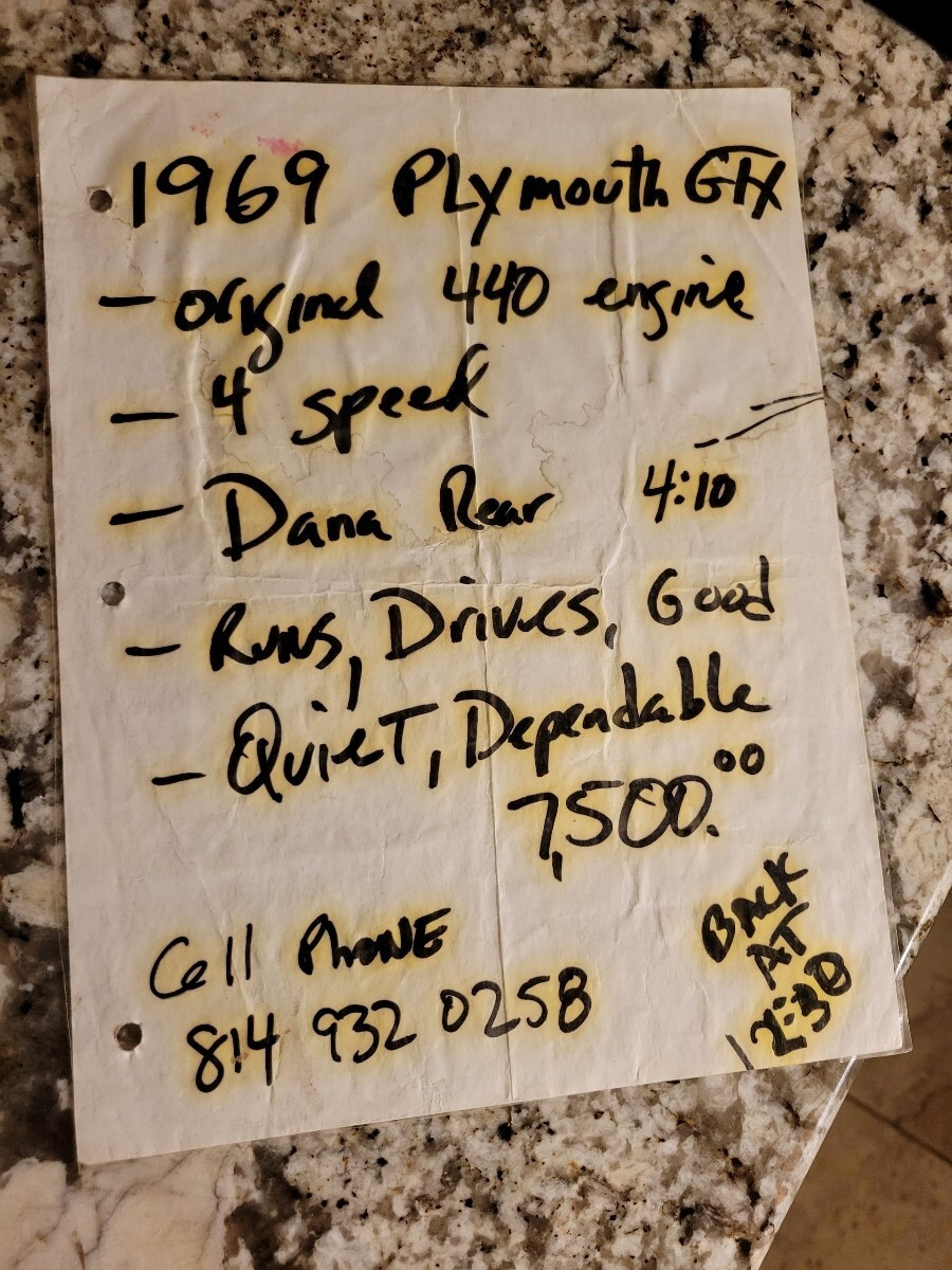 1969 Plymouth GTX 2 door cp. Numbers matching .440 engine, air grabber, 833 4 speed and Dana 60 rear! Runs great. New after market AC and blue tooth radio. Also disc breaks and new tires. Has a few small paint issues on rocker panel and inner fender well. Have original fender tag. G Glover authenticated.