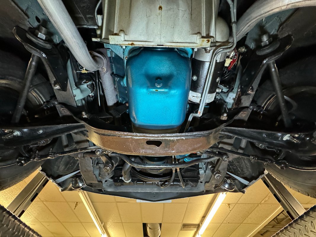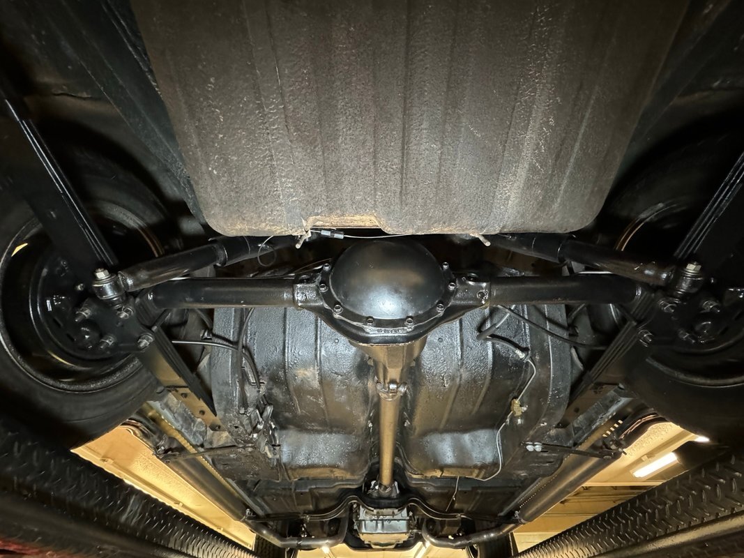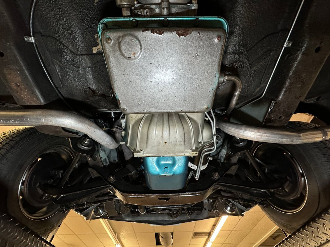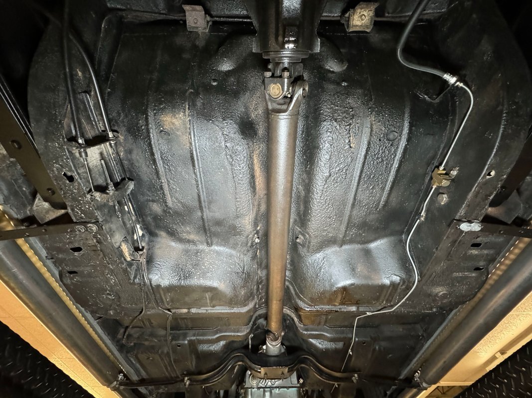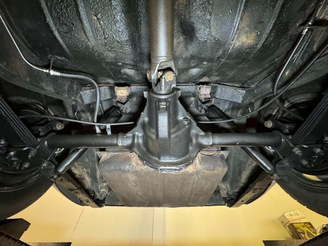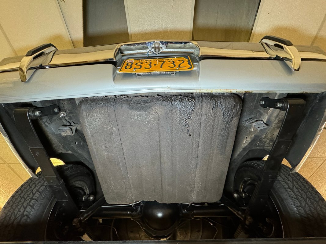 The car has been driven less than 500 miles since the restoration was completed in 2020, and it shows underneath which is nearly spotless. Under here, the Moser axles, pitman arm, and rear leaf springs are newer. Coil springs are up front. There's no surface rust or oil leaks, no dirt, and no grease built up anywhere. If not for some minor dust and road splash and basic patina, the underside would rival day one off the assembly line. As noted, the exhaust leaves the engine and immediately heads to the sides where side pipes send the spent gas along their way down the rocker panel, guarded by and dressed up with the louvered heat shields.