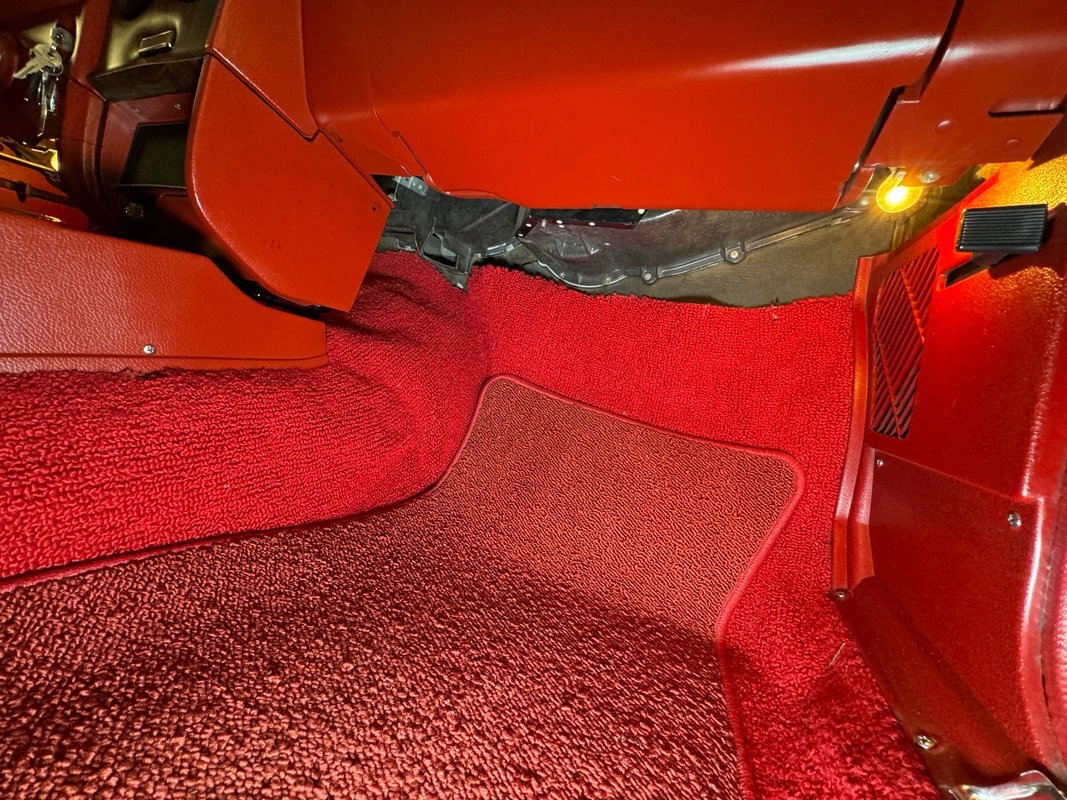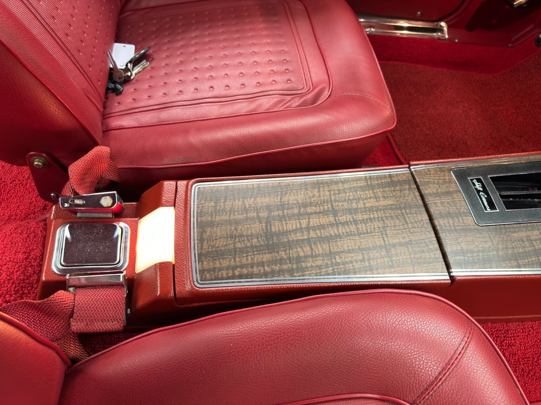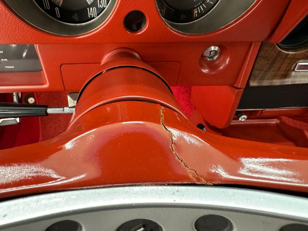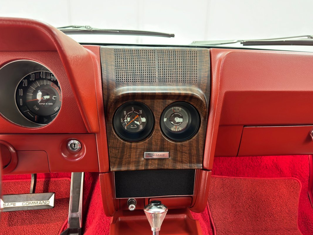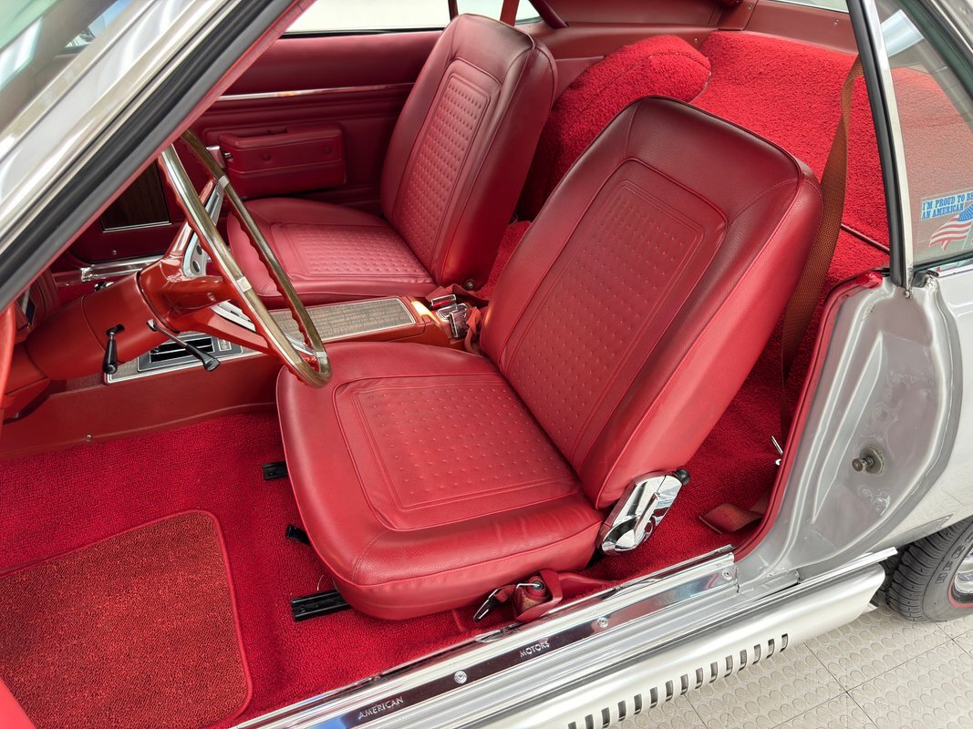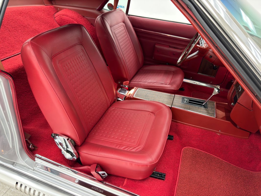 The interior restoration took place in 2010 and covered nearly every inch of the inside. Door panels were replaced with 1969 style reproductions from Legendary interiors. The 1968 version with the arrow shaped wood applique was not available in reproduction, so we have the straight wood panel in a red vinyl background. Step over new sill plates to find Legendary was also used for the seat covers of the only two seats in the car, buckets with textures inserts. The 3 spoke wood grain steering wheel has a crack in its base and is mounted on a tilt column now and leads to the red dashboard with black faced gauges from 1970. A woodgrain applique backed center stack houses more gauges of the optional Rally Package and the AMX numbered plate. Grains of the wood applique pick up again on the center console, also restored, and home to the trim metal shifter emerging from the "shift command" indicator plate, then on to the lid of the storage bin. Red looped carpet covers the floor with bright cleanliness and is also found in the rear of the car where the backseats would normally be found. The ribbed headliner which completes the fully red interior, is in great condition.