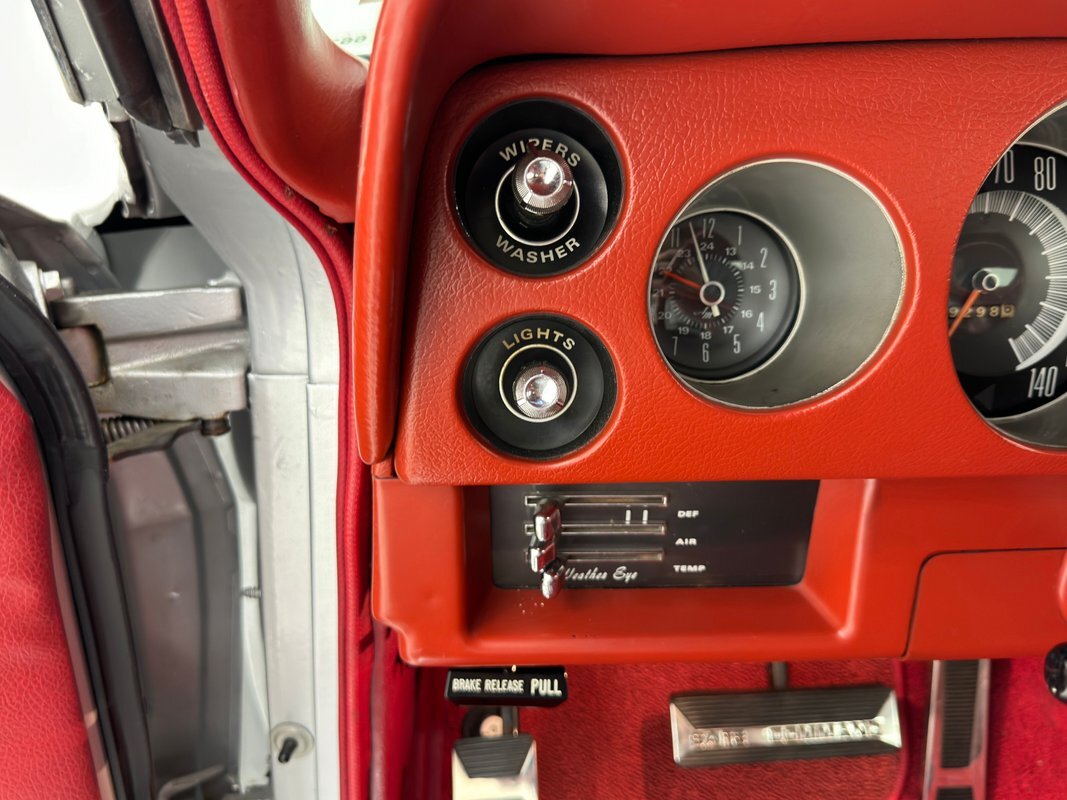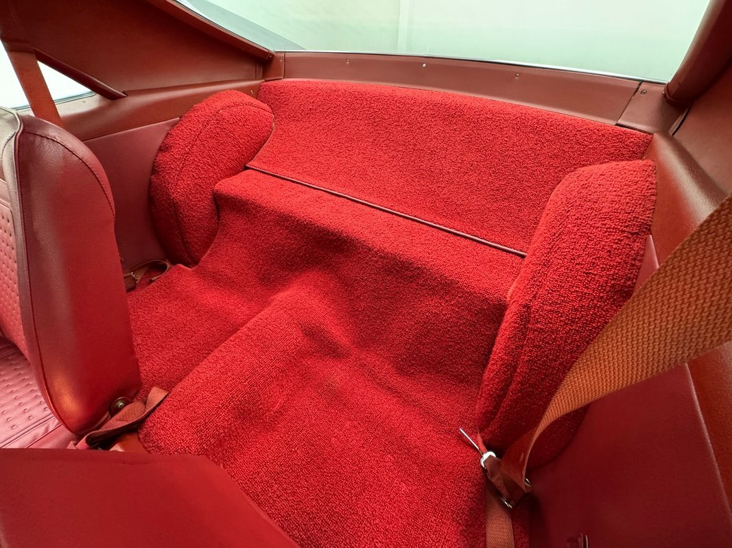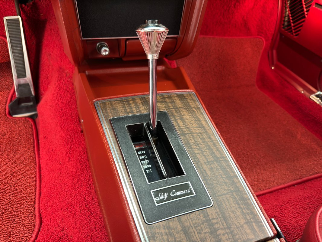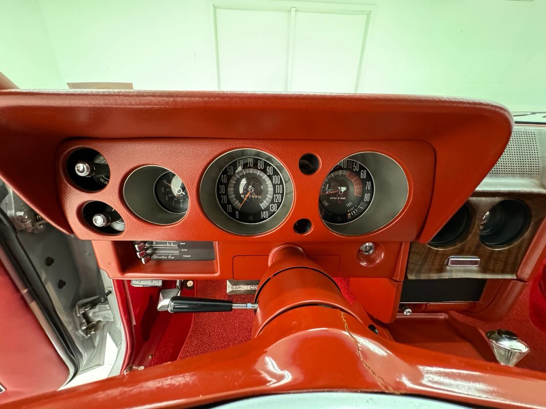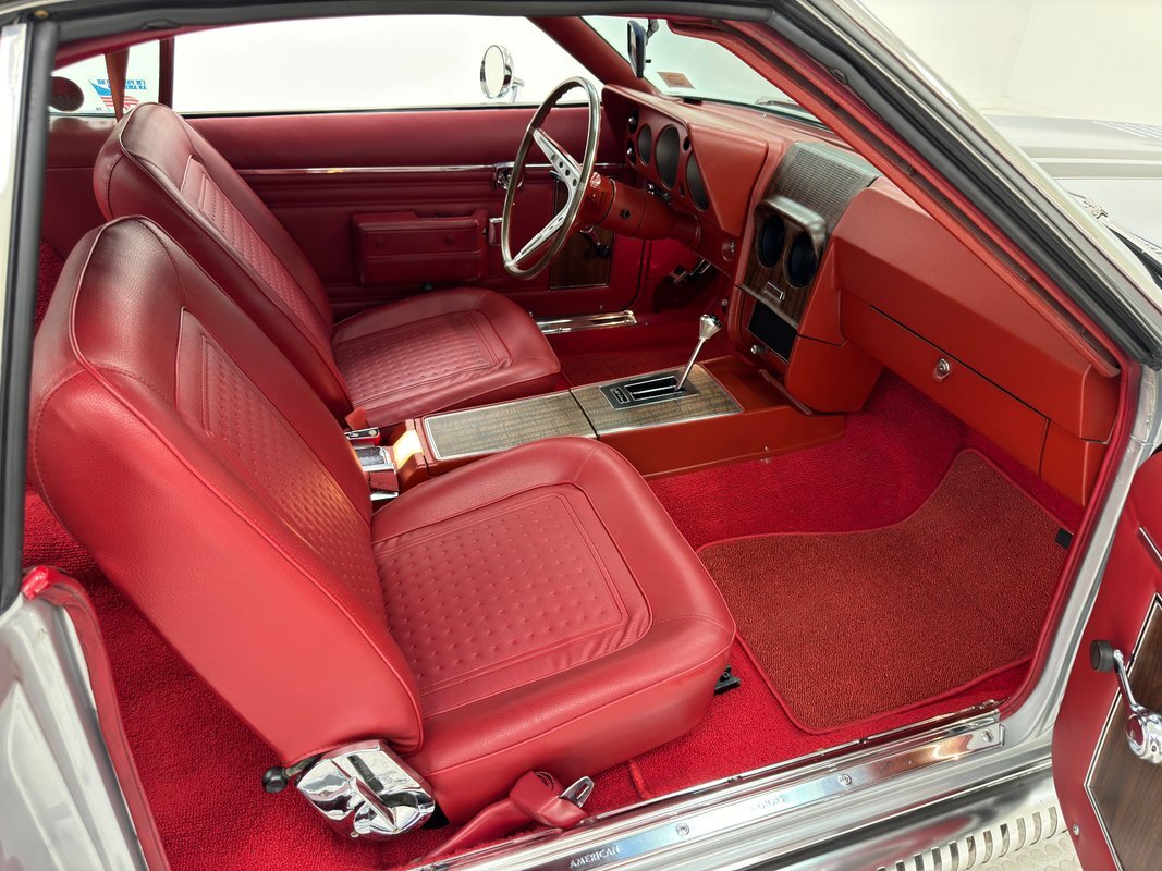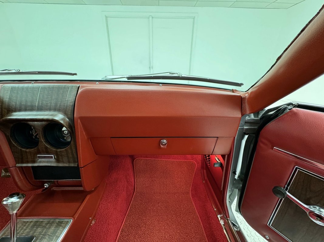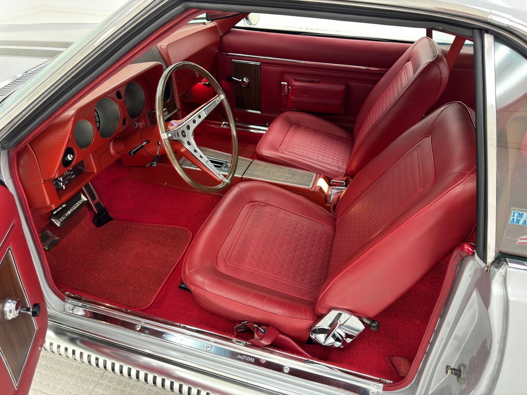 The interior restoration took place in 2010 and covered nearly every inch of the inside. Door panels were replaced with 1969 style reproductions from Legendary interiors. The 1968 version with the arrow shaped wood applique was not available in reproduction, so we have the straight wood panel in a red vinyl background. Step over new sill plates to find Legendary was also used for the seat covers of the only two seats in the car, buckets with textures inserts. The 3 spoke wood grain steering wheel has a crack in its base and is mounted on a tilt column now and leads to the red dashboard with black faced gauges from 1970. A woodgrain applique backed center stack houses more gauges of the optional Rally Package and the AMX numbered plate. Grains of the wood applique pick up again on the center console, also restored, and home to the trim metal shifter emerging from the "shift command" indicator plate, then on to the lid of the storage bin. Red looped carpet covers the floor with bright cleanliness and is also found in the rear of the car where the backseats would normally be found. The ribbed headliner which completes the fully red interior, is in great condition.