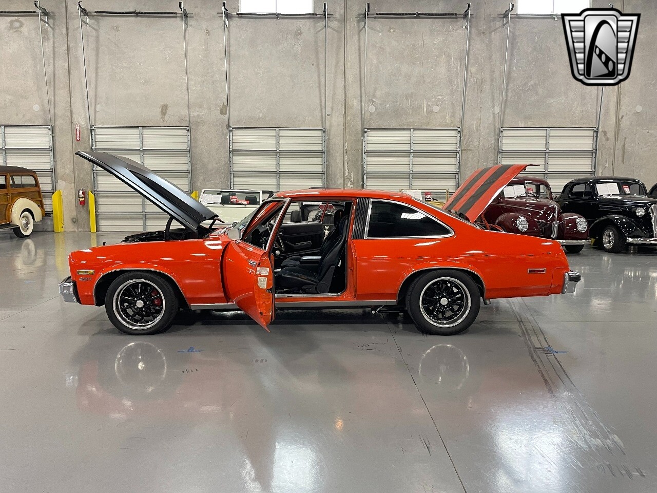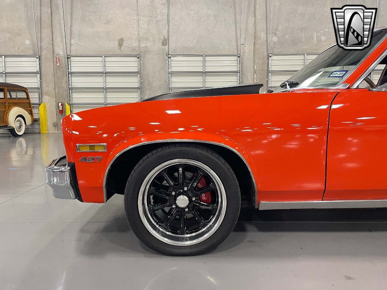 Gateway Classic Cars of San Antonio/Austin is proud to present this 1976 Chevrolet Nova. The car is refinished in orange with black stripes and a black B-pillar. Details include a cowl-induction hood, LED projection lights, tinted windows, 427 badging, and chrome bumpers. Under the hood, the Dart SHP 427ci V8 produced maximum outputs of 601 horsepower and 545 lb-ft of torque during a 2019 dynamometer run thanks to the help of Dart aluminum heads, Eagle crank, forged pistons, H-beam rods, Comp Cams solid roller cam and Harland Sharp rocker arms. Additional equipment includes a Holley carburetor, an Edelbrock intake manifold, an 8-quart oil pan, Chevrolet-branded aluminum valve covers, Hooker exhaust headers, ProFlow mufflers, an aluminum radiator with dual electric fans, and an MSD distributor, ignition box, and coil. Power is sent to the rear wheels through a Tremec five-speed manual transmission, and a Ford 9 rear end said to be fitted with a 4.30:1 Detroit TrueTrac limited-slip differential. The interior is fitted with aftermarket front bucket seats trimmed in black cloth and vinyl and are accompanied by a center console with storage and cupholders. Additional equipment includes a Hurst shifter, Chevrolet bow tie-branded floor mats, and an aftermarket stereo system with a Kenwood Bluetooth-capable head unit and a trunk-mounted Kicker amplifier and subwoofer. The 17 US Mags wheels are mounted with 225/45 front and 235/50 rear Michelin Pilot Sport tires. Suspension modifications include subframe connectors, CalTrac traction bars, and a SpeedTech front suspension with Viking coilovers. Wilwood brake calipers are mounted over cross-drilled and slotted rotors at all four corners. Don't miss the opportunity to own a piece of automotive history that delivers both style and performance..
