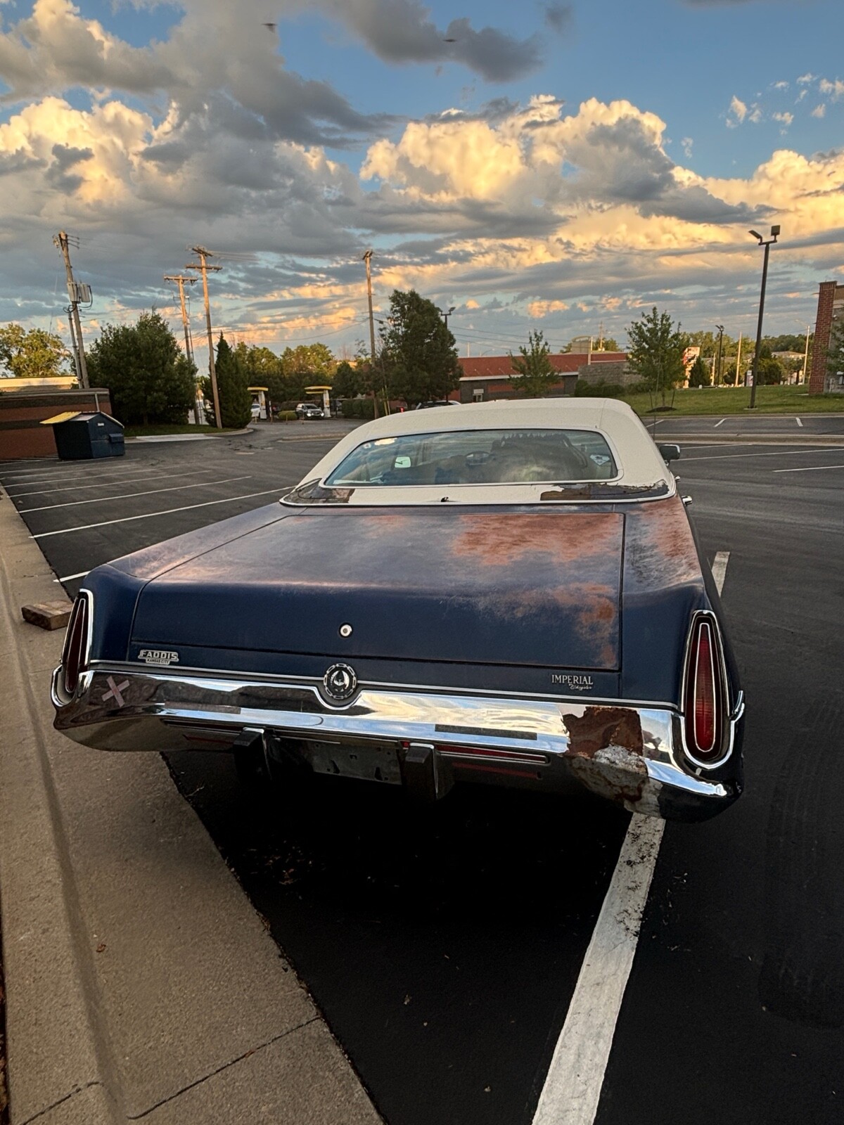 440 cu in V-8. 215 hp. The Imperial runs good but needs some TLC. There are 4 brand new tires, a new heavy-duty battery, cables, wipers, and alternator. The dashboard is in good condition as is the carpet and white-leather interior but with a tear on the driver's seat. No upholstery headliner. The driver's side electric windows work but not the passenger's side. It has some rust on exterior blue paint. Spare tire with jack. All the chrome is in tack with a vinyl top that has tearing at the back window. I don't think the car has been registered for several years because is not in the DMV database. I have the clean title. It is a Kansas car, located in Kansas City. I bought the car to drive as I've had other vintage cars but have since purchased another car. The Imperial is a conversation-starter with its unique 70s design and is said to be the longest American car.Seller's Notes