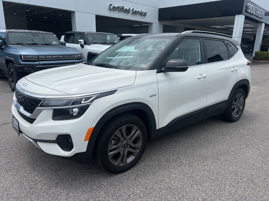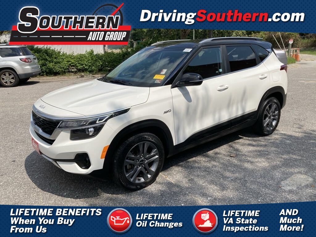 Certification Program Details: Southern Certified CARFAX One-Owner. Clean CARFAX. Certified. Clear White/Black Roof 2022 Kia Seltos S AWD CVT 2.0L I4 MPI AWD/4WD, ALUMINUM WHEELS, BACKUP CAMERA, BLUETOOTH, NAVIGATION SYSTEM, PREMIUM WHEELS, KEYLESS ENTRY, NAVIGATION, APPLE ANDROID CARPLAY, PUSH BUTTON START, 6 Speakers, ABS brakes, Air Conditioning, Alloy wheels, AM/FM radio: SiriusXM, Auto High-beam Headlights, Automatic temperature control, Brake assist, Bumpers: body-color, Cloth & Sofino Premium Leatherette Seat Trim, Delay-off headlights, Dual front impact airbags, Dual front side impact airbags, Electronic Stability Control, Emergency communication system: 911 Connect, Four wheel independent suspension, Front anti-roll bar, Front Bucket Seats, Front Center Armrest, Front fog lights, Front reading lights, Fully automatic headlights, Heated door mirrors, Heated front seats, Illuminated entry, Leather Shift Knob, Low tire pressure warning, Navigation System, Occupant sensing airbag, Outside temperature display, Overhead airbag, Overhead console, Panic alarm, Power door mirrors, Power steering, Power windows, Radio: AM/FM/MP3 Display Audio w/Navigation, Rear window defroster, Remote keyless entry, Roof rack: rails only, Security system, Speed control, Speed-sensing steering, Split folding rear seat, Spoiler, Steering wheel mounted audio controls, Telescoping steering wheel, Tilt steering wheel, Traction control, Trip computer, Turn signal indicator mirrors, Wheels: 17 Alloy w/Dark Gray Finish.