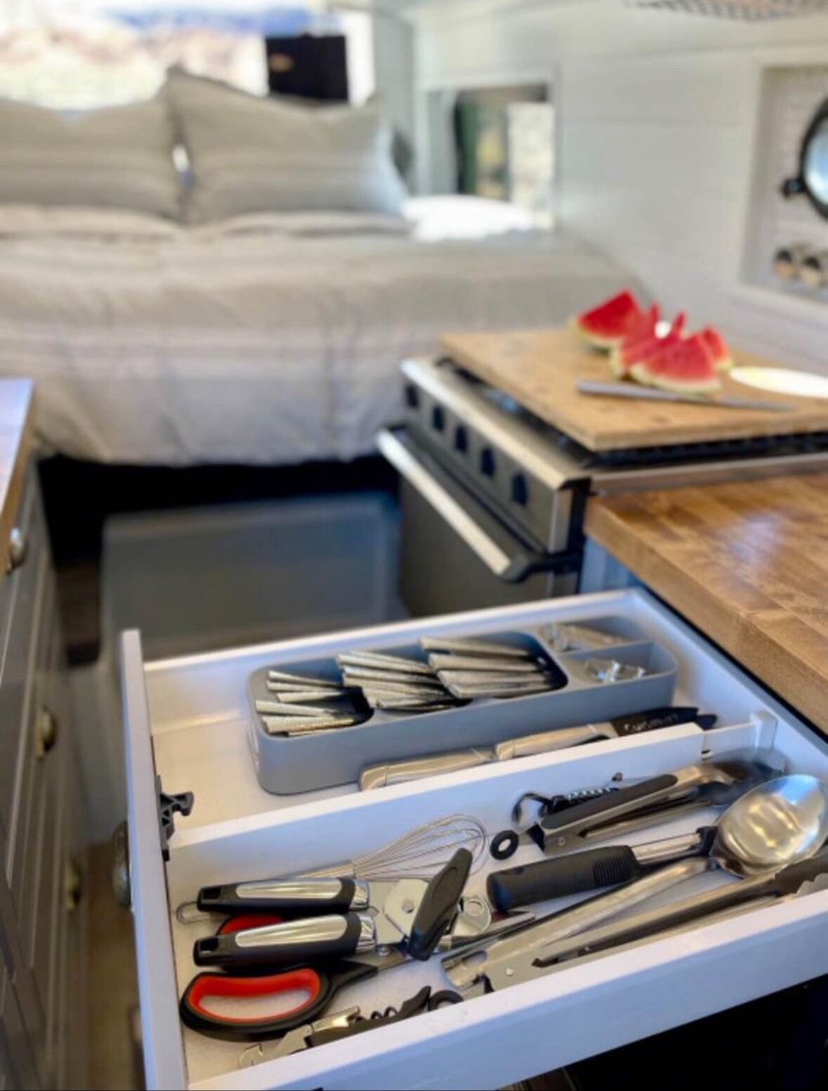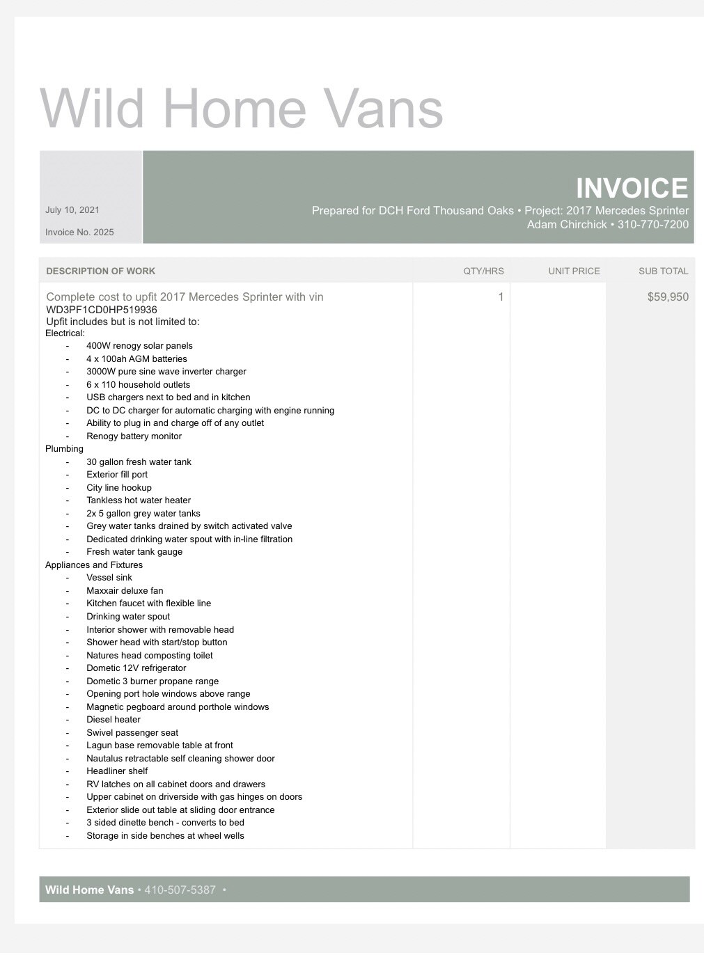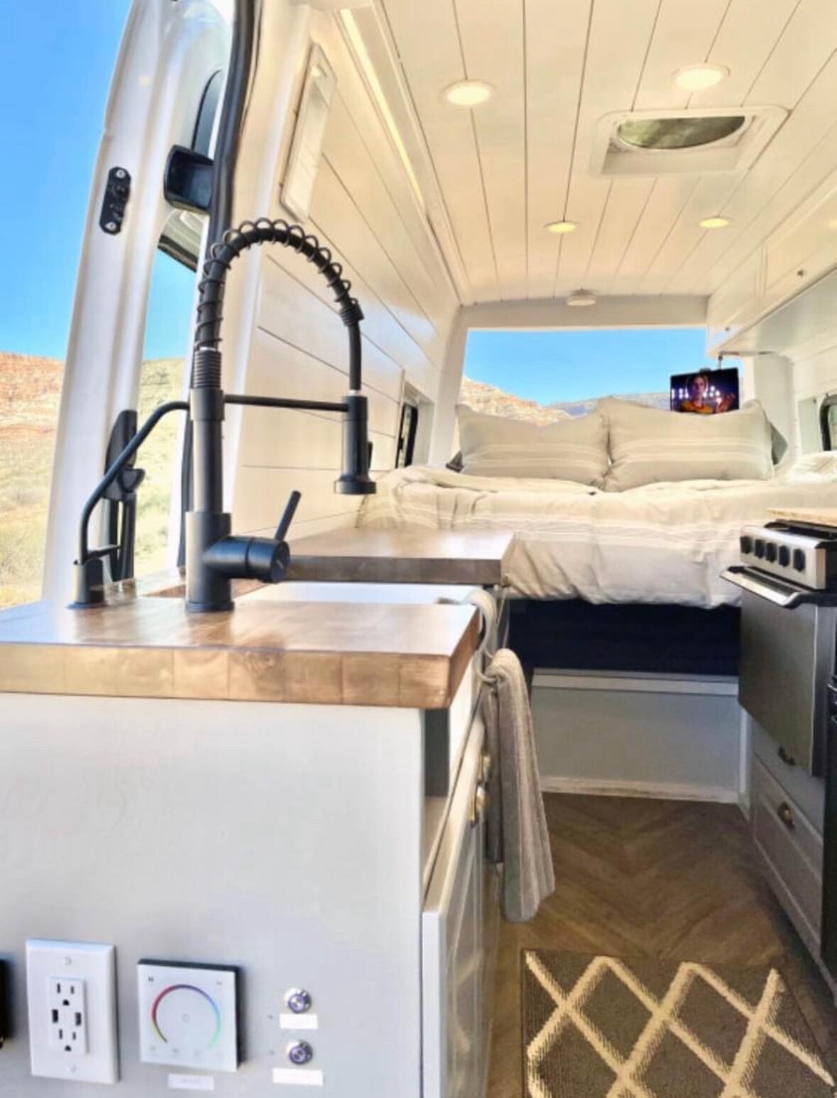 This fully off grid home on wheels has everything you need. It features a full solar system with 400AH of battery backup, multiple charging methods and ample standard household/usb outlets running off of a 3000W inverter. For water, the van has a 30 gallon fresh water tank to supply the kitchen sink, filtered water, and two showers. The van has instant hot water-- no waiting. The kitchen features an upright 12V refrigerator, a 3 burner propane range and plenty of counter space. I have a full list of more details that I can’t put here if anybody’s interest
