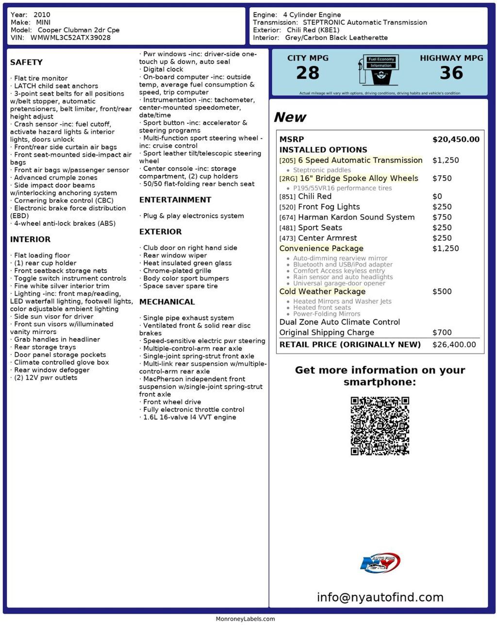 Take a look at this 2010 Chili Red MINI Cooper Clubman with Gray/Carbon Black Leatherette Interior, a Clean Carfax and only 112,414 miles. This car has everything to love. It has fantastic options, a clean history, relatively low mileage and looks that will impress. It's a car that anyone would be extremely excited to get into. It comes equipped with a 1.6L 4-cylinder engine paired to a 6-speed Automatic Transmission, Convenience Package (Bluetooth and USB, Rain Sensor and Automatic Headlights, Auto-Dimming Rearview Mirror, Comfort Access Keyless Entry, Universal Garage Door Opener), Cold Weather Package (with Heated Front Seats, Power-Folding Mirrors, Heated Mirrors and Washer Jets), 16 Bridge Spoke Alloy Wheels, Front Fog Lights, Harman Kardon Sound System, Sport Seats, Center Armrest, Automatic Climate Control, Cruise Control, Steering Wheel Controls, AM/FM Radio, Power Windows, Power Locks, Air Conditioning and so much more. Every NY Auto Find vehicle comes with a complimentary Limited Warranty and a Carfax Vehicle Report. Our vehicles are priced to sell quickly. Please call to check availability and to schedule an appointment. -