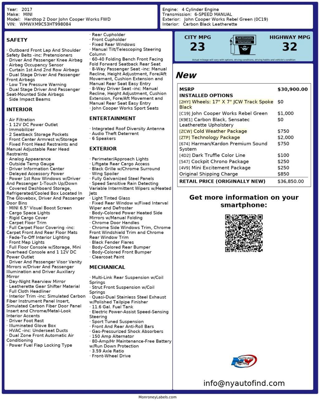Take a look at this John Cooper Works Rebel Green 2017 MINI Cooper John Cooper Works with Carbon Black Leatherette Interior and a Clean Carfax. This is one of those cars that just stops you in your tracks. It has show stopper looks with its JCW customization and it also has a clean history and spectacular options, so do not hesitate to claim this car for your own. It's truly amazing. It comes equipped with a 2.0L 4-cylinder Engine paired to a 6-speed Manual Transmission, Technology Package (with Navigation System, MINI Connected XL, Real Time Traffic Information, Rear Park Distance Control, Rear View Camera, 8.8 Widescreen and MINI Controller, Wired Package), Cold Weather Package (with Heated Front Seats, Auto-Dimming Rearview Mirror, Power-Folding Exterior Mirrors, Auto-Dimming Interior and Exterior Mirrors), 17 JCW Track Spoke Black Wheels, JCW Rebel Green Color, Harman/Kardon Premium Sound System, Dark Truffle Color Line, Cockpit Chrono Package, MINI Excitement Package, Cruise Control, Steering Wheel Controls, AM/FM Radio, Power Windows, Power Locks, Air Conditioning and so much more. Every NY Auto Find vehicle comes with a complimentary Limited Warranty and a Carfax Vehicle Report. Our vehicles are priced to sell quickly. Please call to check availability and schedule an appointment. -
