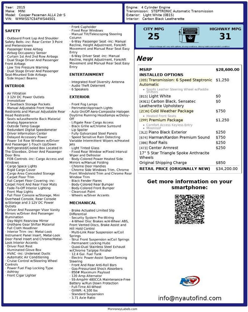 Take a look at this 2015 Light White MINI Cooper Paceman S ALL4 with Carbon Black Leatherette Interior. This car is ready for any weather conditions with its Cold Weather Package and All Wheel Drive system. It also has plenty of other amazing options, awesome wheels and very attractive looks. It comes equipped with a 1.6L 4-cylinder engine paired to a 6-speed Automatic Transmission, Premium Package (with Sunroof, Comfort Access Keyless Entry), Cold Weather Package (with Heated Front Seats), Harman/Kardon Premium Sound System, Roof Rails, Piano Black Exterior, Center Armrest, 17 5-star Triangle Spoke Anthracite Wheels, Cruise Control, Steering Wheel Controls, AM/FM Radio, Power Windows, Power Locks, Air Conditioning and so much more. Every NY Auto Find vehicle comes with a complimentary Limited Warranty and a Carfax Vehicle Report. Our vehicles are priced to sell quickly. Please call to check availability and to schedule an appointment. -