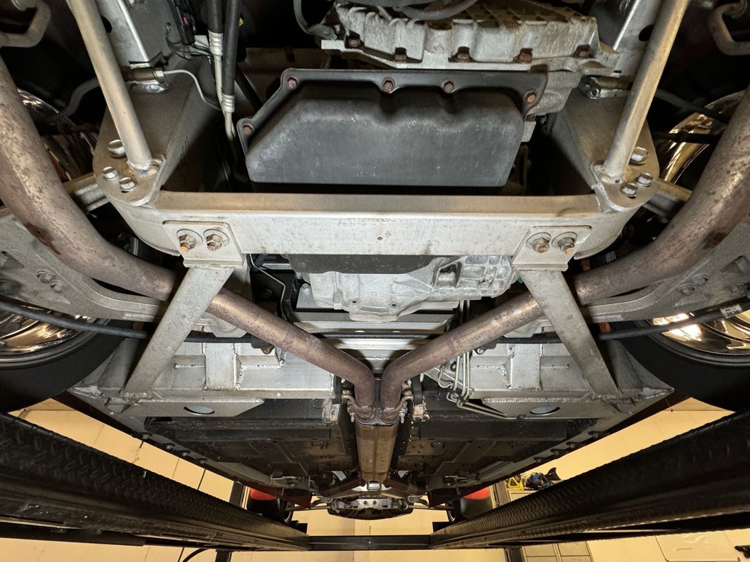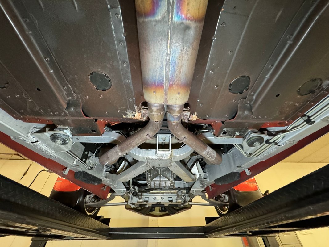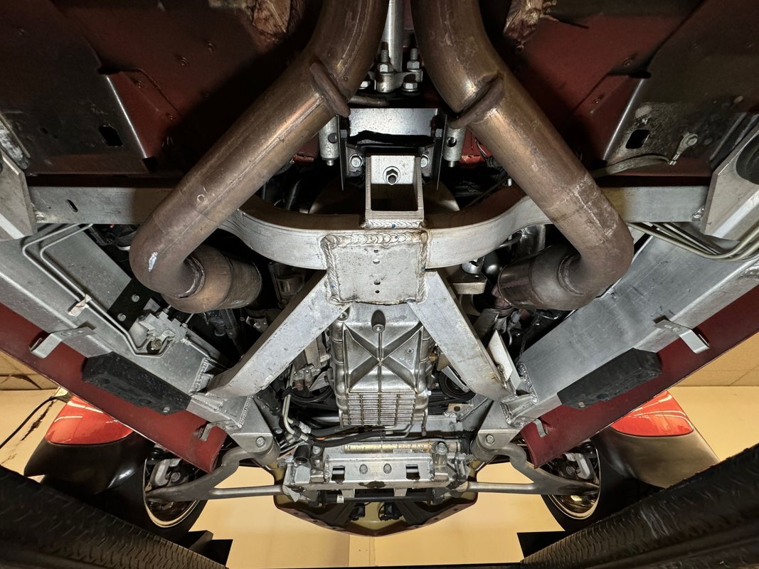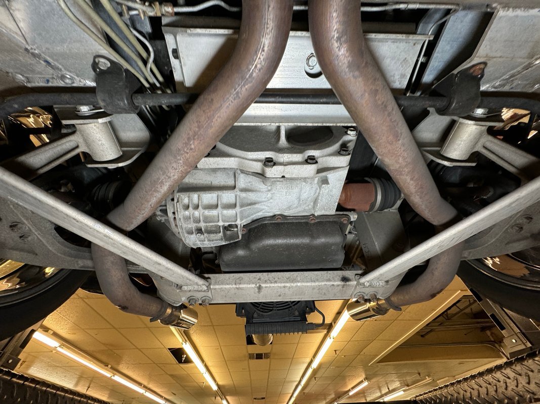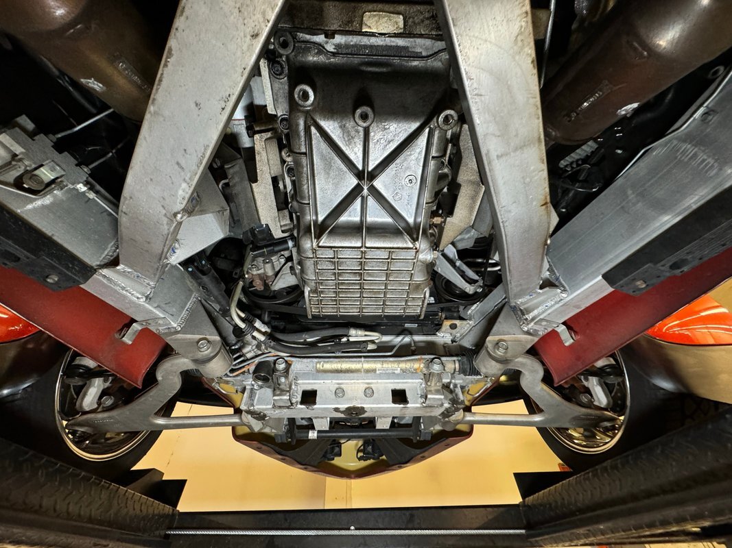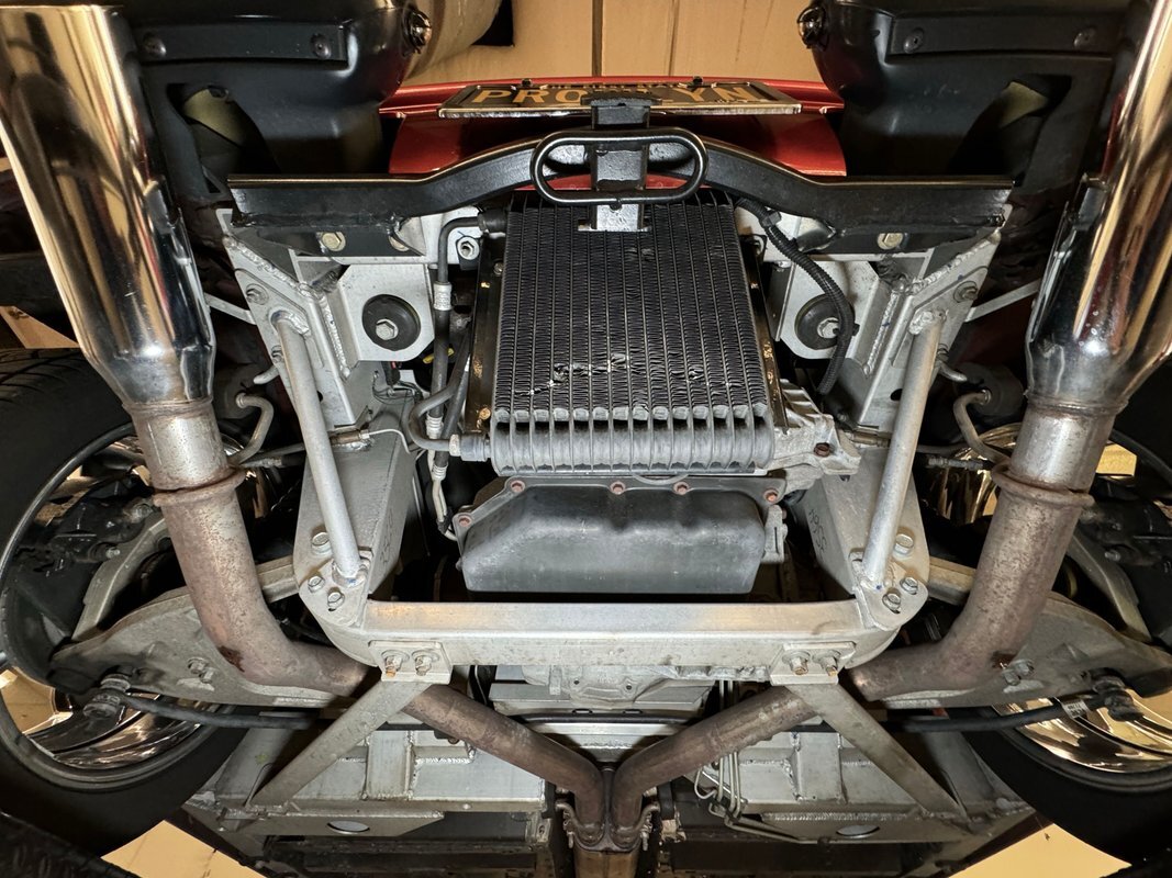 Very clean underneath as we take note of the tubular aluminum chassis and the dual exhaust which travels the length of the car and after some original equipment mufflers, heads out back in an epic, slightly upturned tail pipe display. There's no surface rust nor oil leaks anywhere, just some signs of light usage and no damage whatsoever. Coil over suspension is found front and rear.