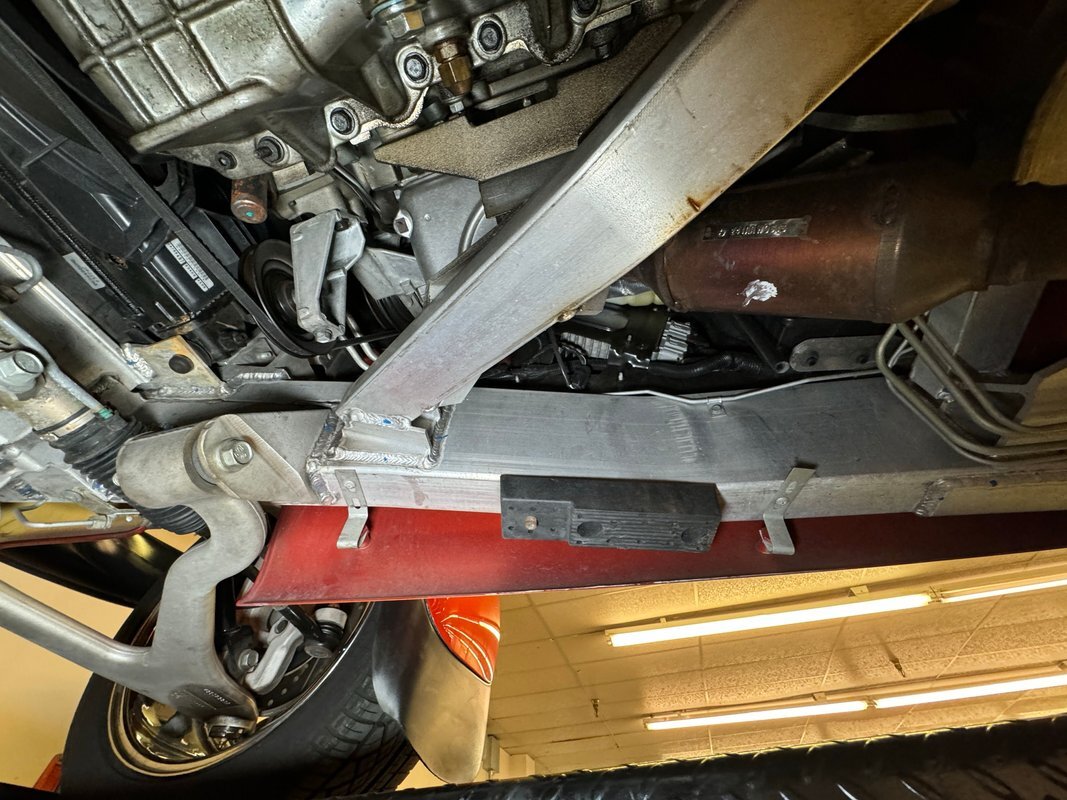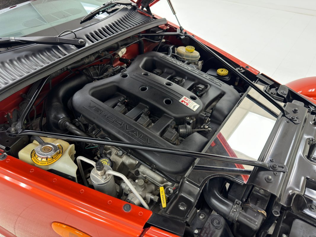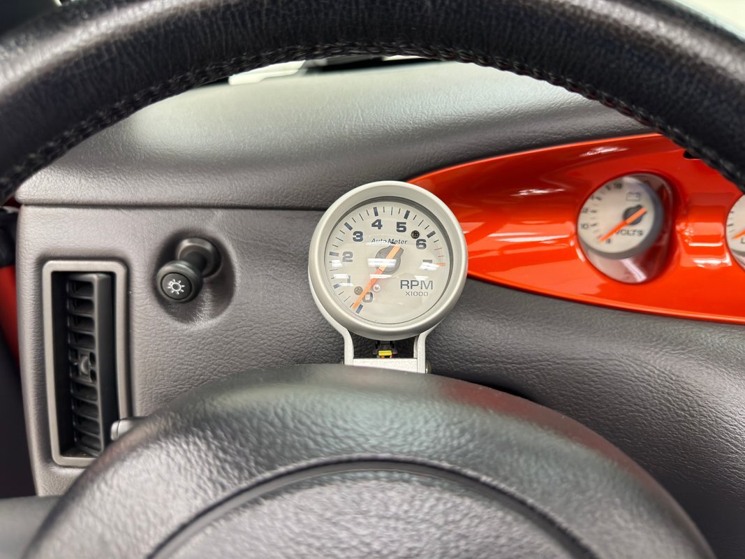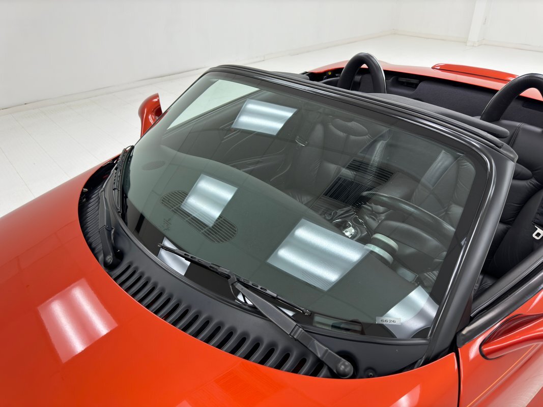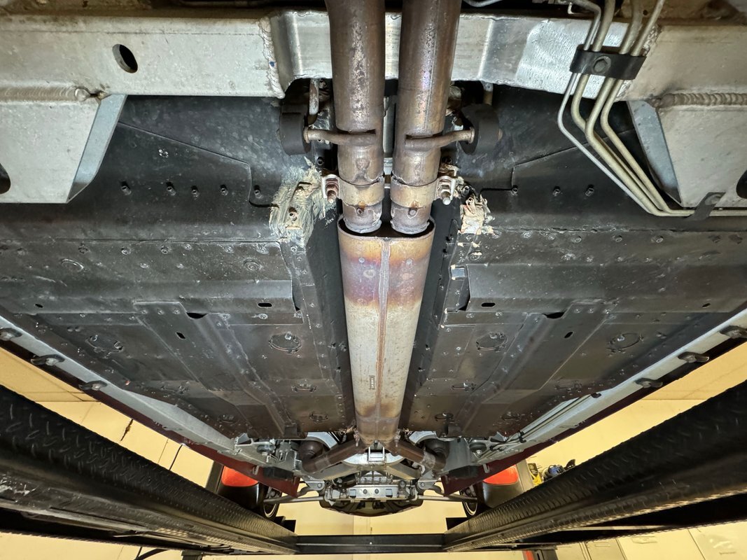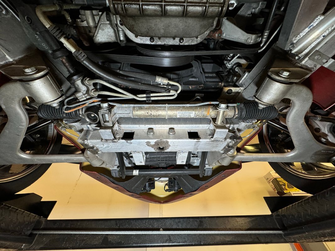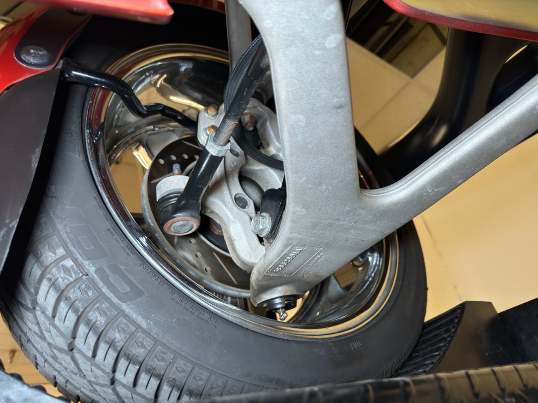 Very clean underneath as we take note of the tubular aluminum chassis and the dual exhaust which travels the length of the car and after some original equipment mufflers, heads out back in an epic, slightly upturned tail pipe display. There's no surface rust nor oil leaks anywhere, just some signs of light usage and no damage whatsoever. Coil over suspension is found front and rear.