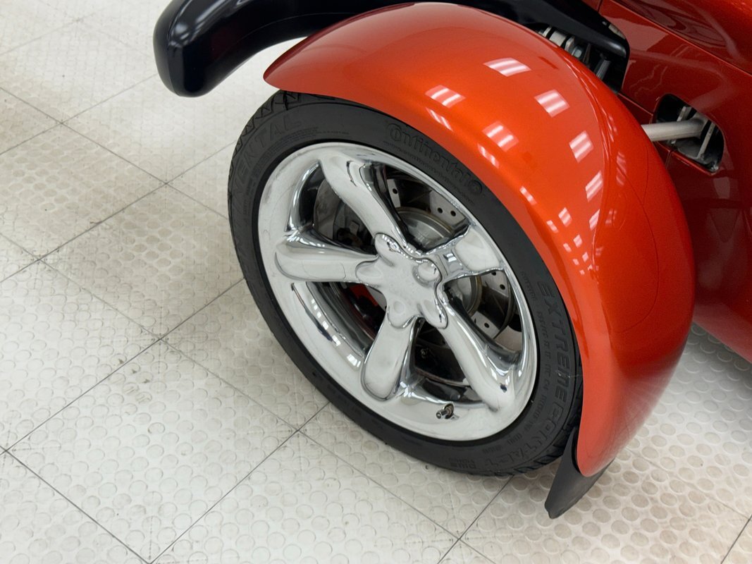 In that same article, the Prowler orange was compared to chili oil and if you google images, that comes close to describing this deep translucent hue of burnt orange. The narrow eyed Prowler has open front wheels, part of its exotic offering, with body keyed fenders that turn with the wheels. Up front and contrasting are the Federally mandated bumpers in black, which coordinate well with the black canvas top and the black gravel guards on the flared rear fender flares. The steeply raked windshield creates a low roof and a chopped hot rod vibe while the staggered size chrome 5 spoke wheels present a raked stance on a low riding skate with low profile tires. The wheels are a full 3" in difference with 20's out back and 17's in front, and the tires are of different width which becomes obvious when you follow this car and its super wide back end, underlined by bumpers and with most real estate taken up by the rounded trunk lid. Dual exhaust looks aggressive out back, and the flush wrap around tail lights give instant cues of a modern car. The canvas top, wheels, and paint are excellent on the car and the only imperfection we found was some scrapes under the chin, and we didn't see that until we put it on the lift!