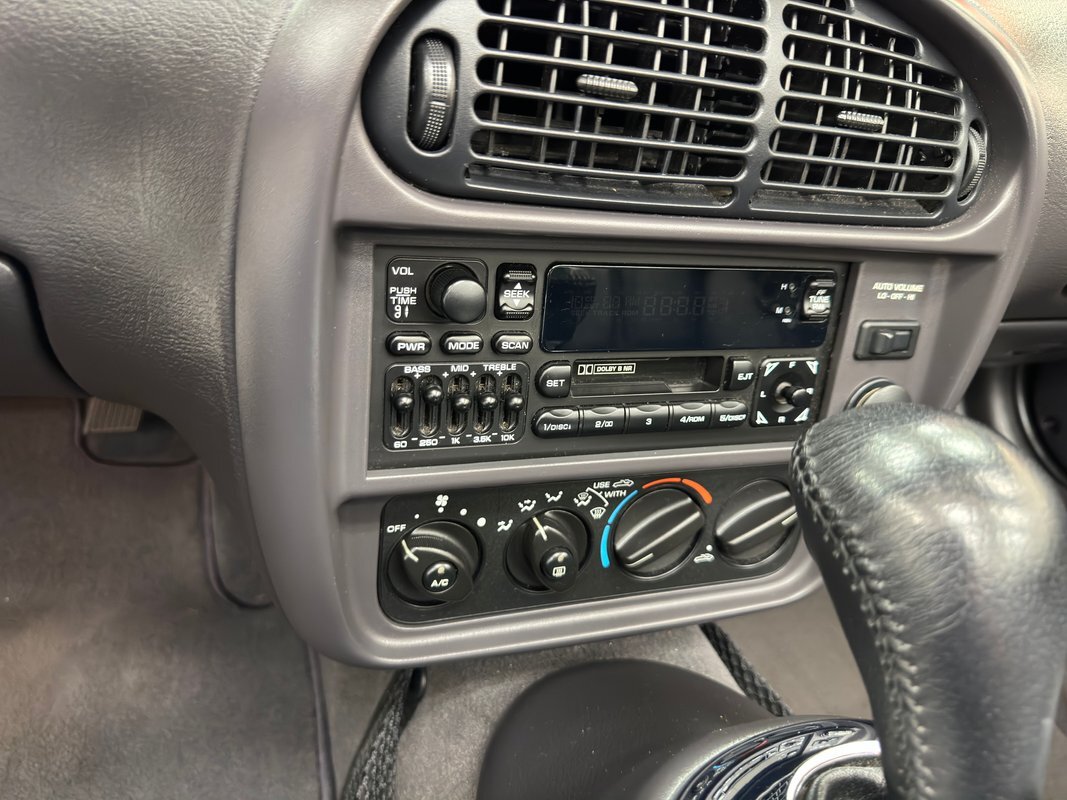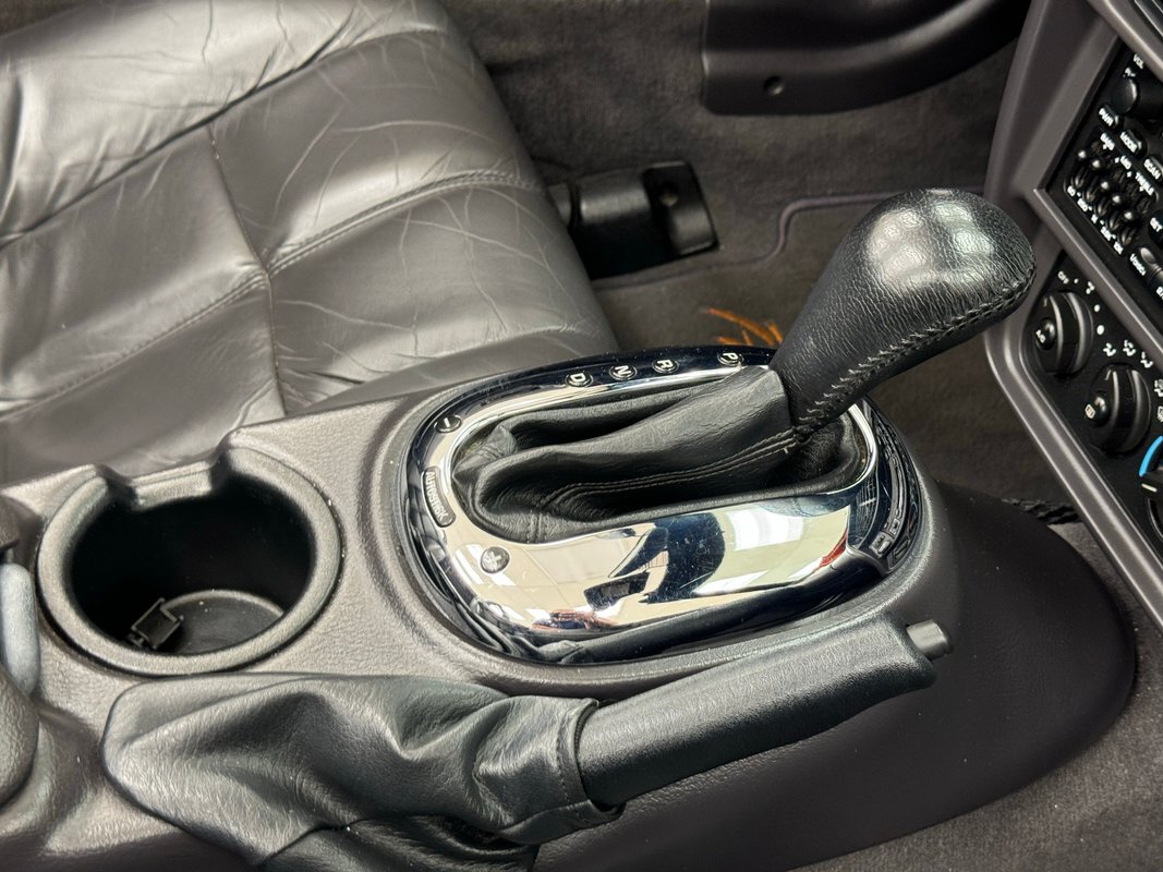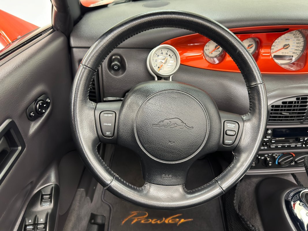 The bad boy exterior gives way to a clean and practical interior that starts with smooth door panels dressed in black plastic and leather, understated and clean. Padded and stitched leather bucket seats reveal a bit more style with bar style tops and the Prowler, a big cat of some kind, embossed on the seat back. That cat shows up again on the steering wheel which is leather wrapped and shares the column with an AutoMeter tachometer. The factory gauge cluster is housed in a color keyed skateboard shaped plastic housing in the center of the dash, old school hot rod style. Molded plastic makes up the remaining dash and has an integrated AM/FM/Cassette radio with EQ and simple climate controls. A little bit of flash is found on the base plate of the shifter in the center console which is mirror-like chrome, while a built in cupholder nearby lets you know you're not in the 50's anymore. Low pile charcoal carpet nicely covers the floor and under the rear hatch where the canvas top is stored.