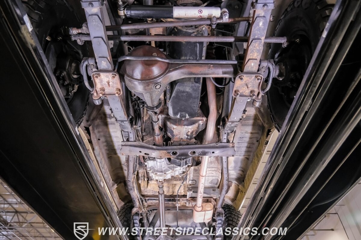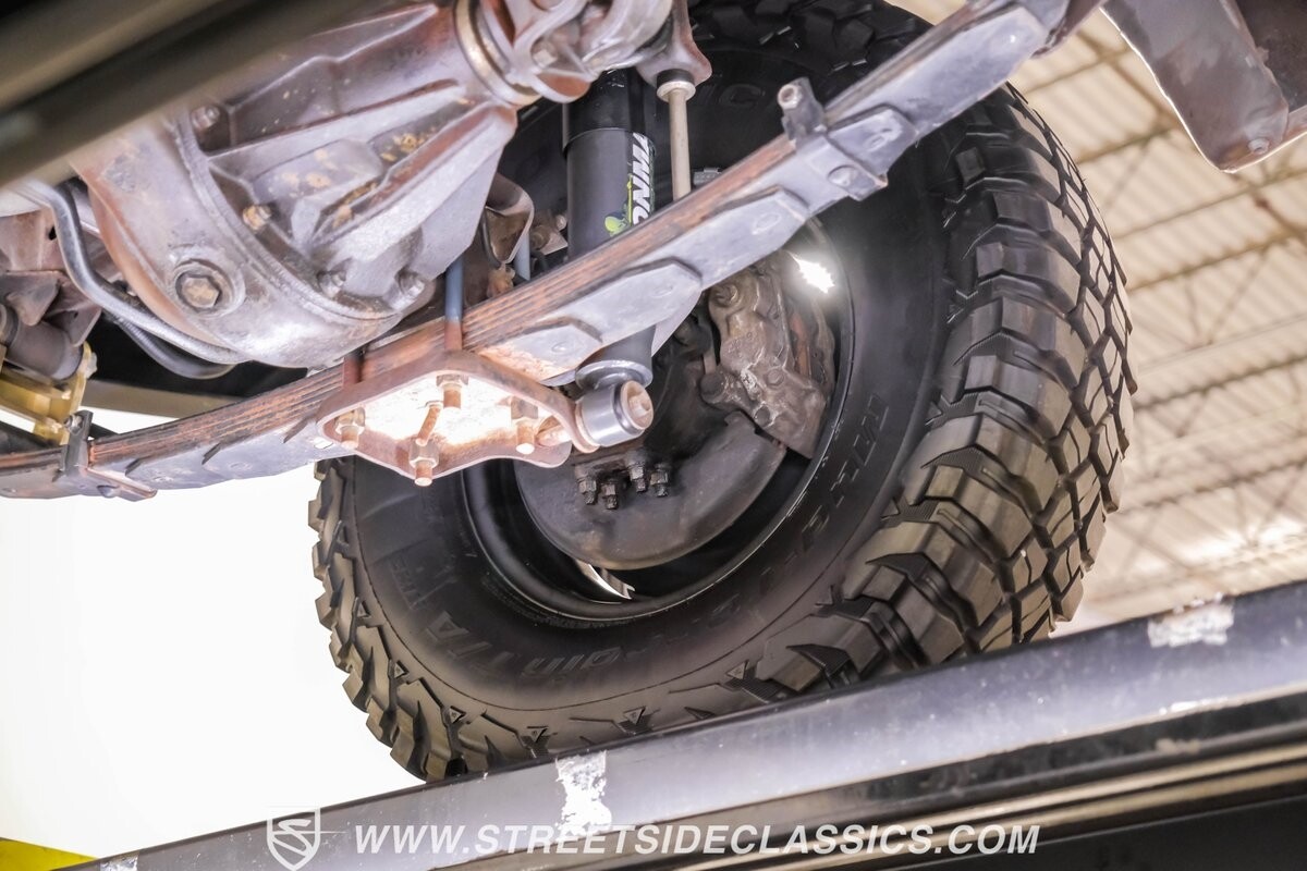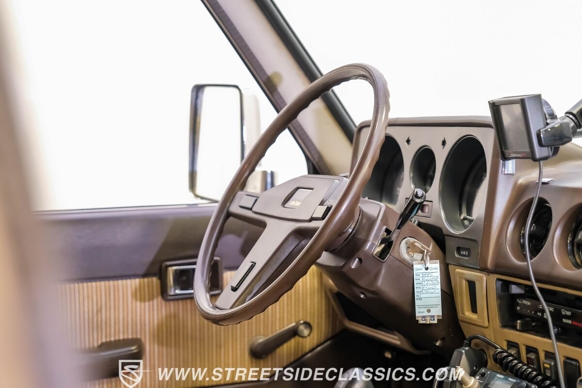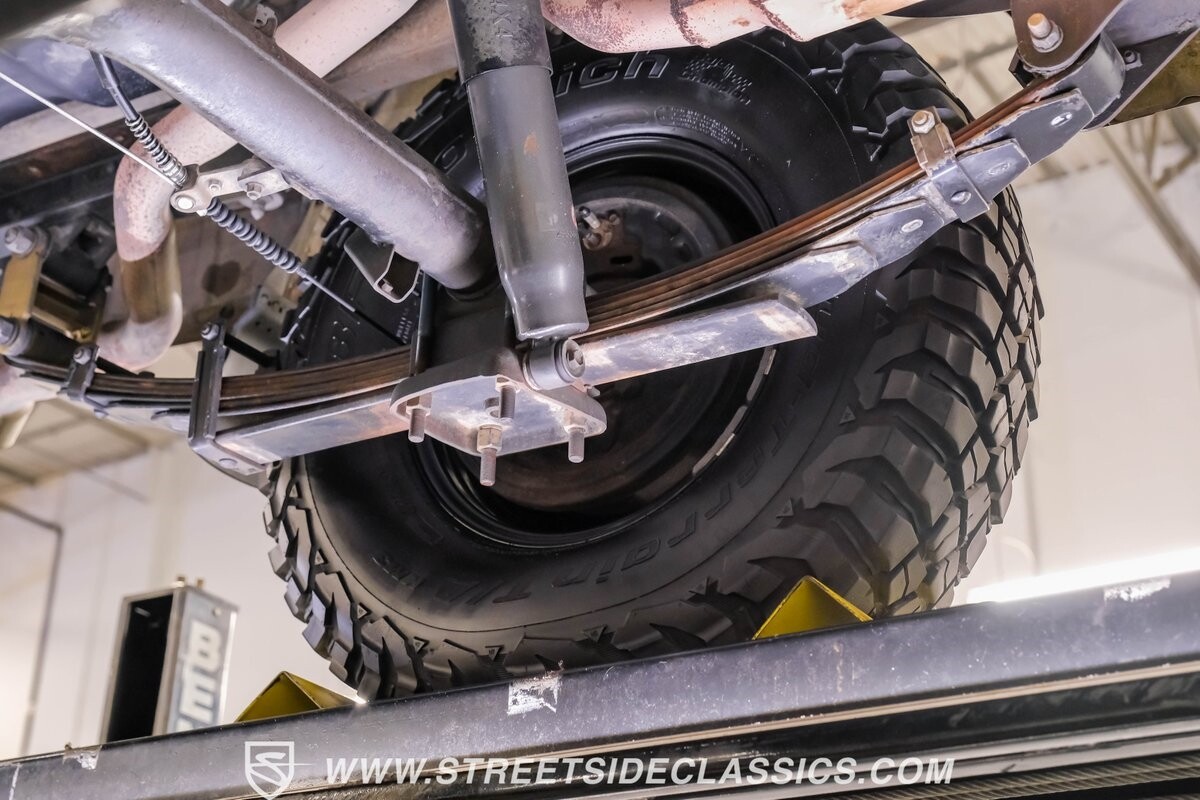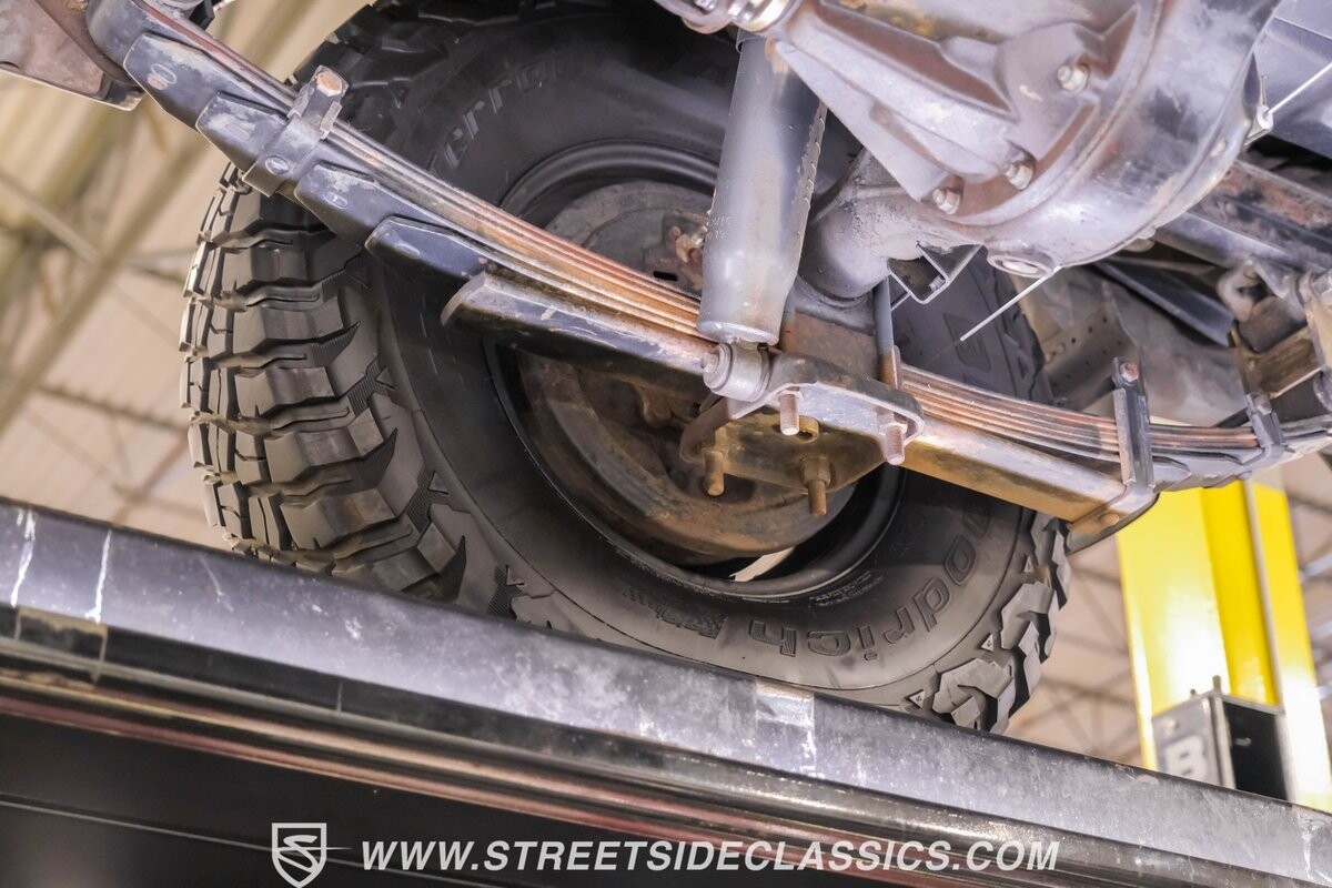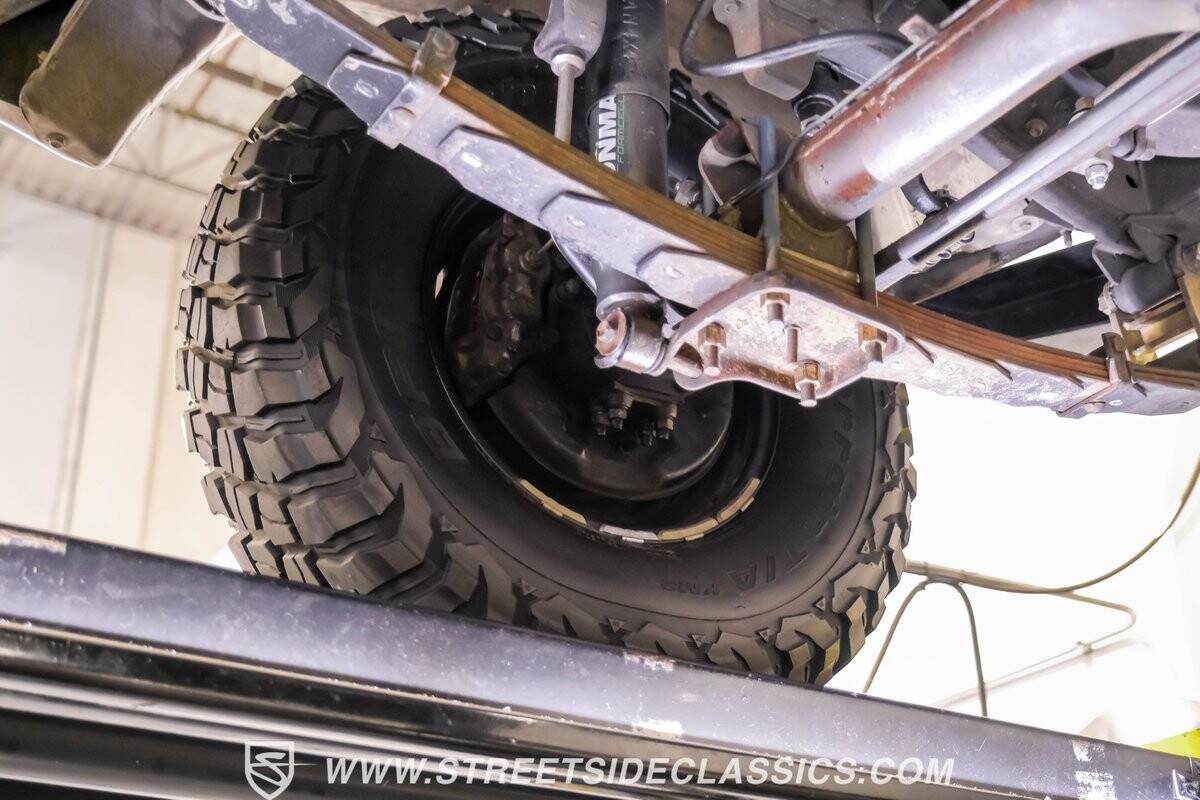 Steel 16-inch City Racer wheels are mounted with 255/85-16 BF Goodrich Mud-Terrain T/A KM2 tires and a matching spare is affixed to the swing-away rear carrier. The front axle is equipped with Aisin manually locking hubs and the truck rides on an Ironman Foam Cell suspension lift kit with Cool Cruiser HFS shackles. A Redhead steering gearbox has been fitted and the front disc and rear drum brakes were overhauled as part of the refurbishment. The front steering knuckles were rebuilt, and the tie rod ends were replaced in October 2021.