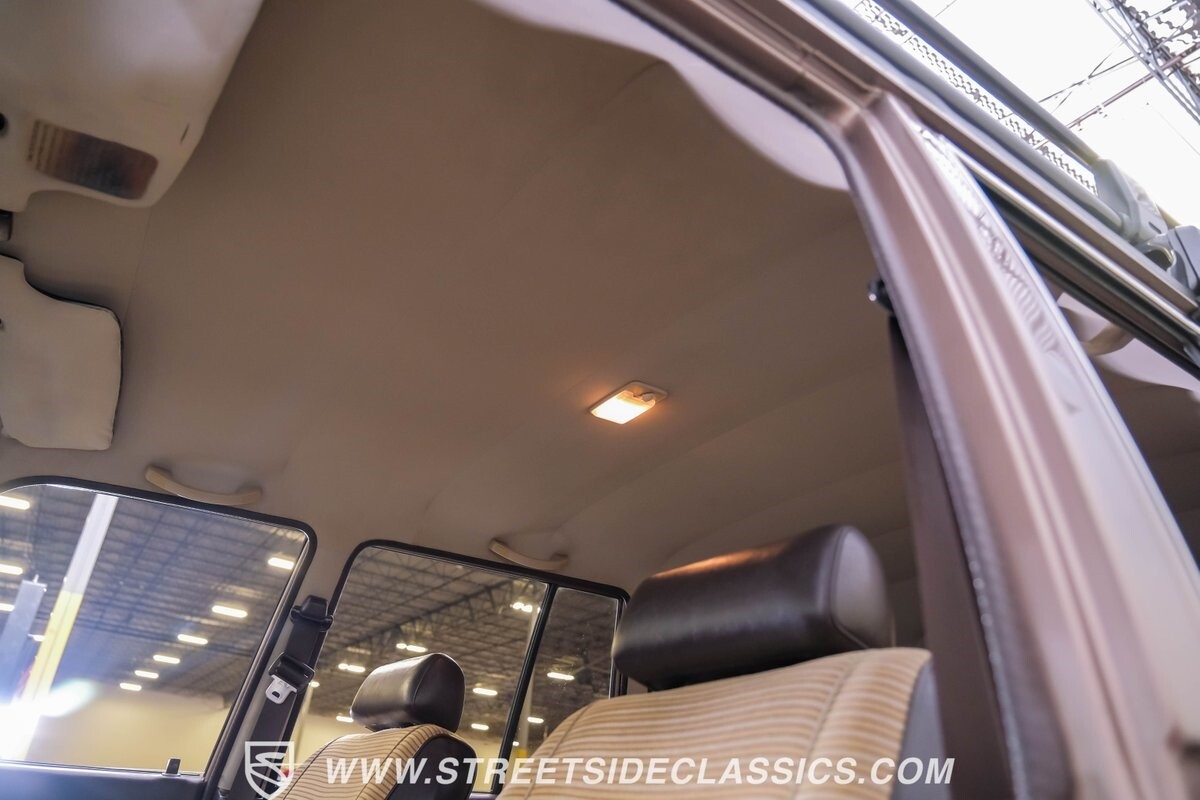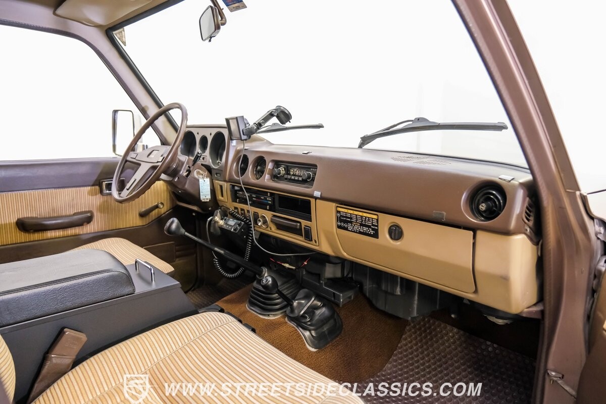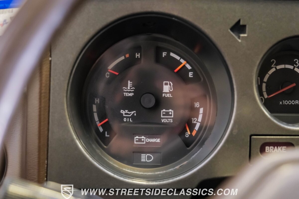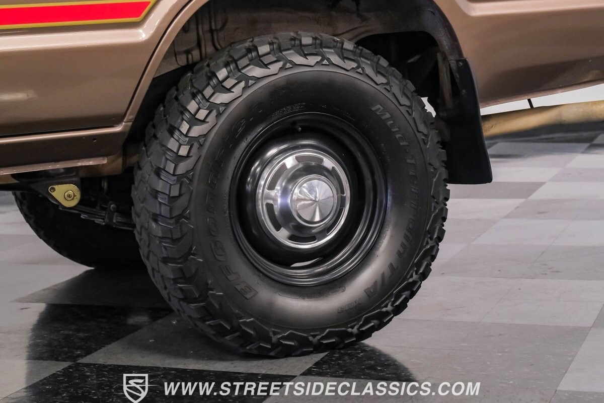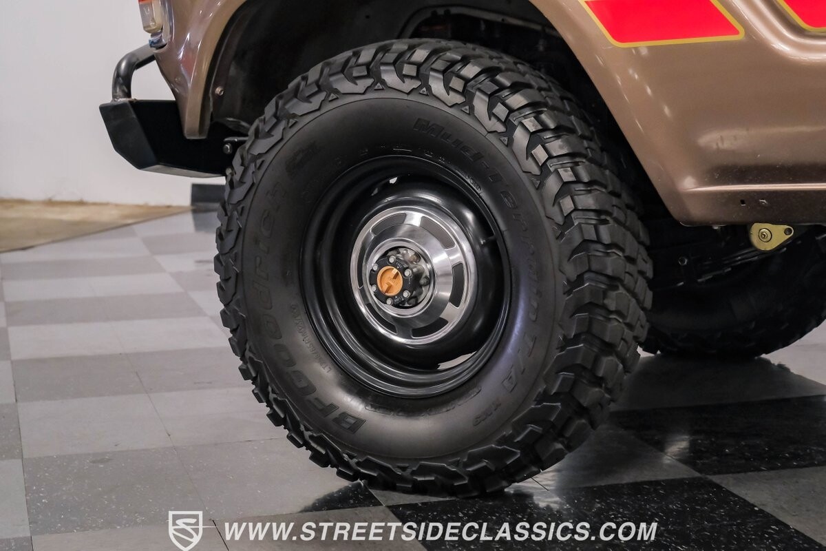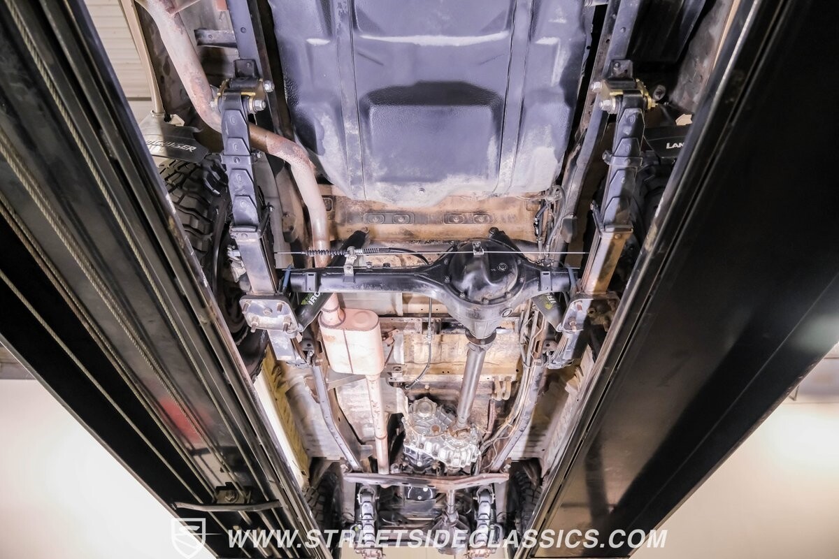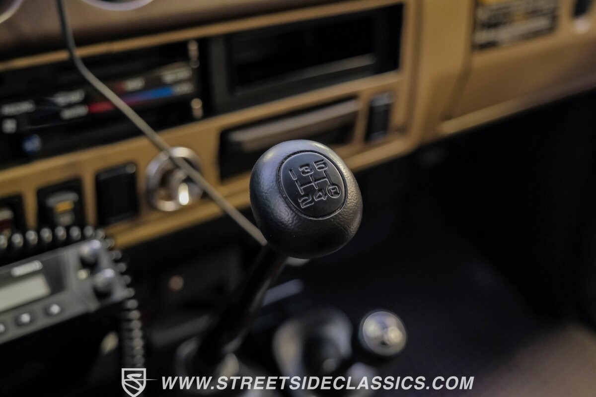 Steel 16-inch City Racer wheels are mounted with 255/85-16 BF Goodrich Mud-Terrain T/A KM2 tires and a matching spare is affixed to the swing-away rear carrier. The front axle is equipped with Aisin manually locking hubs and the truck rides on an Ironman Foam Cell suspension lift kit with Cool Cruiser HFS shackles. A Redhead steering gearbox has been fitted and the front disc and rear drum brakes were overhauled as part of the refurbishment. The front steering knuckles were rebuilt, and the tie rod ends were replaced in October 2021.