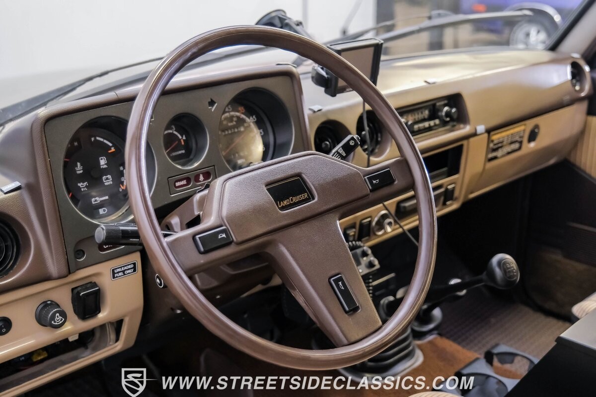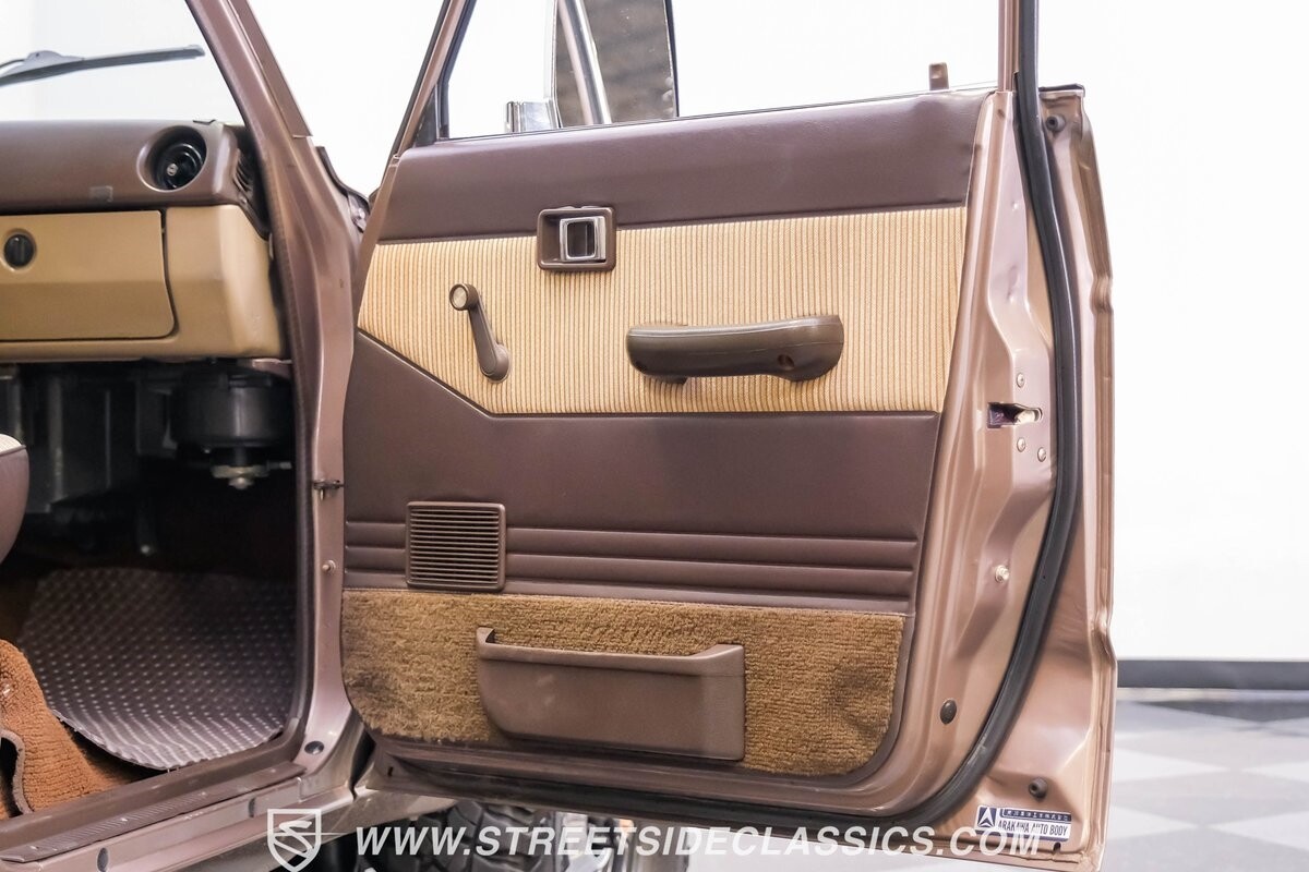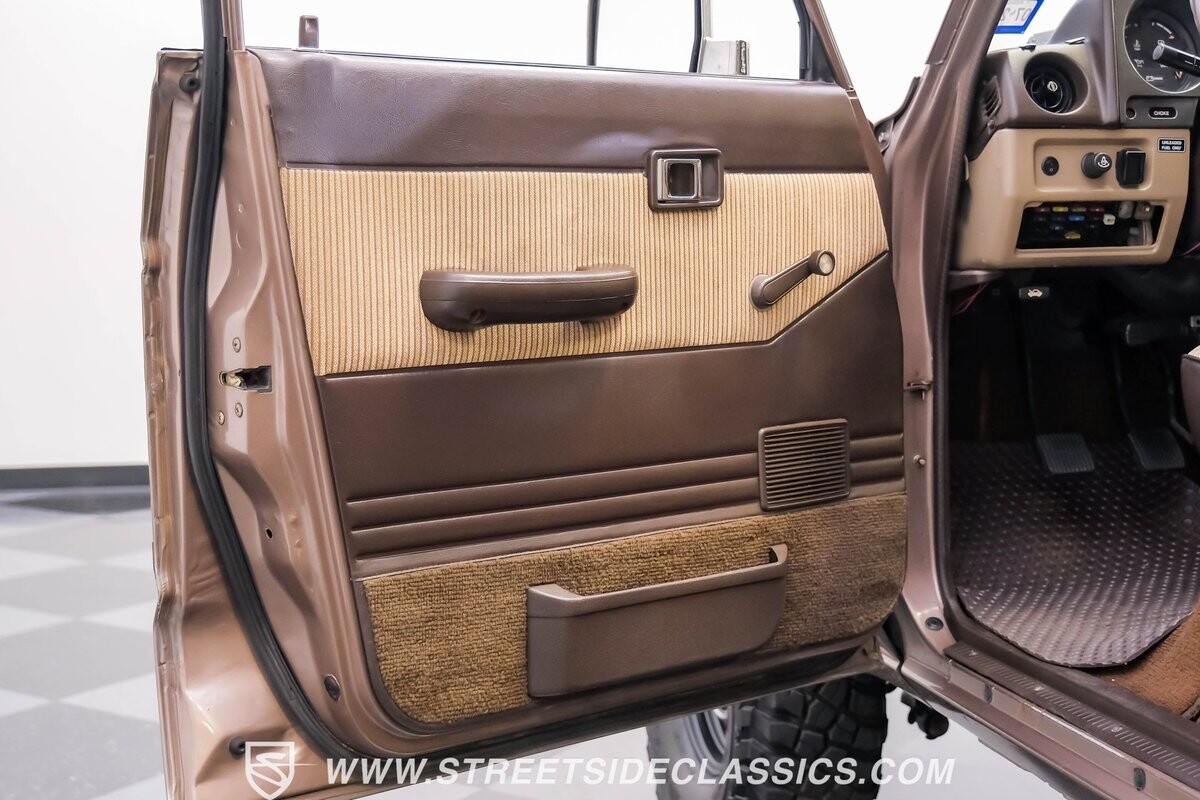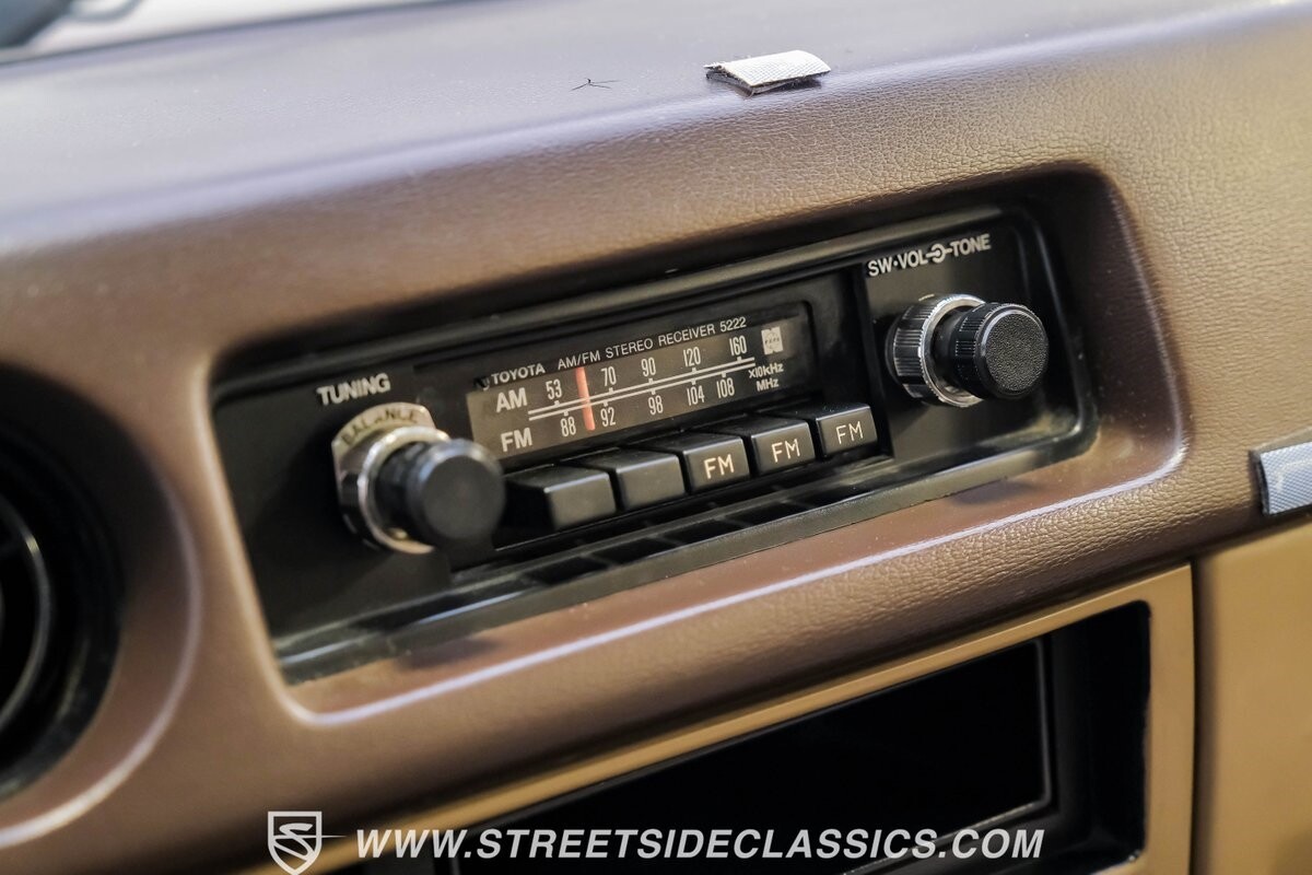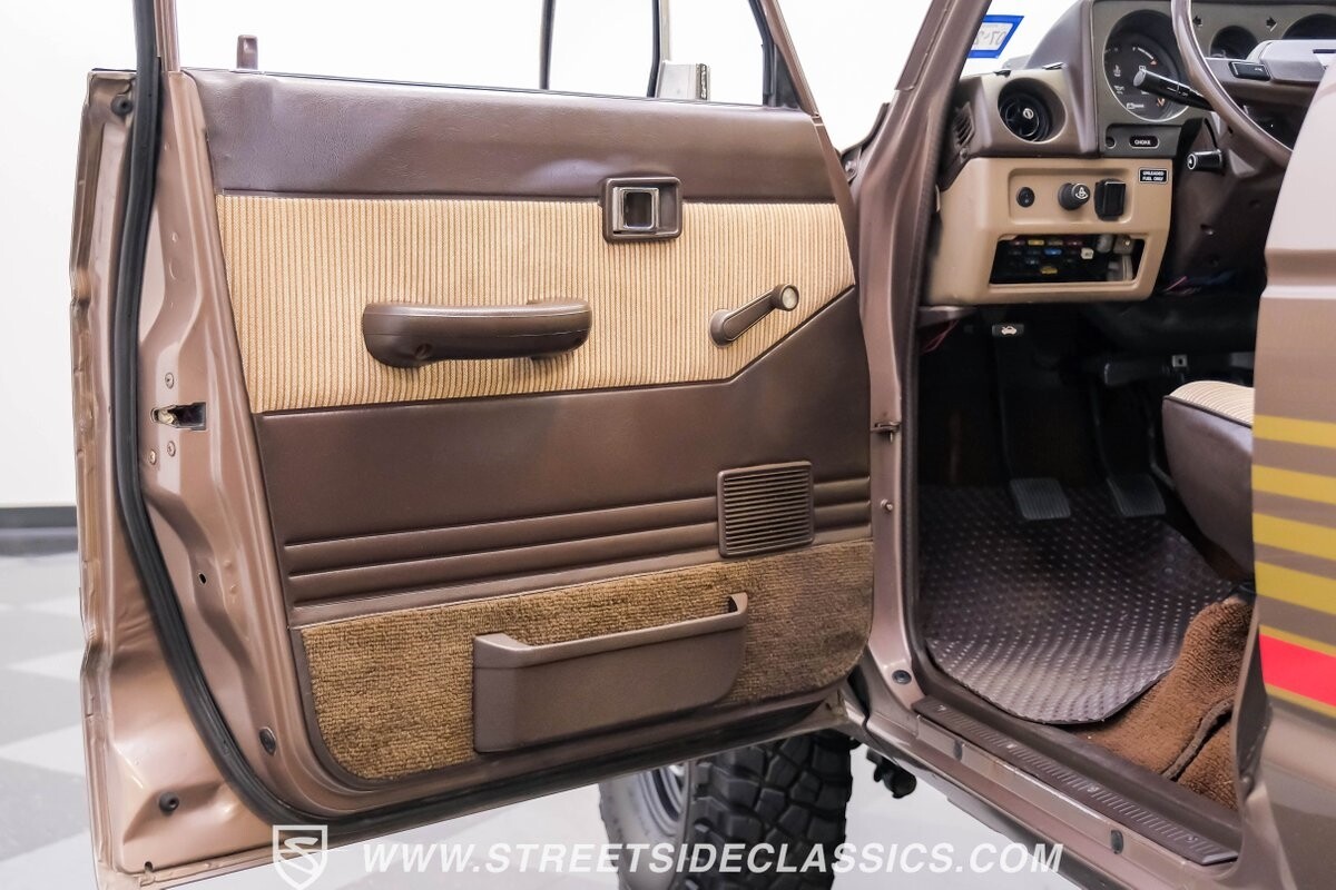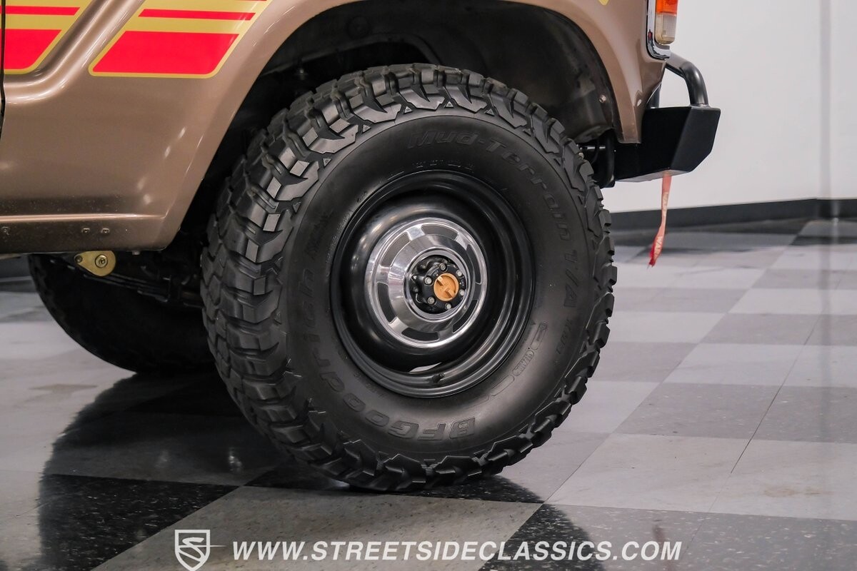 Steel 16-inch City Racer wheels are mounted with 255/85-16 BF Goodrich Mud-Terrain T/A KM2 tires and a matching spare is affixed to the swing-away rear carrier. The front axle is equipped with Aisin manually locking hubs and the truck rides on an Ironman Foam Cell suspension lift kit with Cool Cruiser HFS shackles. A Redhead steering gearbox has been fitted and the front disc and rear drum brakes were overhauled as part of the refurbishment. The front steering knuckles were rebuilt, and the tie rod ends were replaced in October 2021.