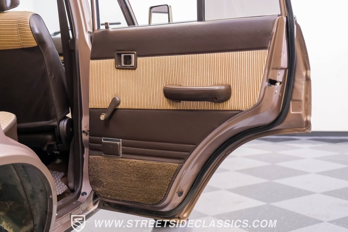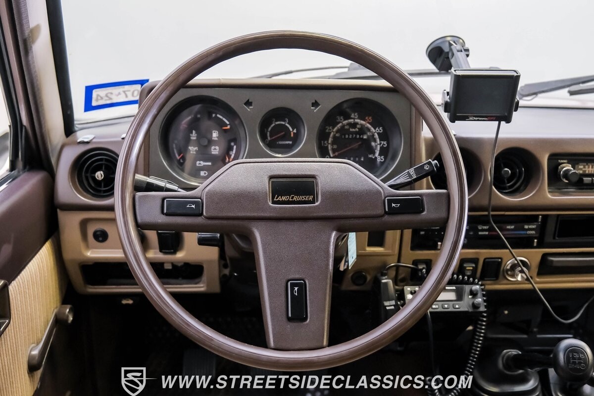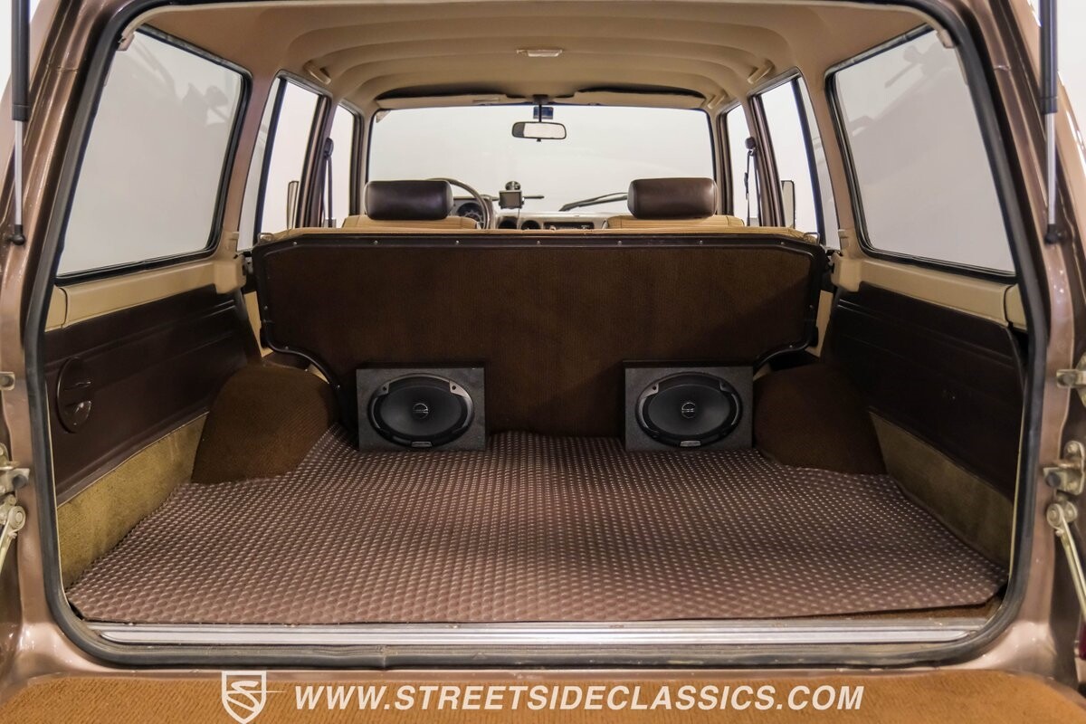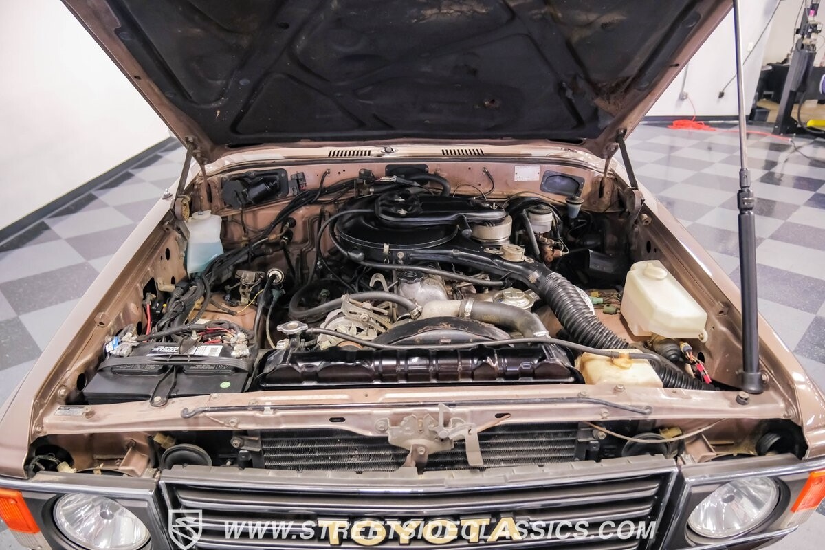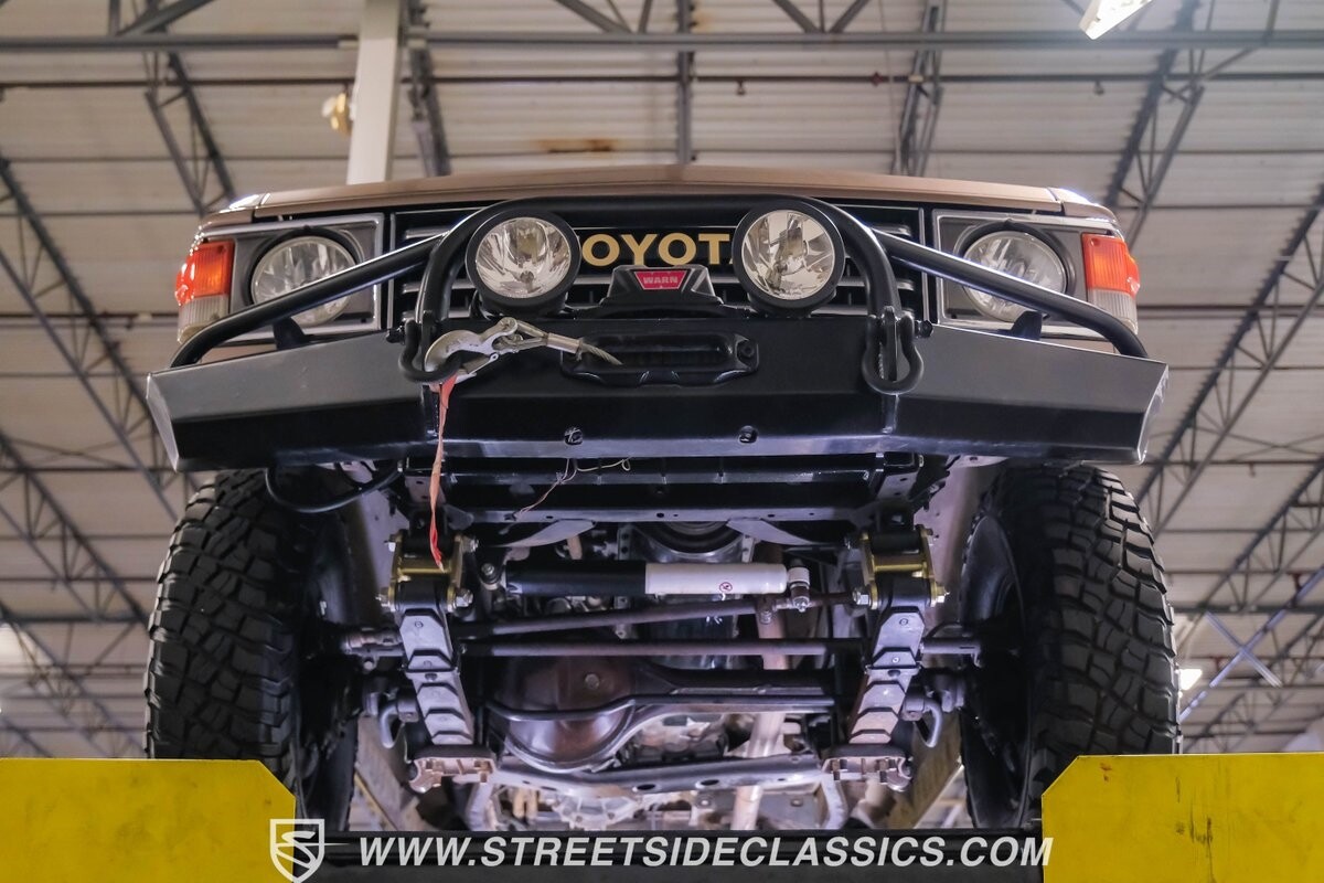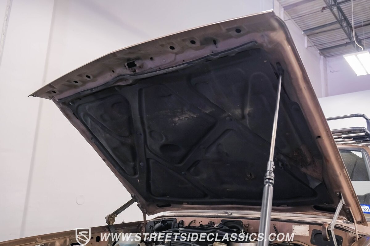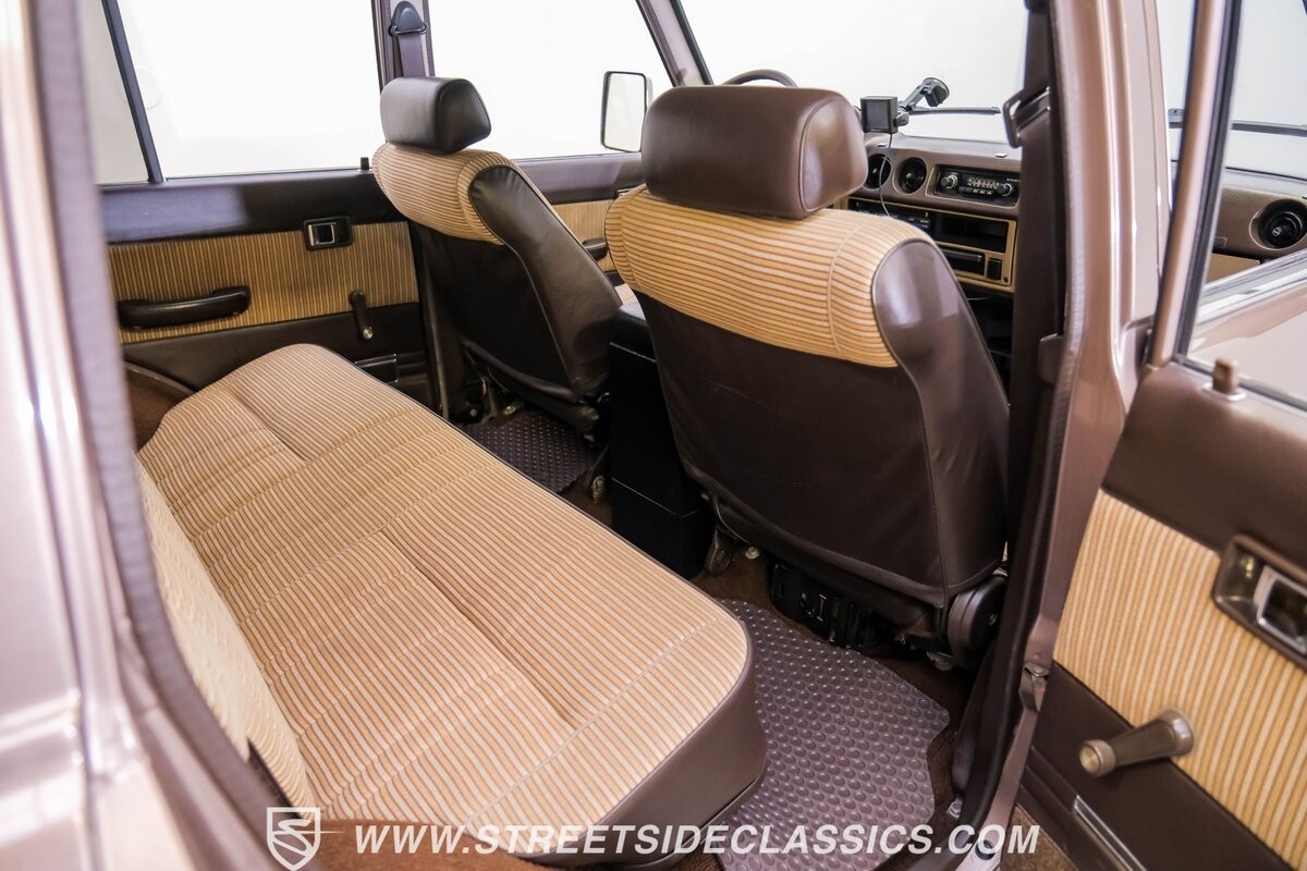 Steel 16-inch City Racer wheels are mounted with 255/85-16 BF Goodrich Mud-Terrain T/A KM2 tires and a matching spare is affixed to the swing-away rear carrier. The front axle is equipped with Aisin manually locking hubs and the truck rides on an Ironman Foam Cell suspension lift kit with Cool Cruiser HFS shackles. A Redhead steering gearbox has been fitted and the front disc and rear drum brakes were overhauled as part of the refurbishment. The front steering knuckles were rebuilt, and the tie rod ends were replaced in October 2021.