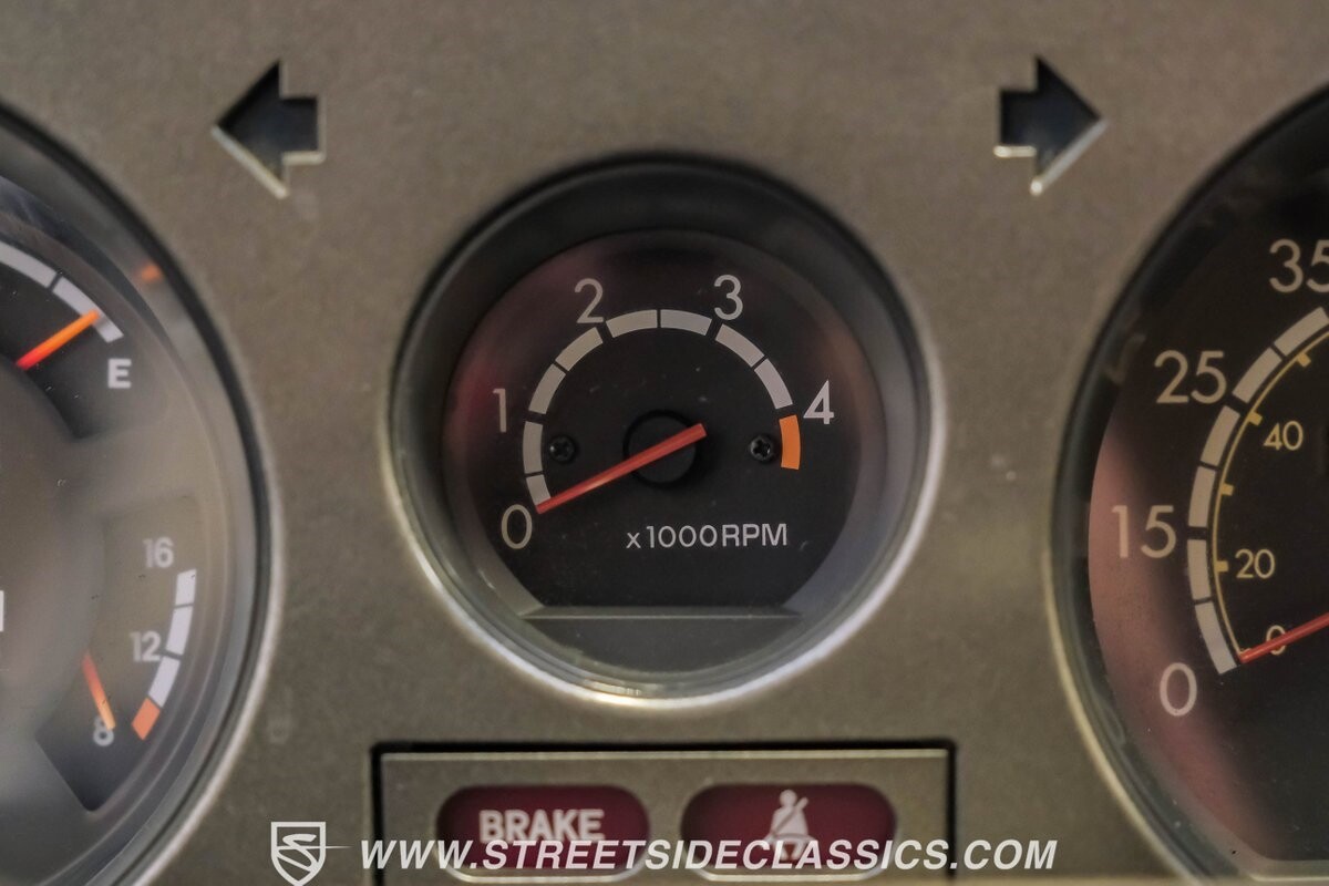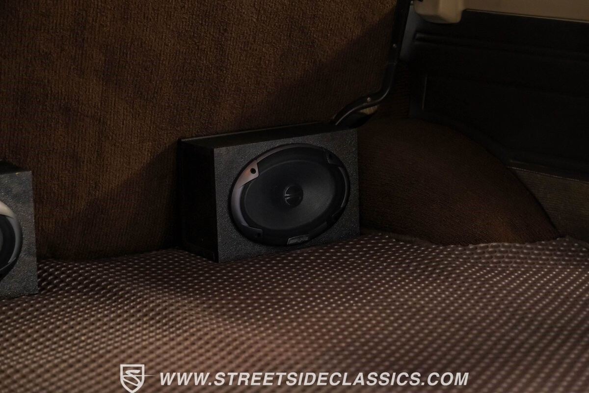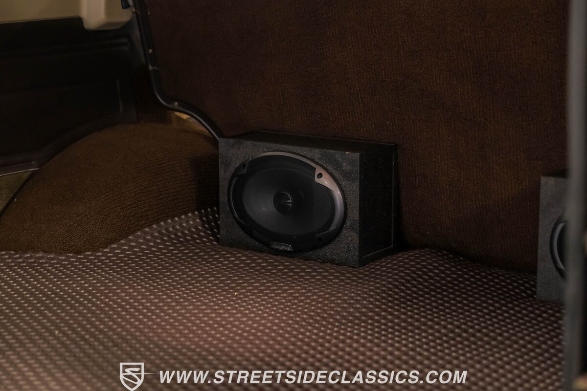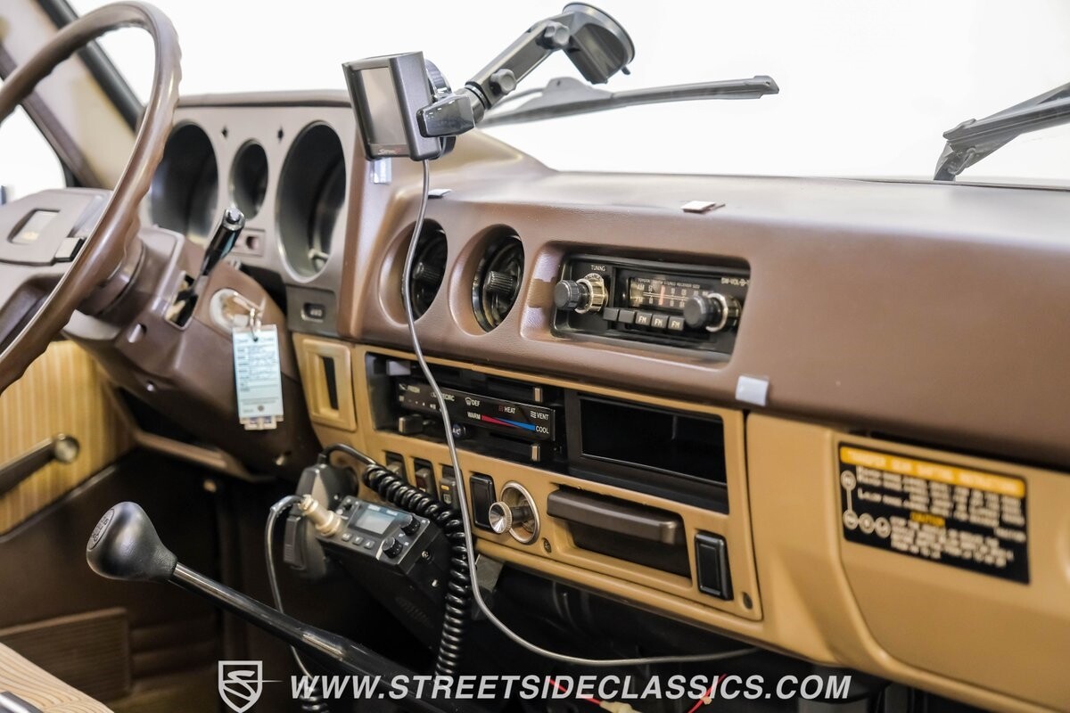 The front bucket seats and folding rear bench seat are upholstered in patterned tan cloth. Replacement carpets were installed, the seatbelts were refurbished and an Alpine Bluetooth-capable head unit was fitted inside of a Cool Cruiser lockable center console. Additional equipment includes a carpeted dash pad, a Uniden CB radio, Alpine speakers and rubberized floor mats. The air conditioning system was overhauled with modern freon in May 2023 and blows nice and cold. The three-spoke steering wheel frames an 85-mph-speedometer, a 4,500-rpm tachometer, and auxiliary gauges for coolant temperature, fuel level, oil pressure, and voltage. A Holley EFI module is mounted above the dashboard.