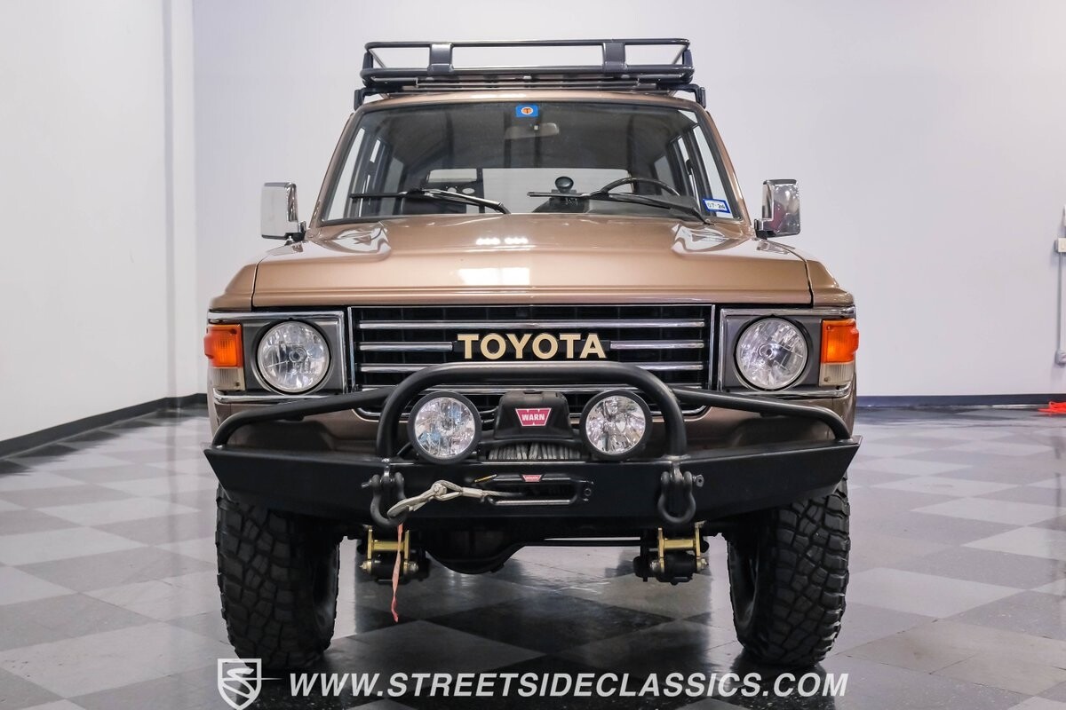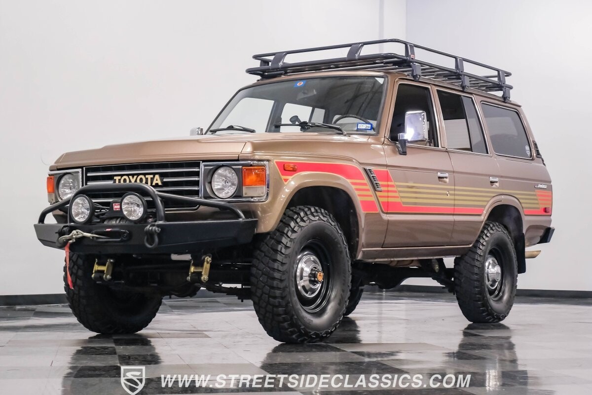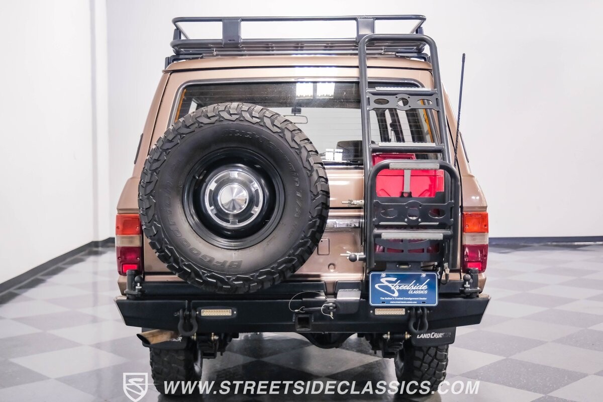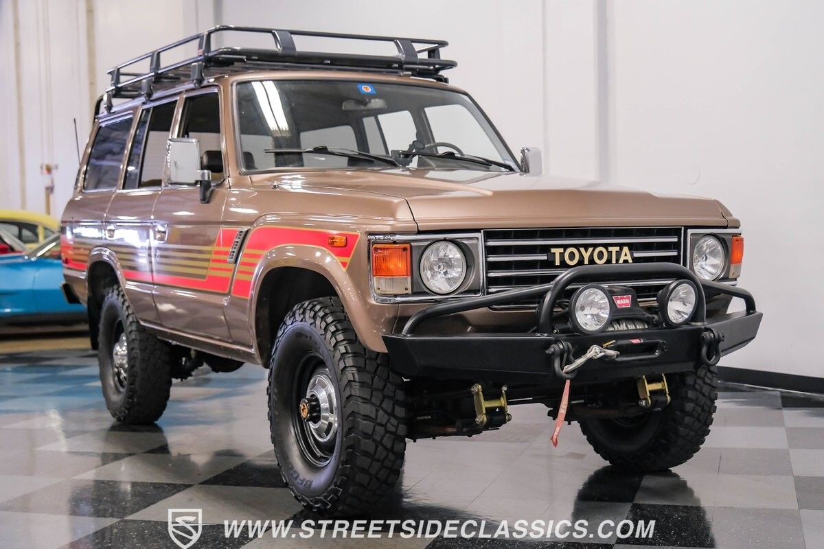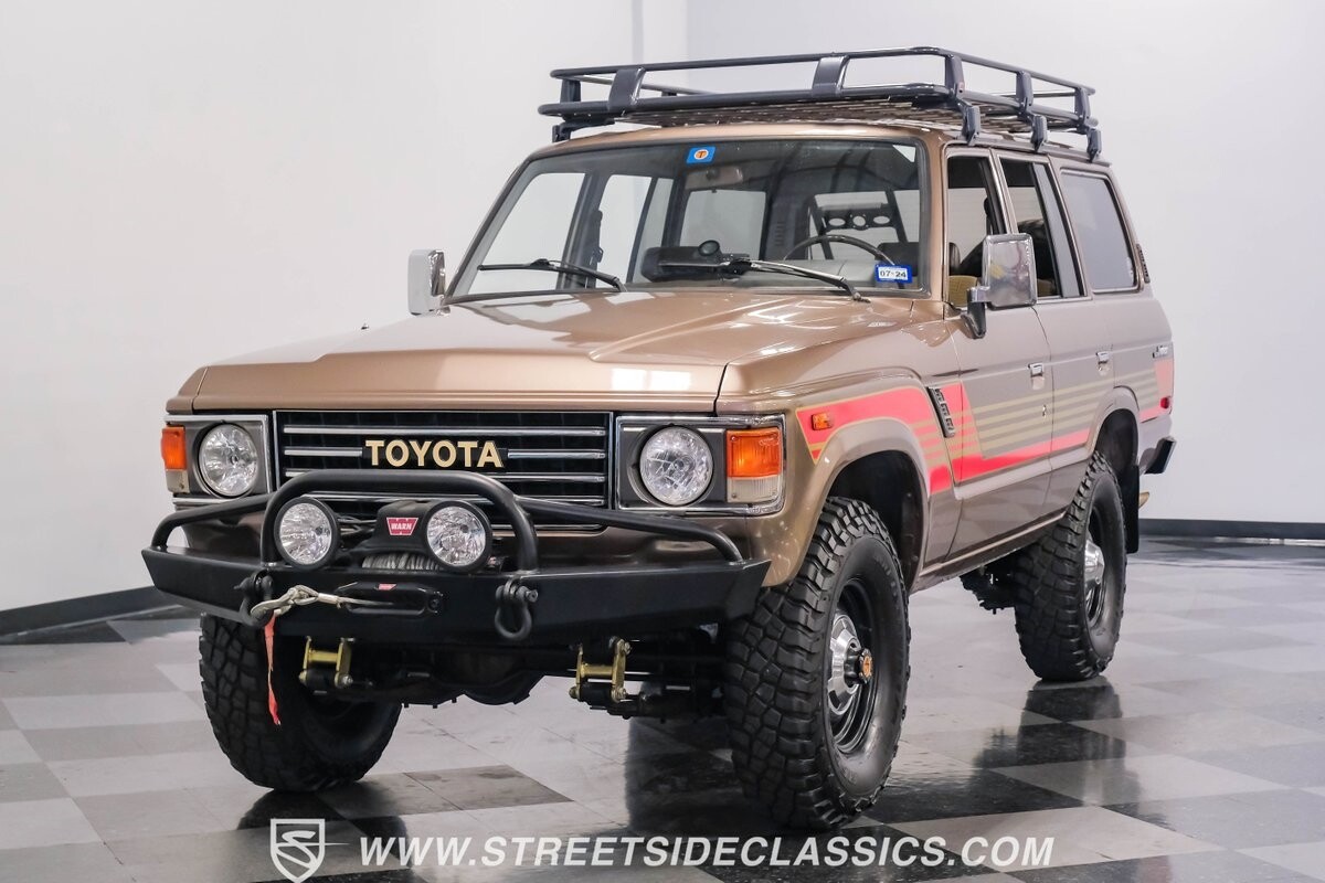 Finished from the factory in Beige Metallic (4E8), this attractive 1985 Toyota Landcruiser FJ60 was professionally repainted and vinyl graphics were applied to the body sides in June 2021. Details include a 4PlusProducts front bumper with a Warn winch and auxiliary driving lights in addition to an ARB roof rack, window tint film, and a 4PlusProducts Expedition rear bumper with a ladder, reverse lights, a receiver hitch and a jerrycan that has been modified for use as a storage container. The windshield and headlight washer tanks were also replaced as part of the refurbishment.