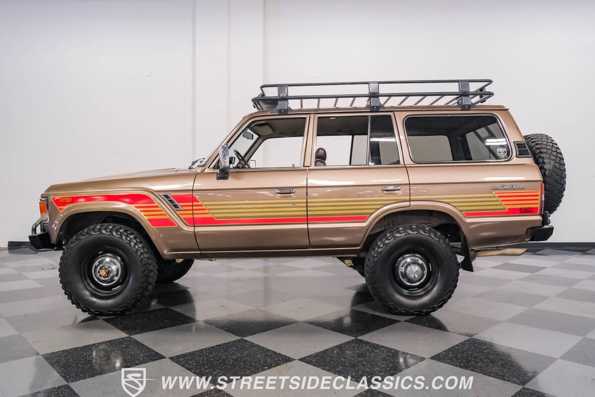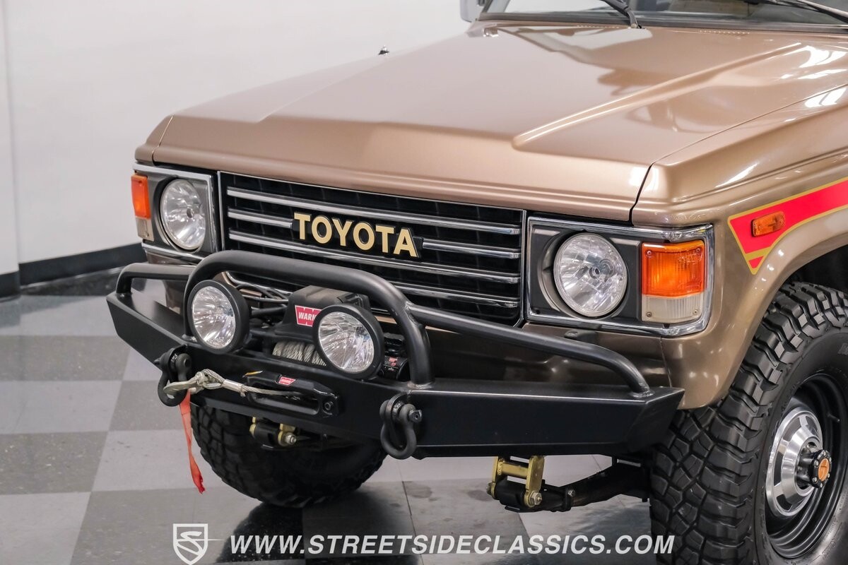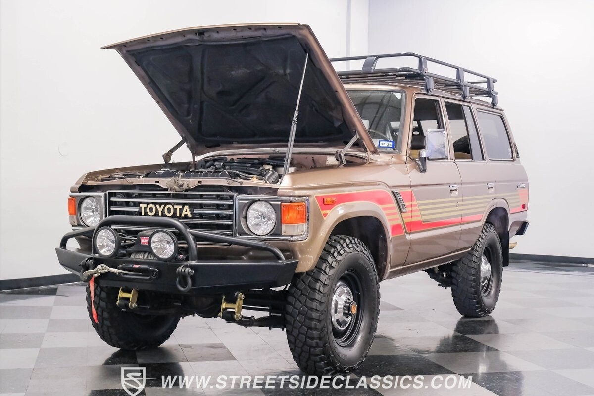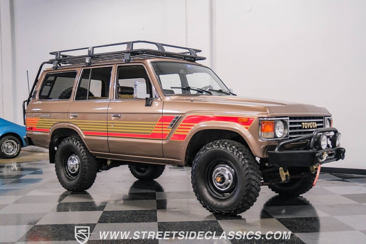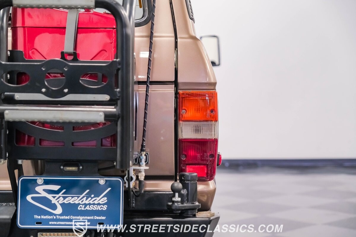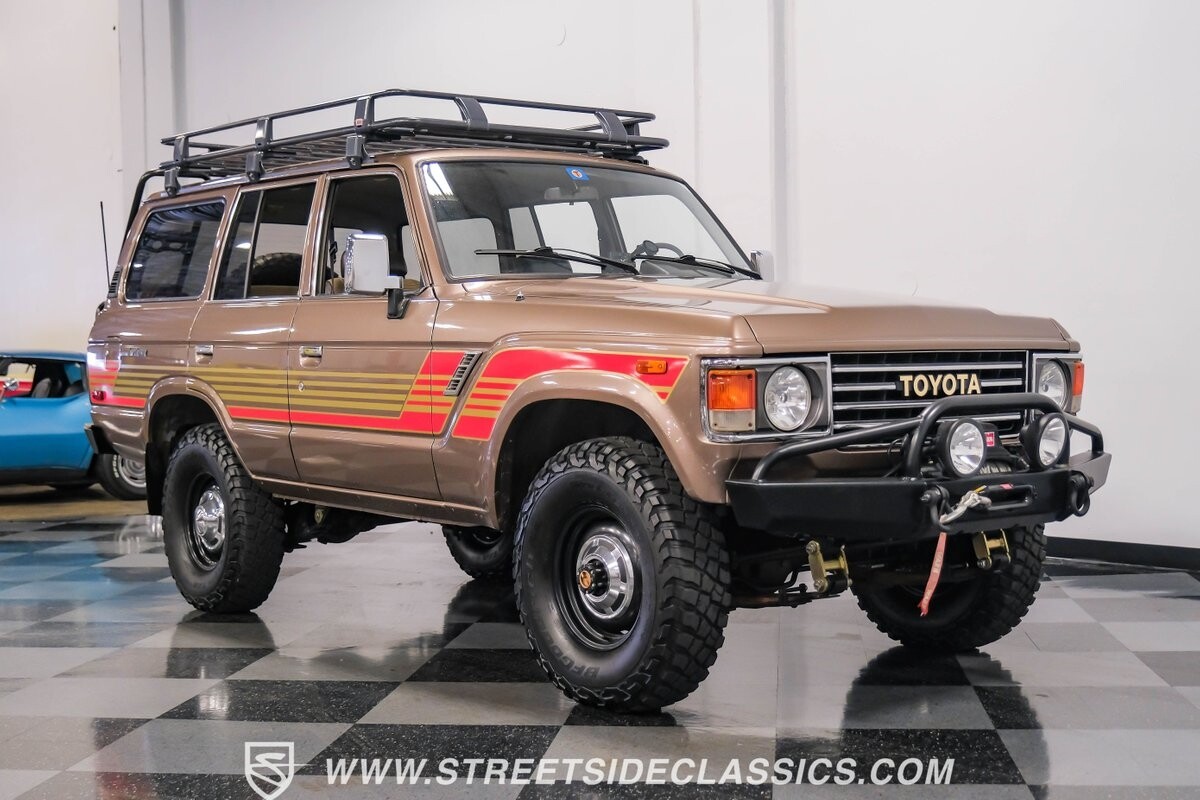 Finished from the factory in Beige Metallic (4E8), this attractive 1985 Toyota Landcruiser FJ60 was professionally repainted and vinyl graphics were applied to the body sides in June 2021. Details include a 4PlusProducts front bumper with a Warn winch and auxiliary driving lights in addition to an ARB roof rack, window tint film, and a 4PlusProducts Expedition rear bumper with a ladder, reverse lights, a receiver hitch and a jerrycan that has been modified for use as a storage container. The windshield and headlight washer tanks were also replaced as part of the refurbishment.