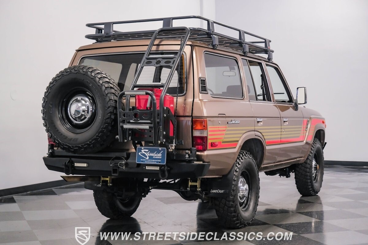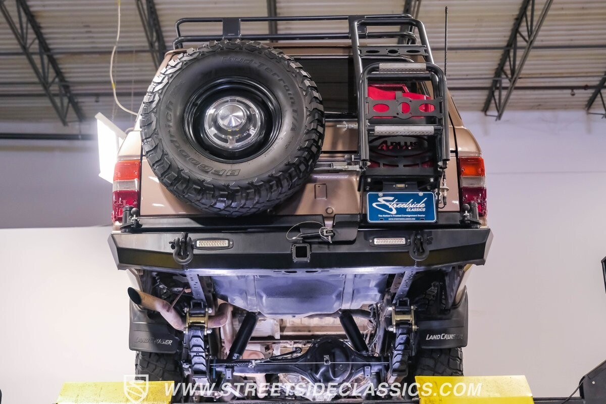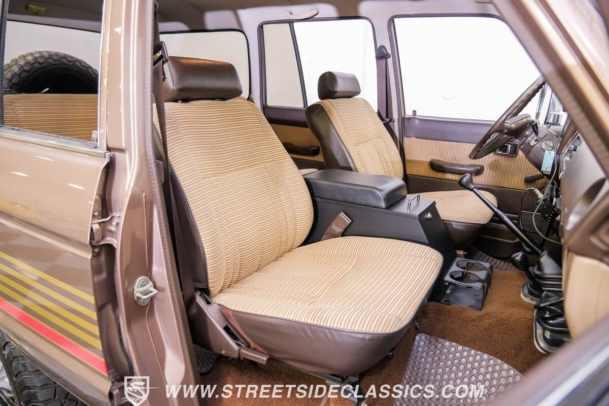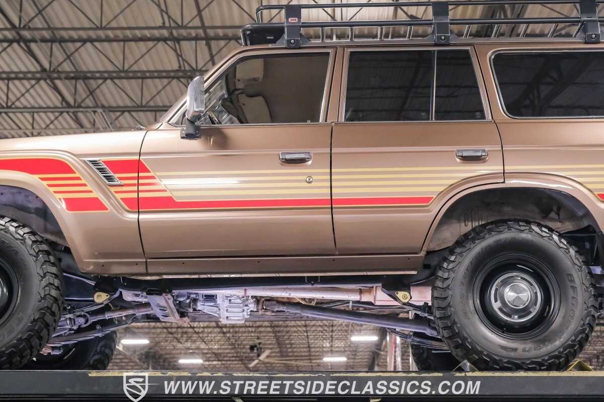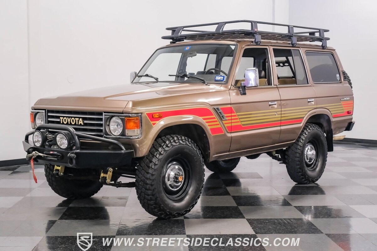Finished from the factory in Beige Metallic (4E8), this attractive 1985 Toyota Landcruiser FJ60 was professionally repainted and vinyl graphics were applied to the body sides in June 2021. Details include a 4PlusProducts front bumper with a Warn winch and auxiliary driving lights in addition to an ARB roof rack, window tint film, and a 4PlusProducts Expedition rear bumper with a ladder, reverse lights, a receiver hitch and a jerrycan that has been modified for use as a storage container. The windshield and headlight washer tanks were also replaced as part of the refurbishment.