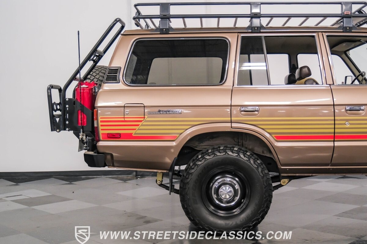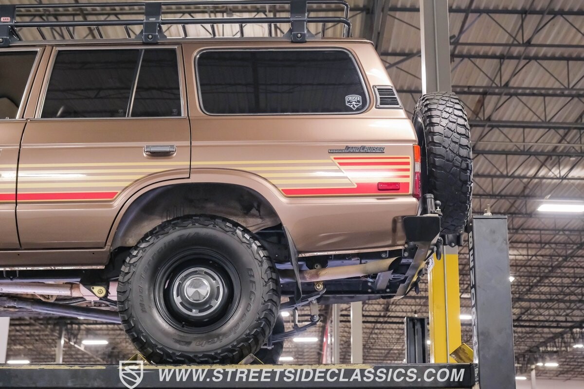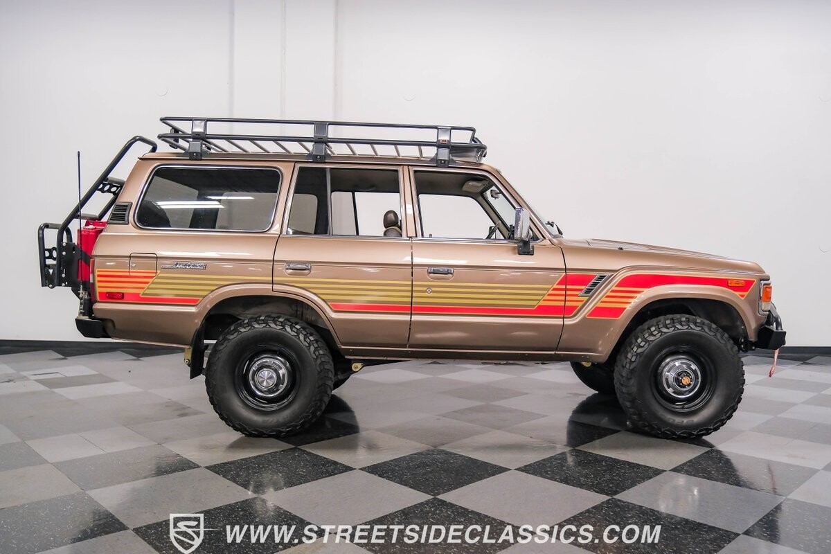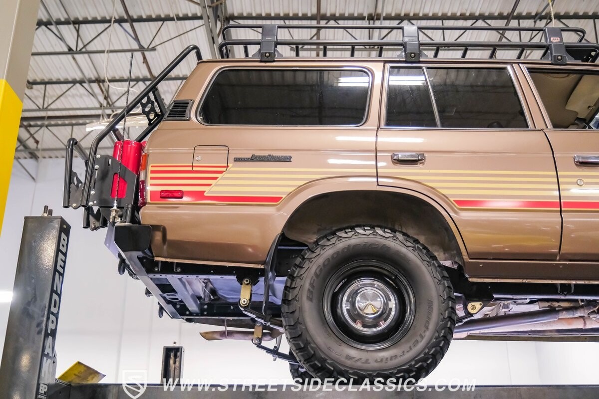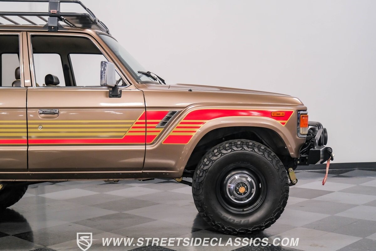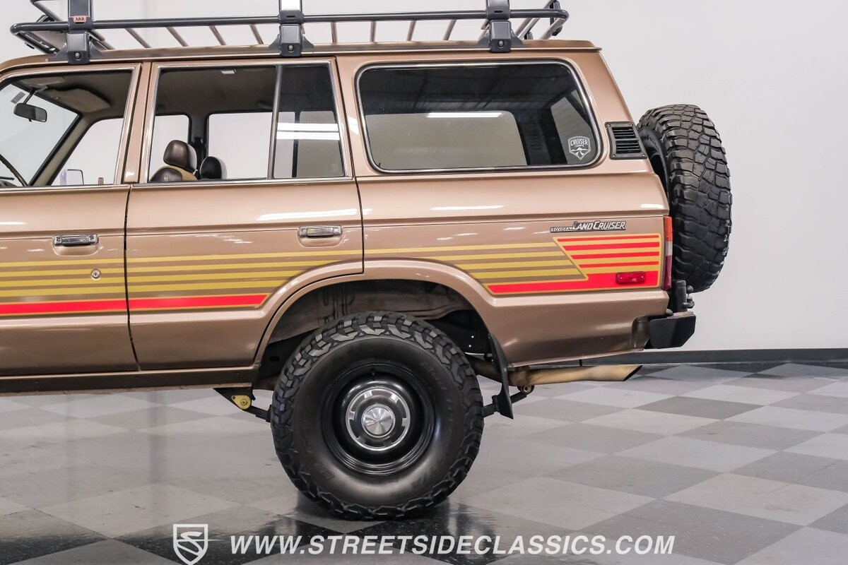 Finished from the factory in Beige Metallic (4E8), this attractive 1985 Toyota Landcruiser FJ60 was professionally repainted and vinyl graphics were applied to the body sides in June 2021. Details include a 4PlusProducts front bumper with a Warn winch and auxiliary driving lights in addition to an ARB roof rack, window tint film, and a 4PlusProducts Expedition rear bumper with a ladder, reverse lights, a receiver hitch and a jerrycan that has been modified for use as a storage container. The windshield and headlight washer tanks were also replaced as part of the refurbishment.