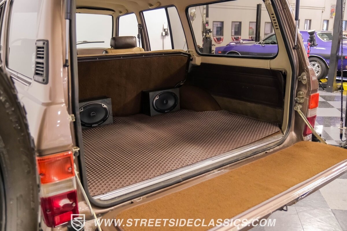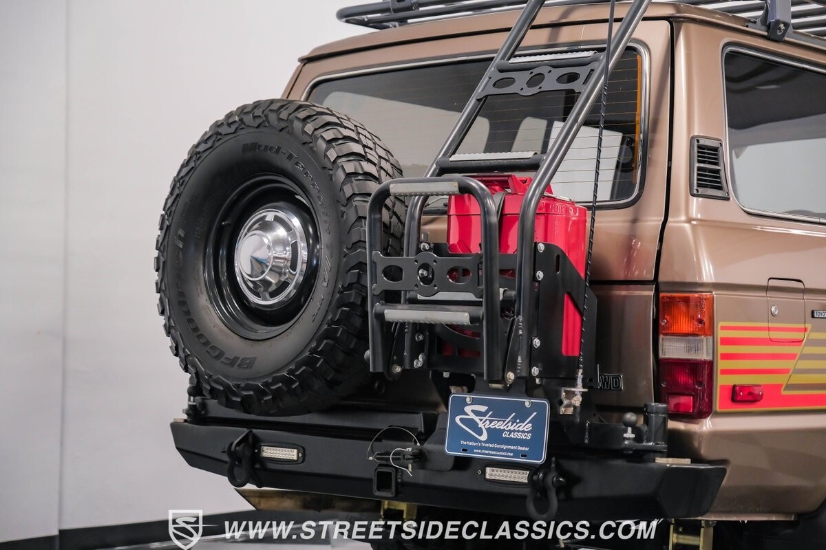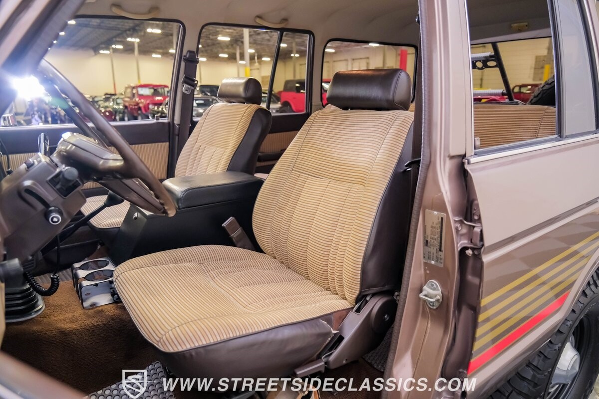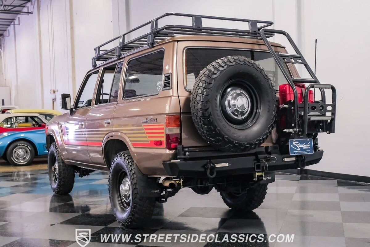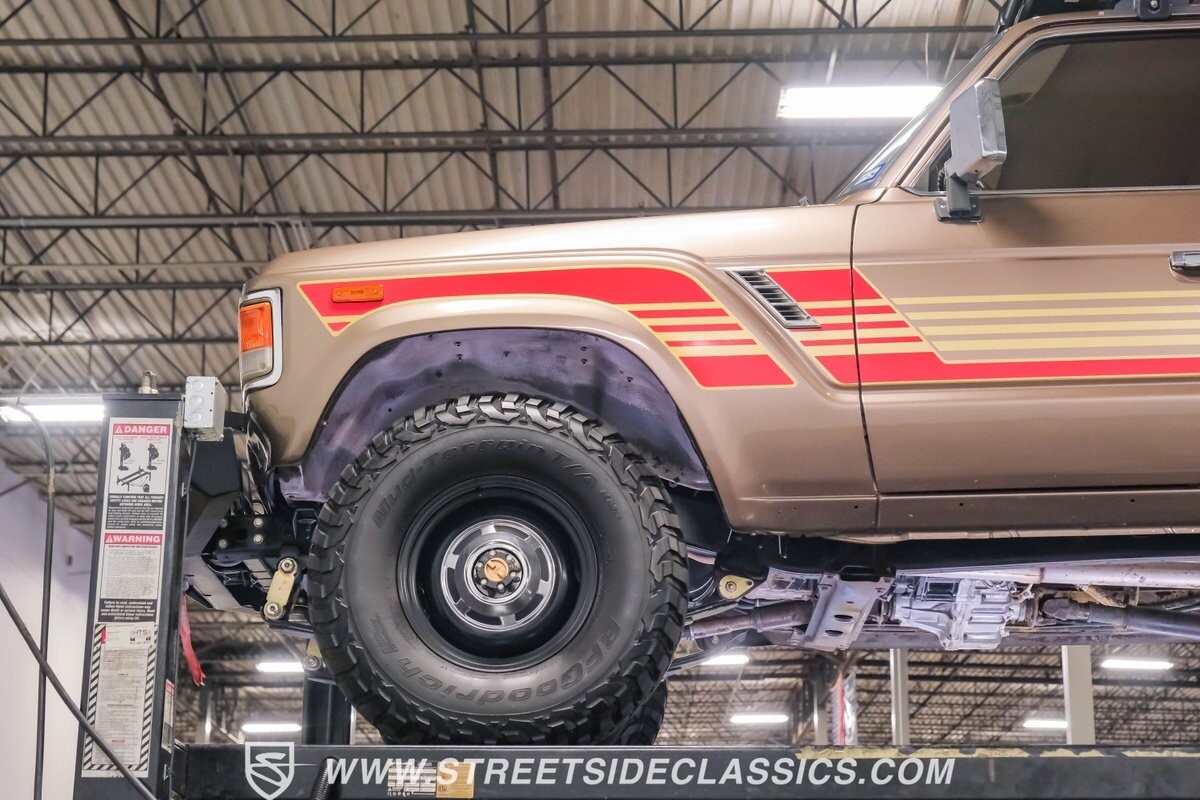 Finished from the factory in Beige Metallic (4E8), this attractive 1985 Toyota Landcruiser FJ60 was professionally repainted and vinyl graphics were applied to the body sides in June 2021. Details include a 4PlusProducts front bumper with a Warn winch and auxiliary driving lights in addition to an ARB roof rack, window tint film, and a 4PlusProducts Expedition rear bumper with a ladder, reverse lights, a receiver hitch and a jerrycan that has been modified for use as a storage container. The windshield and headlight washer tanks were also replaced as part of the refurbishment.