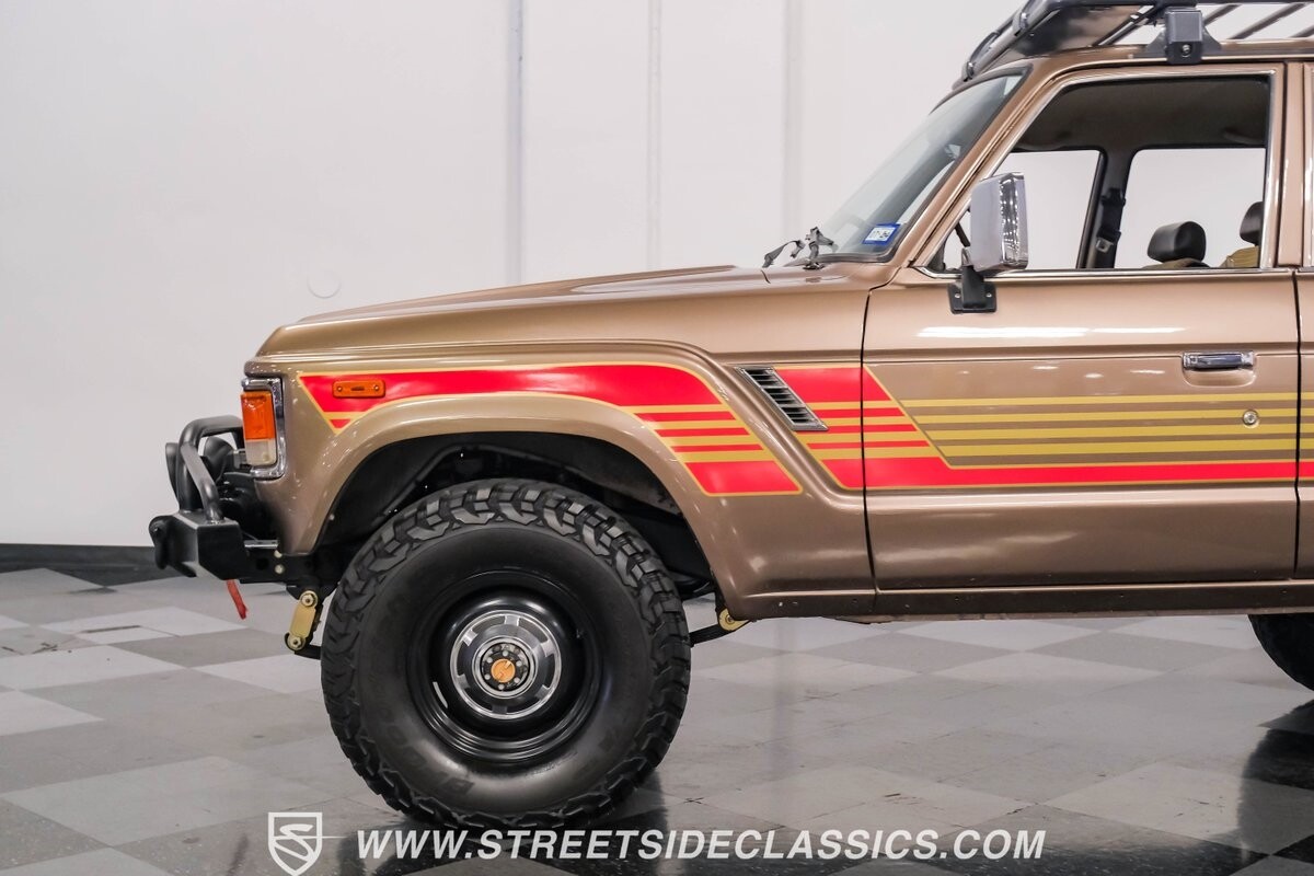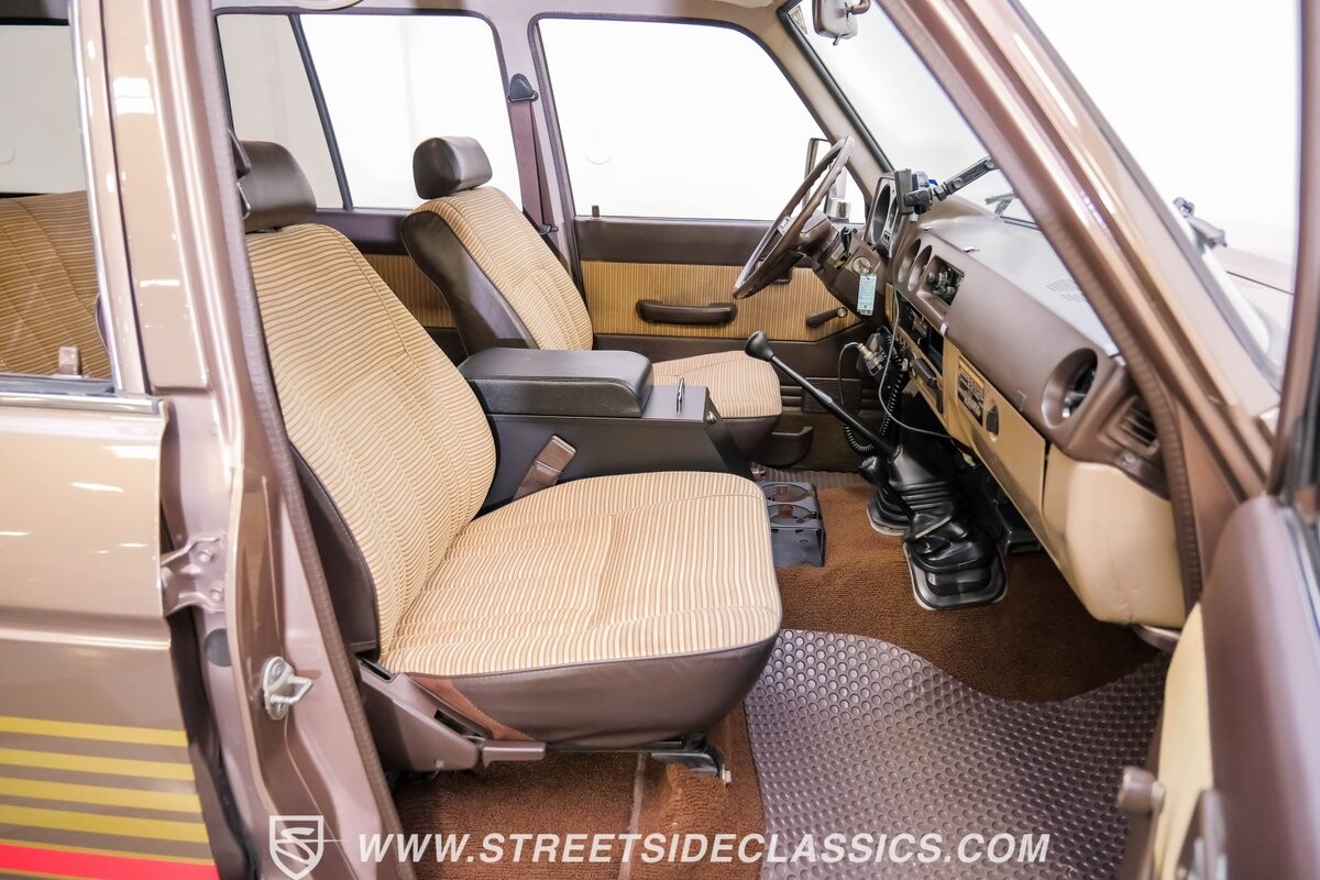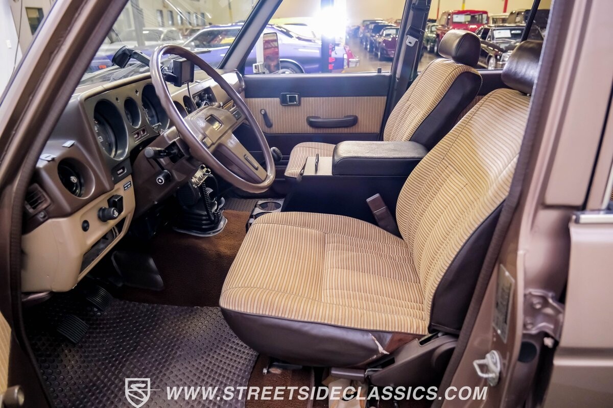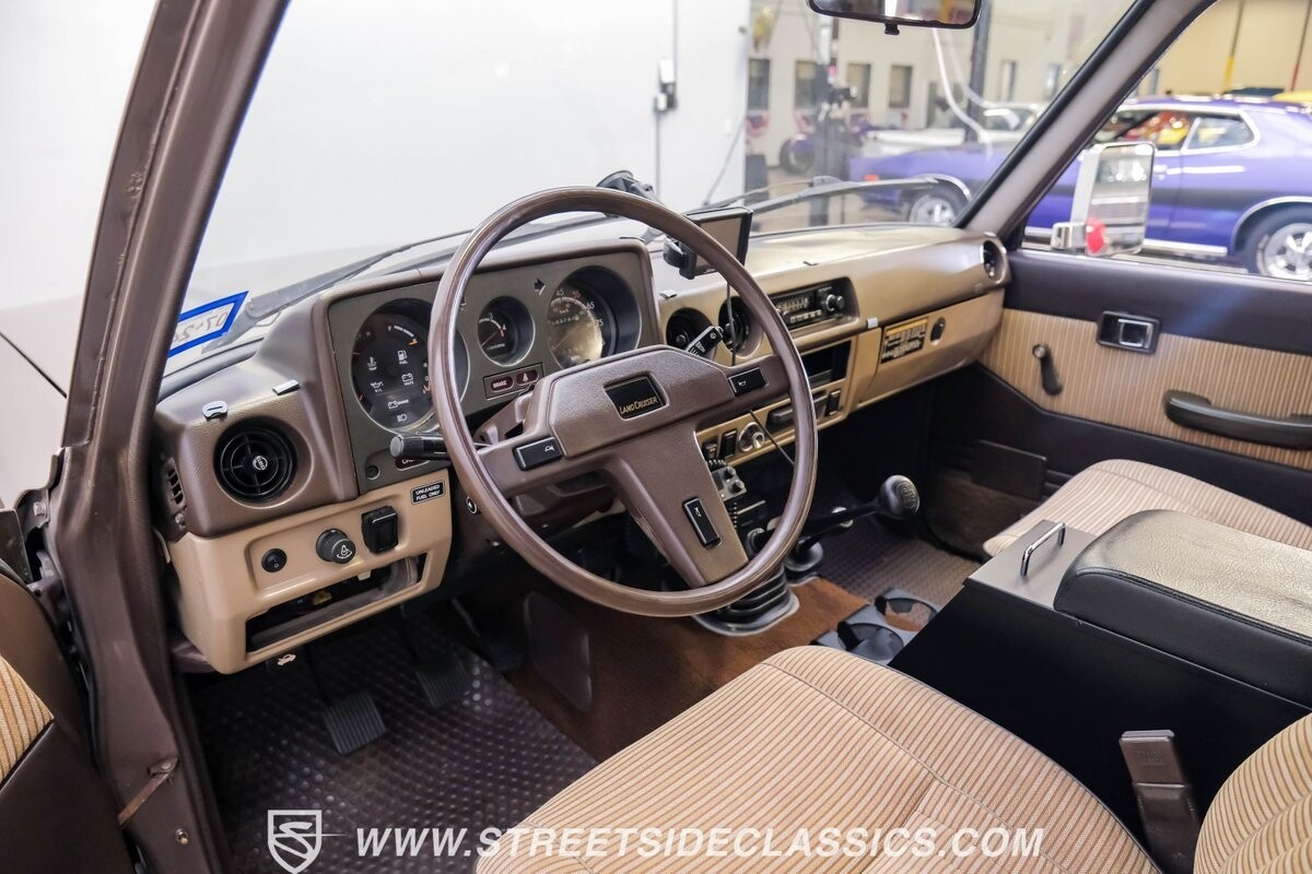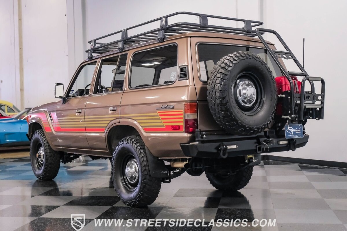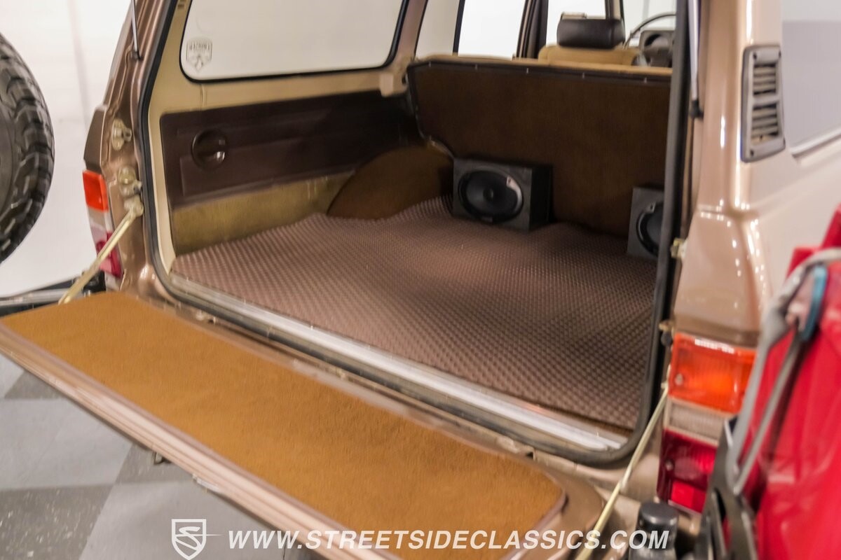 Finished from the factory in Beige Metallic (4E8), this attractive 1985 Toyota Landcruiser FJ60 was professionally repainted and vinyl graphics were applied to the body sides in June 2021. Details include a 4PlusProducts front bumper with a Warn winch and auxiliary driving lights in addition to an ARB roof rack, window tint film, and a 4PlusProducts Expedition rear bumper with a ladder, reverse lights, a receiver hitch and a jerrycan that has been modified for use as a storage container. The windshield and headlight washer tanks were also replaced as part of the refurbishment.