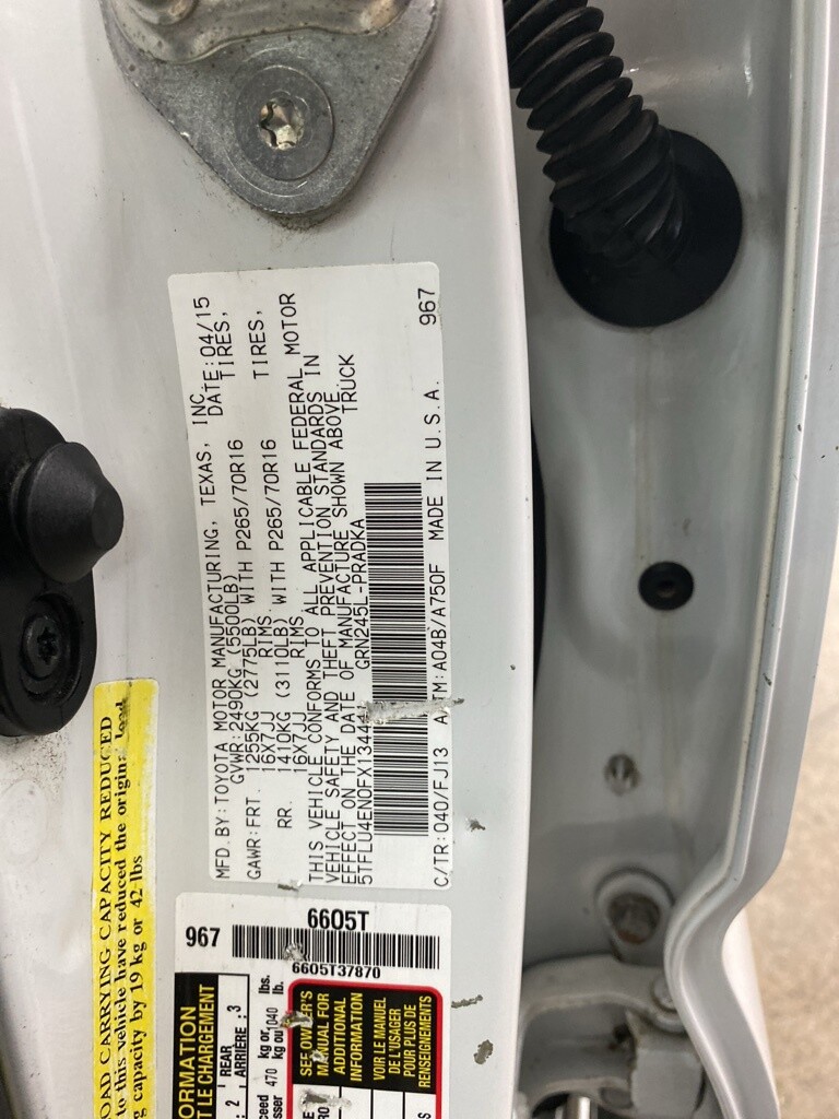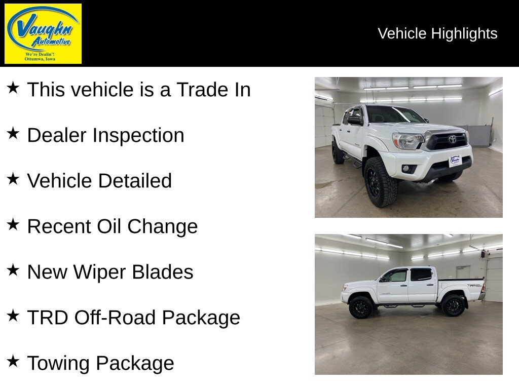 This vehicle is a Trade In, Dealer Inspection, Vehicle Detailed, Recent Oil Change, New Wiper Blades, 4WD, Graphite w/Cloth Seat Trim (YM), 115V/400W Deck Powerpoint, 130 Amp Alternator, 16 Alloy Wheels, 6 Speakers, 7-Pin Connector w/Converter, Active Traction Control (A-TRAC), Bilstein Shocks, Chrome Grille Surround & Rear Bumper, Class IV Hitch, Color-Keyed Front Bumper & Overfenders, Cruise Control, Dual Sunvisors w/Mirrors & Extenders, Electronic Stability Control, Fabric Seat Trim (FJ), Front Fog Lamps, Front Tow Hook, HD Radio, a Heavy-Duty Battery for those cold mornings, Locking Rear Differential, Metallic Tone Instrument Panel Trim, Off Road Tuned Suspension, Radio: Entune Audio Plus, Remote Keyless Entry System, SiriusXM Satellite Radio, Sliding Rear Window, Sport Seats, Supplemental Oil Cooler, Tailgate-Handle Integrated Backup Camera, Towing Package, Trailer Sway Control, TRD Off-Road Graphics, TRD Off-Road Package, Variable Speed Wipers. 4.0L V6 EFI DOHC 24V White 2015 Toyota Tacoma