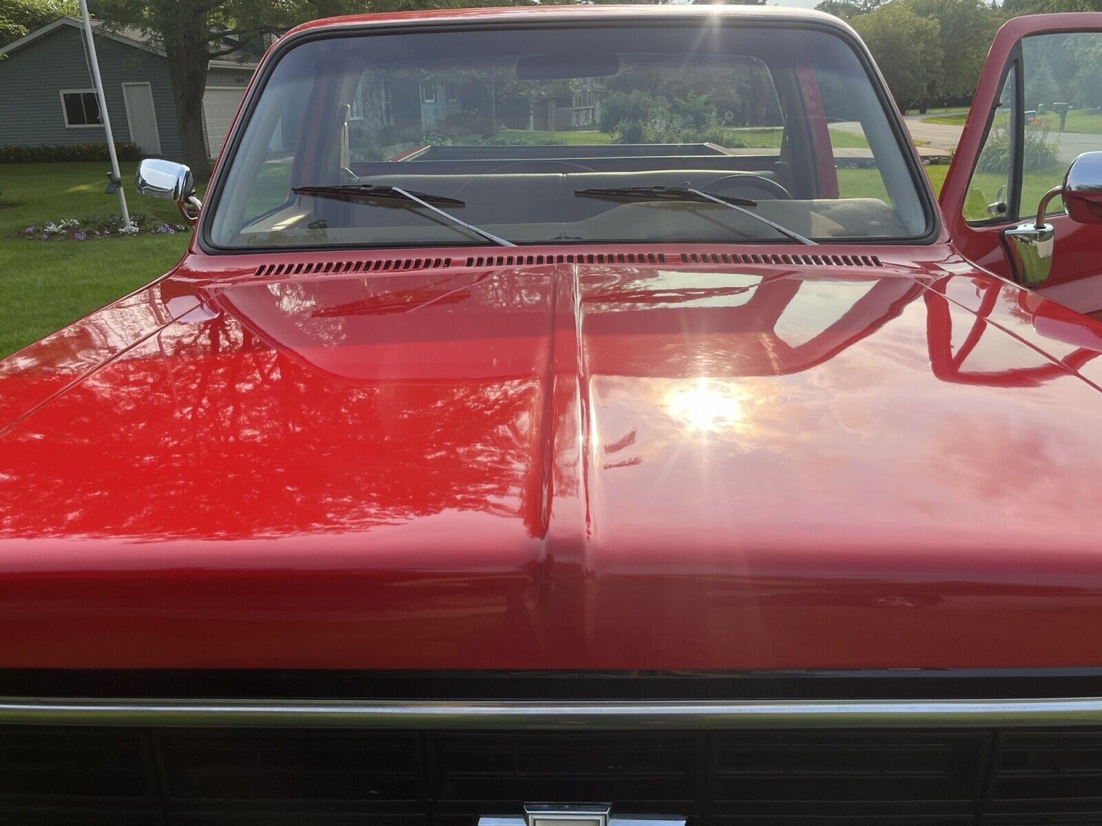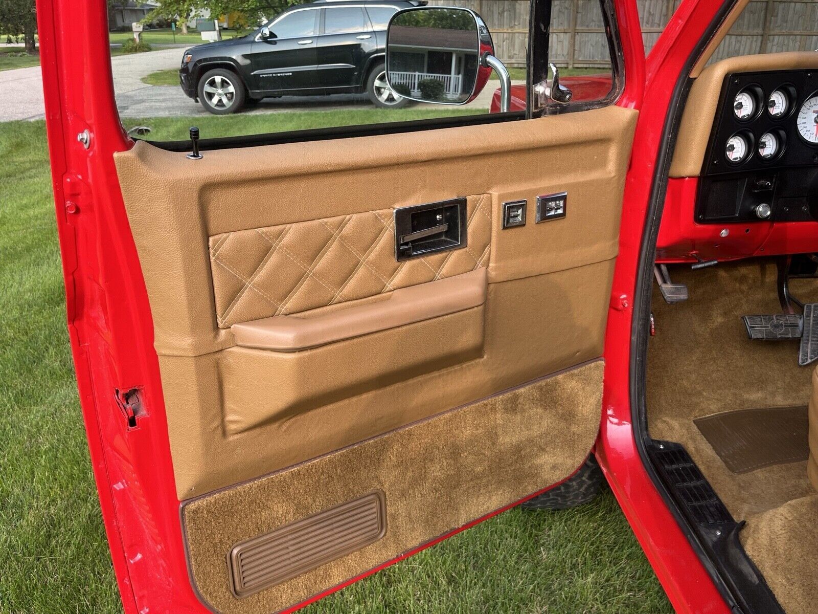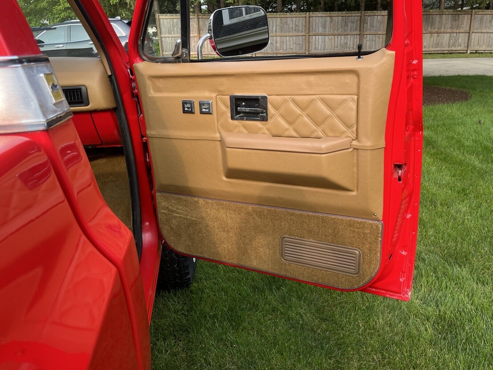 The truck is bright red and has a lovely coustum tan interior that is all premium peanut butter vinyl. The dash is padded and wrapped to match the seat the door cards are wrapped also in the same vinyl. the headliner is a lovely perforated vinyl in the same color. The whole interior is brand new the gauges are new glow shift gauges that has a gps speedometer. the stereo is a retro sound that has a nice factory look with all the features of a new radio. This is a Silverado so it has power windows and power locks