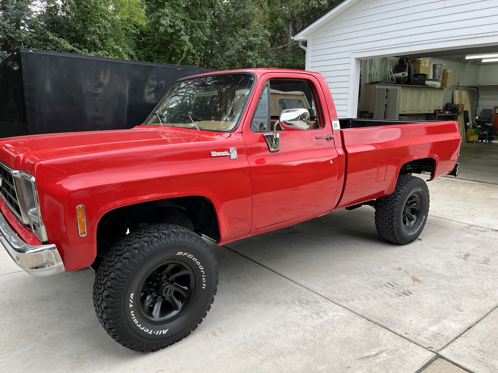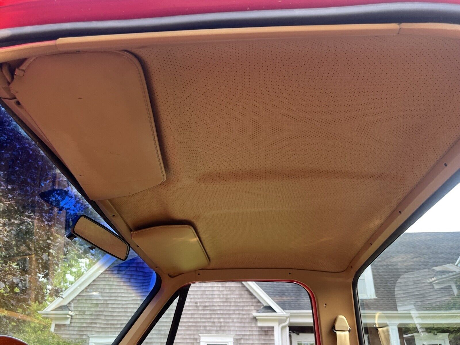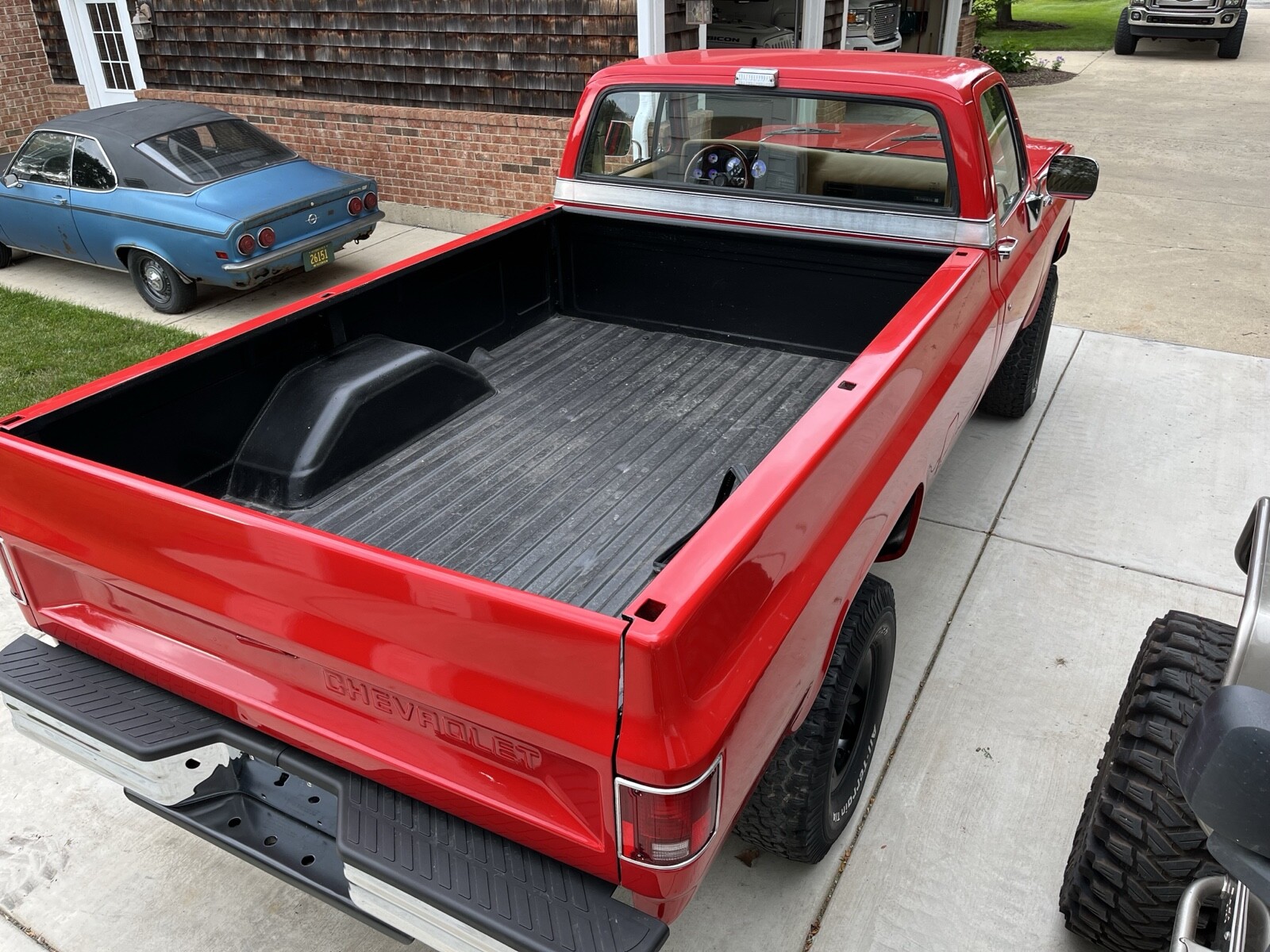 The truck is bright red and has a lovely coustum tan interior that is all premium peanut butter vinyl. The dash is padded and wrapped to match the seat the door cards are wrapped also in the same vinyl. the headliner is a lovely perforated vinyl in the same color. The whole interior is brand new the gauges are new glow shift gauges that has a gps speedometer. the stereo is a retro sound that has a nice factory look with all the features of a new radio. This is a Silverado so it has power windows and power locks